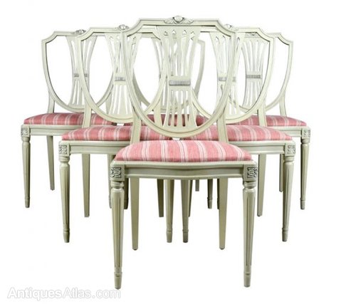 6 Vintage later C20th Swedish Gustavian Dining Chairs in a grey paint detailed legs and shield backs in good structural condition.C1970-1990