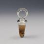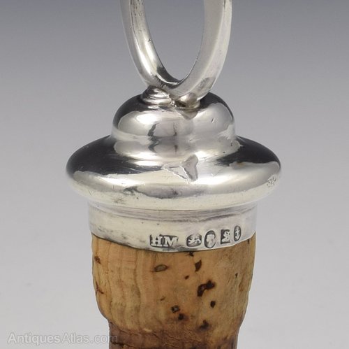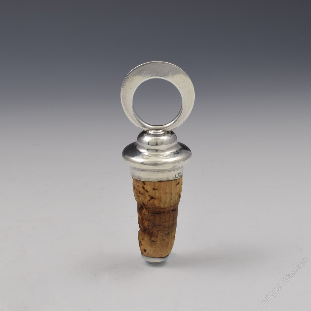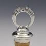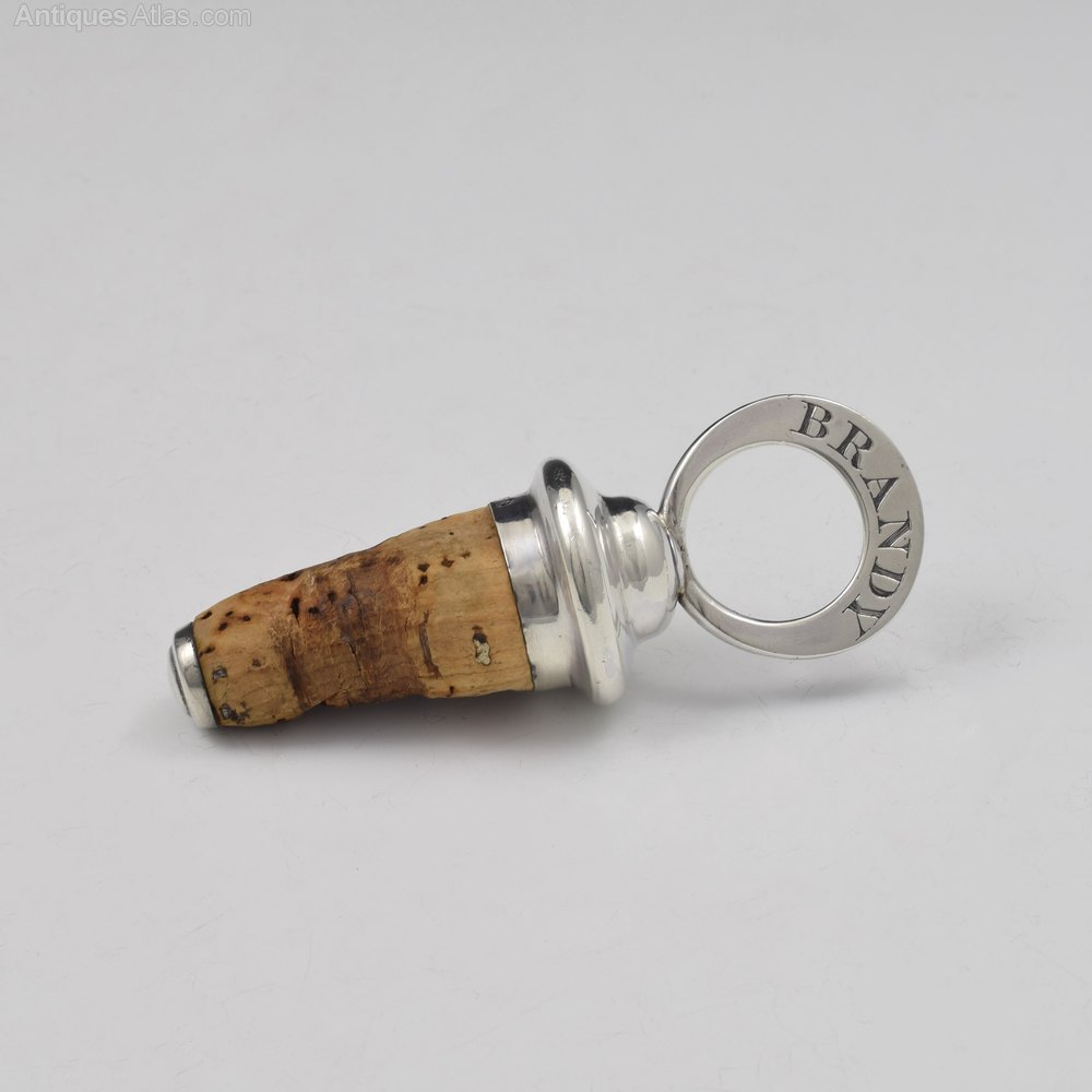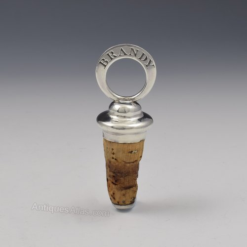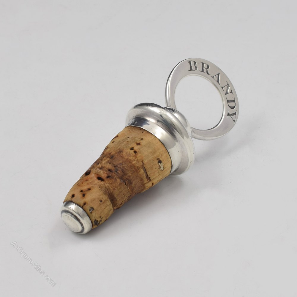 An unusual silver mounted cork bottle / decanter stopper with a circular ring finial engraved "Brandy" to one side. The silver runs through the cork secured with a silver disc at the base. Hallmarked for Birmingham 1841, maker Henry Manton.It measures 9cm (3 1/2") high and 3.1cm (1 1/4") wide and the stopper and 2.5cm (1") wide at the top of the stopper section in terms of bottle / decanter neck size as the maximum suitable size for practical use. A good gauge of silver it weighs 30g.