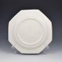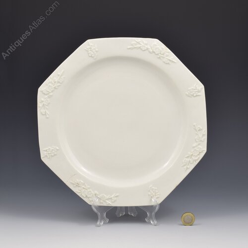 An unusually large Bow blanc-de-chine porcelain octagonal plate with Chinese type applied moulded prunus blossom sprigs. Unmarked, c.1750-1755.It measures 28.5cm (11 1/4") wide (side to side, 30.3cm (11 7/8") across the diagonal) and 2.5cm (1") high.