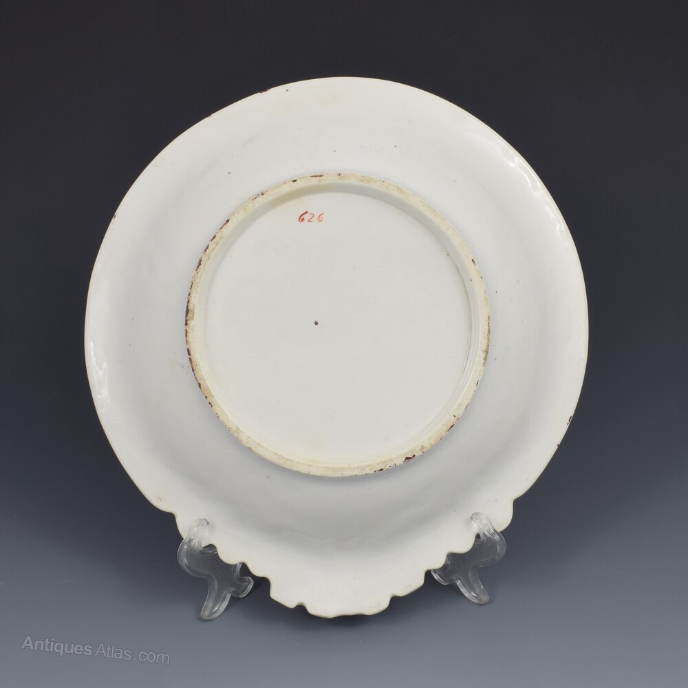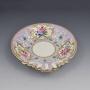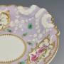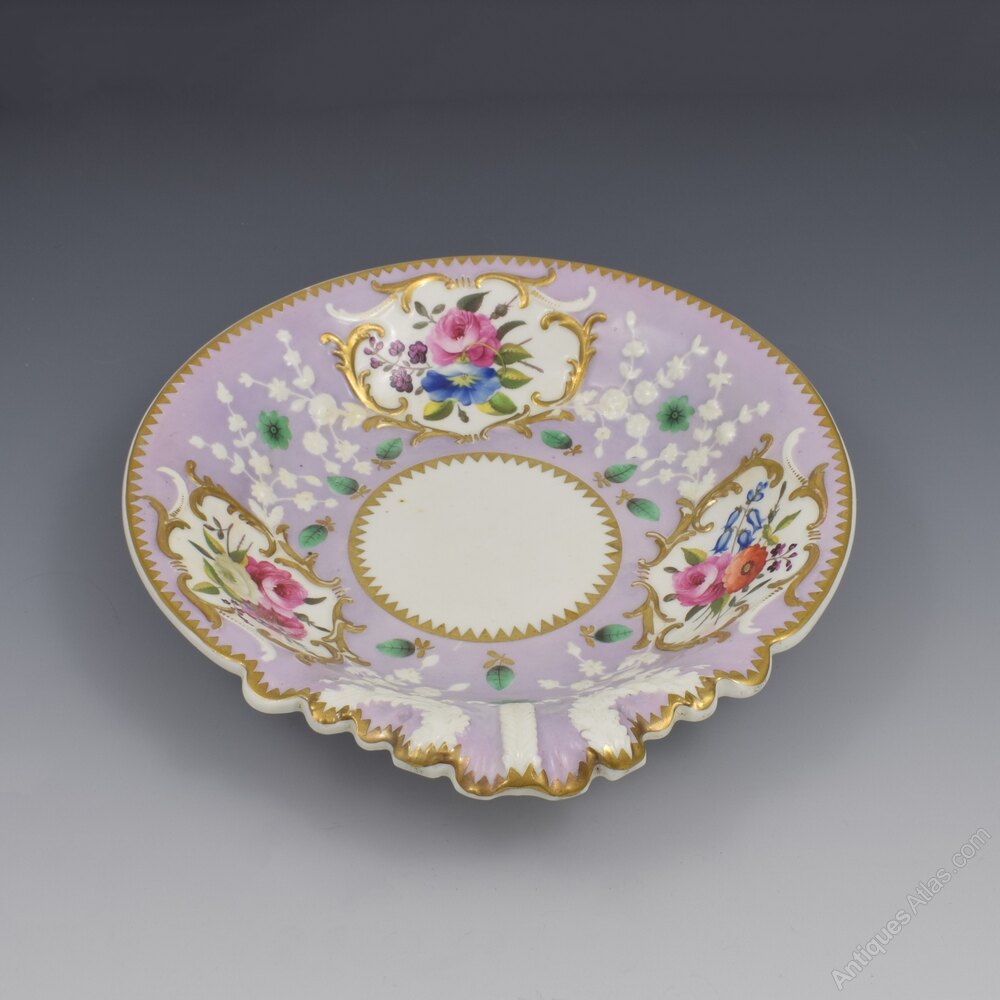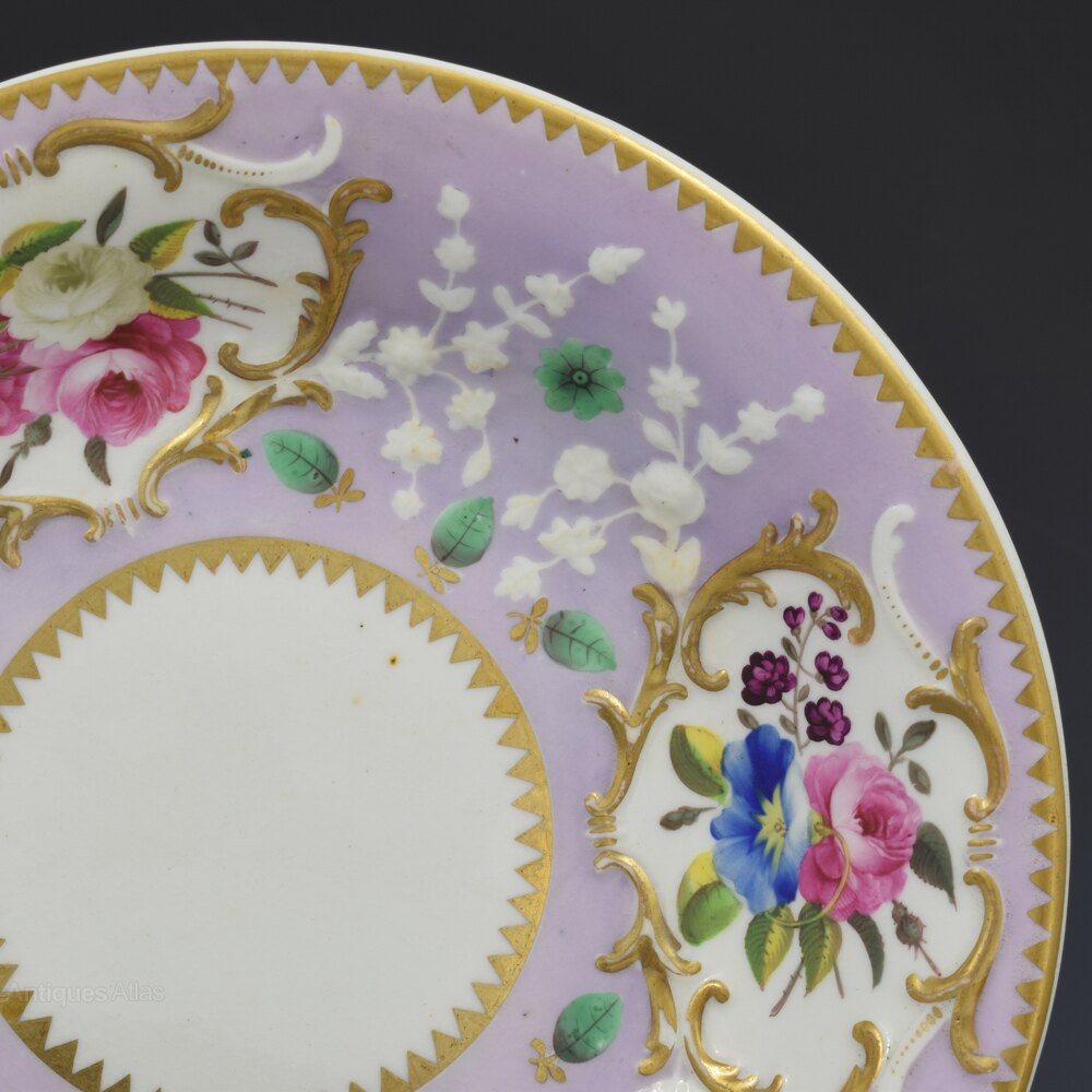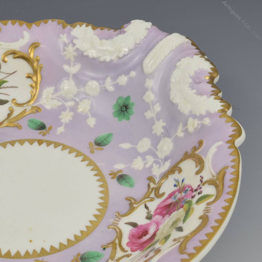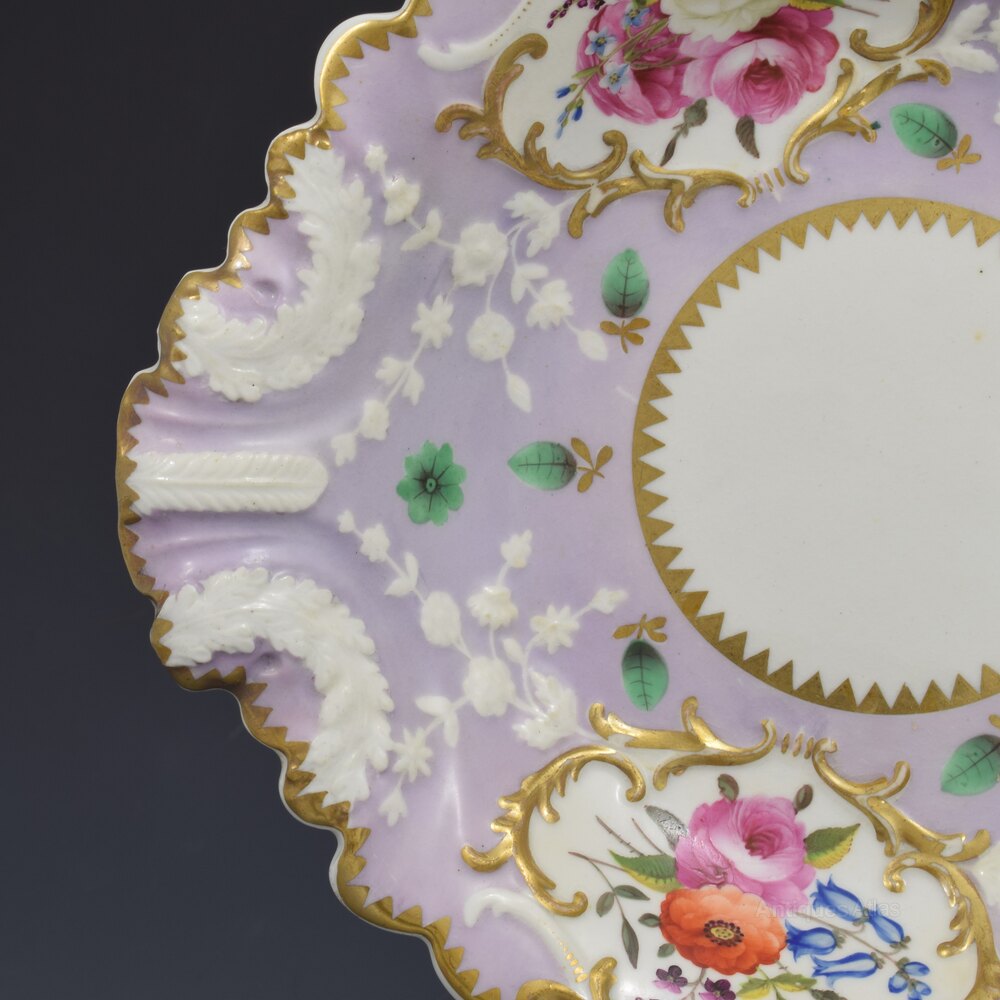 A striking and unusual English porcelain dessert dish with a predominantly circular shape ending with a shaped handle with fluting to the body and ornate, very detailed, relief moulded decoration of a pair of curved acanthus leaves with a long feather in between. Coloured in a rare lilac enamel ground, the relief moulding reserved in white and further relief moulded decoration runs around the walls, branched floral sprays reserved in white and scroll framed cartouches partially edged in gilt. Each of these cartouches is well painted with a spray of garden flowers in bright enamels. Small green and black shaded flowers and leaves are set into the lilac ground with gilded leaves and the central reserve and rim are finished with sawtooth gilding. Red pattern number 626 to the reverse, thought to be Ridgway, c.1815.It measures 21.3cm (8 3/8") by 29.9cm (9") wide and 4.5cm (1 3/4") high.