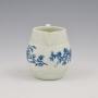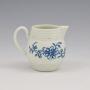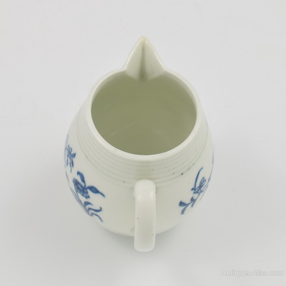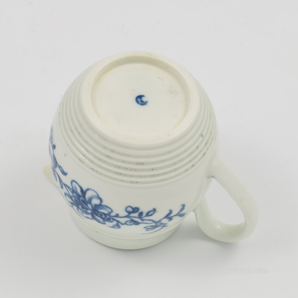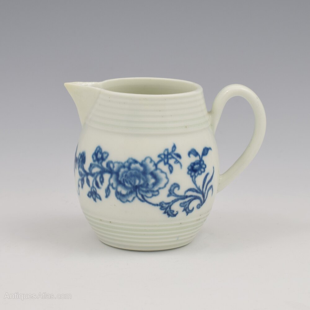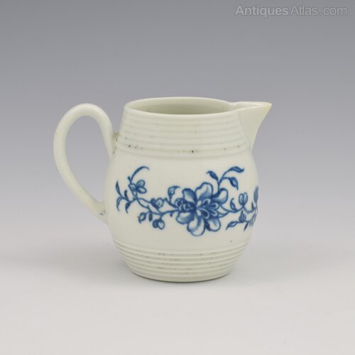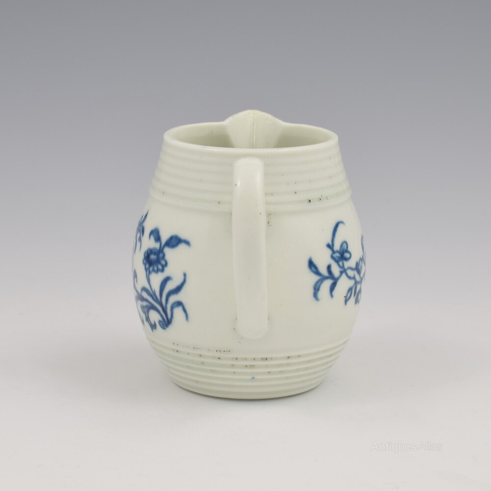 A lovely Worcester porcelain barrel shaped cream jug with sections of horizontal ribbing around the foot and rim. Printed with the "Early Peony Print", c.1758-1760, crescent mark to base.Reference: Worcester Blue & White Porcelain, Branyan, French & Sandon, section II.C.4, described as "very rare". Careful observation of the markings and kiln dust spots it appears this jug is the actual one illustrated. We have not come across another documented example.