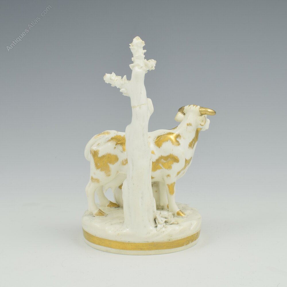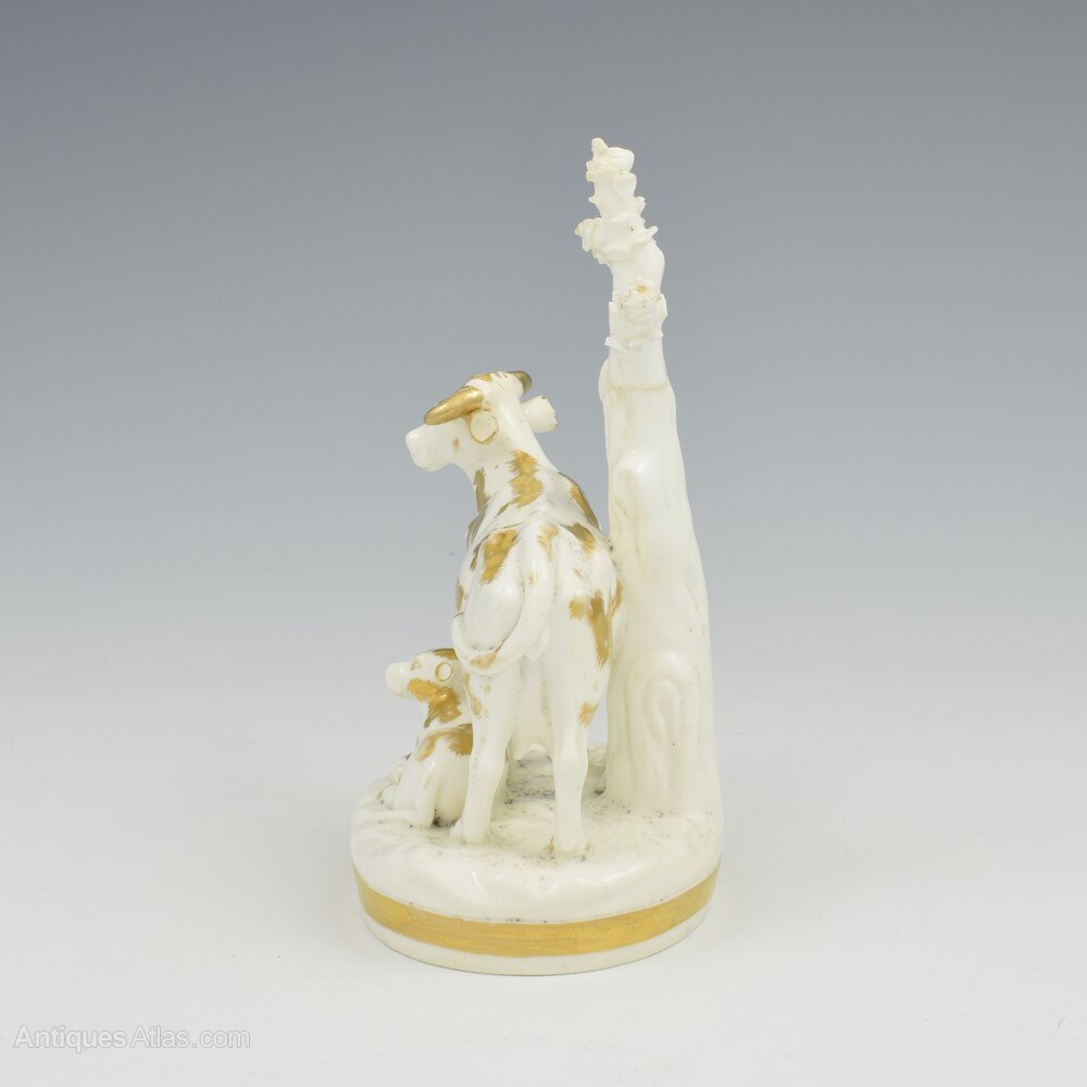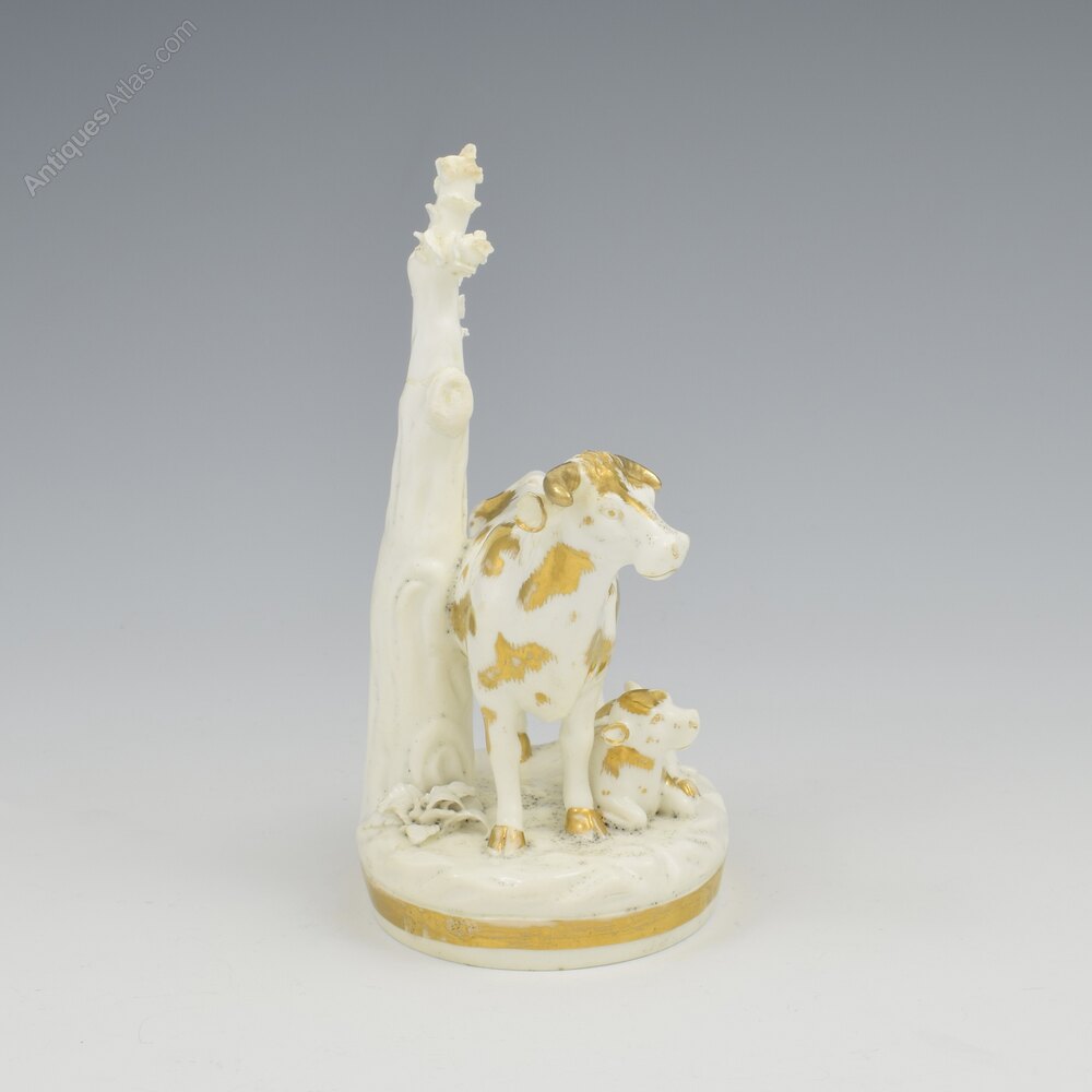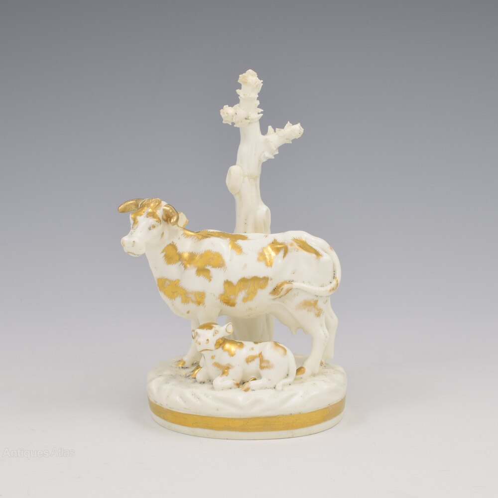 A very sweet early 19th century Derby porcelain figure group of a cow and calf, decorated in gilt. Standing on an oval base with gilt band with a simple bocage behind. The calf is curled up at its mother's feet. Red painted Bloor mark, c.1830.It measures 15cm (5 7/8") high, 10cm (3 7/8") long and 7cm (2 3/4") deep.