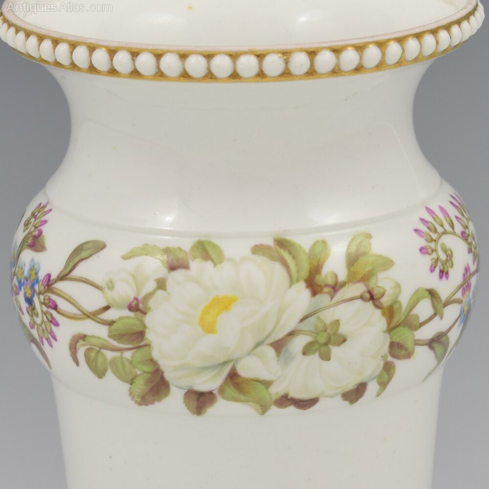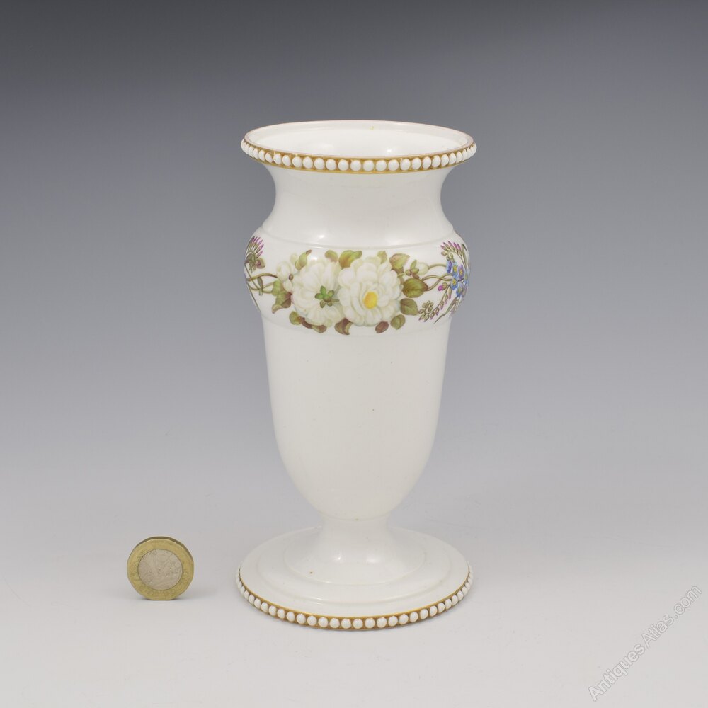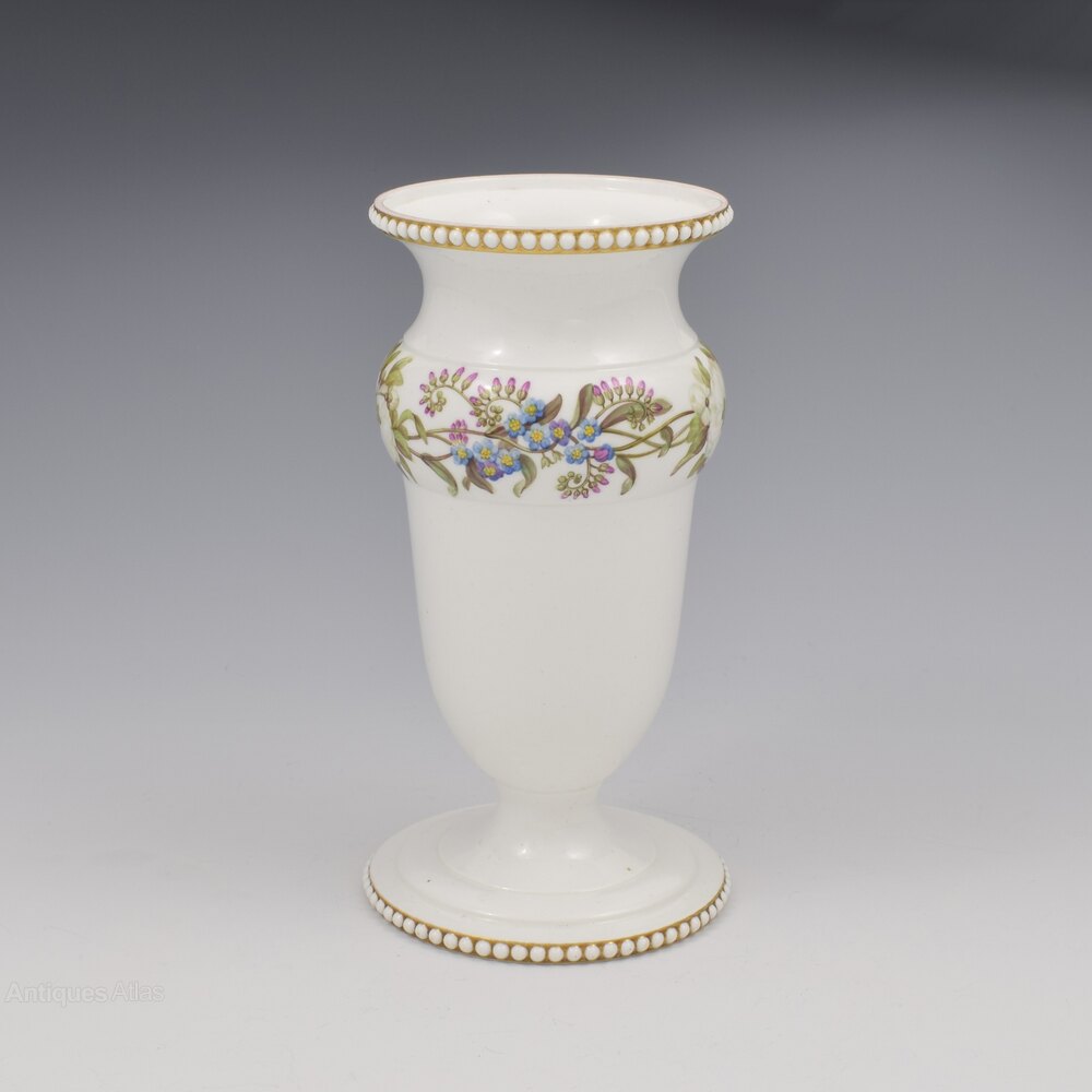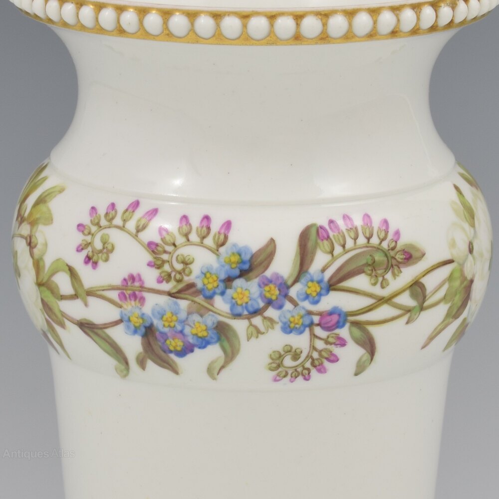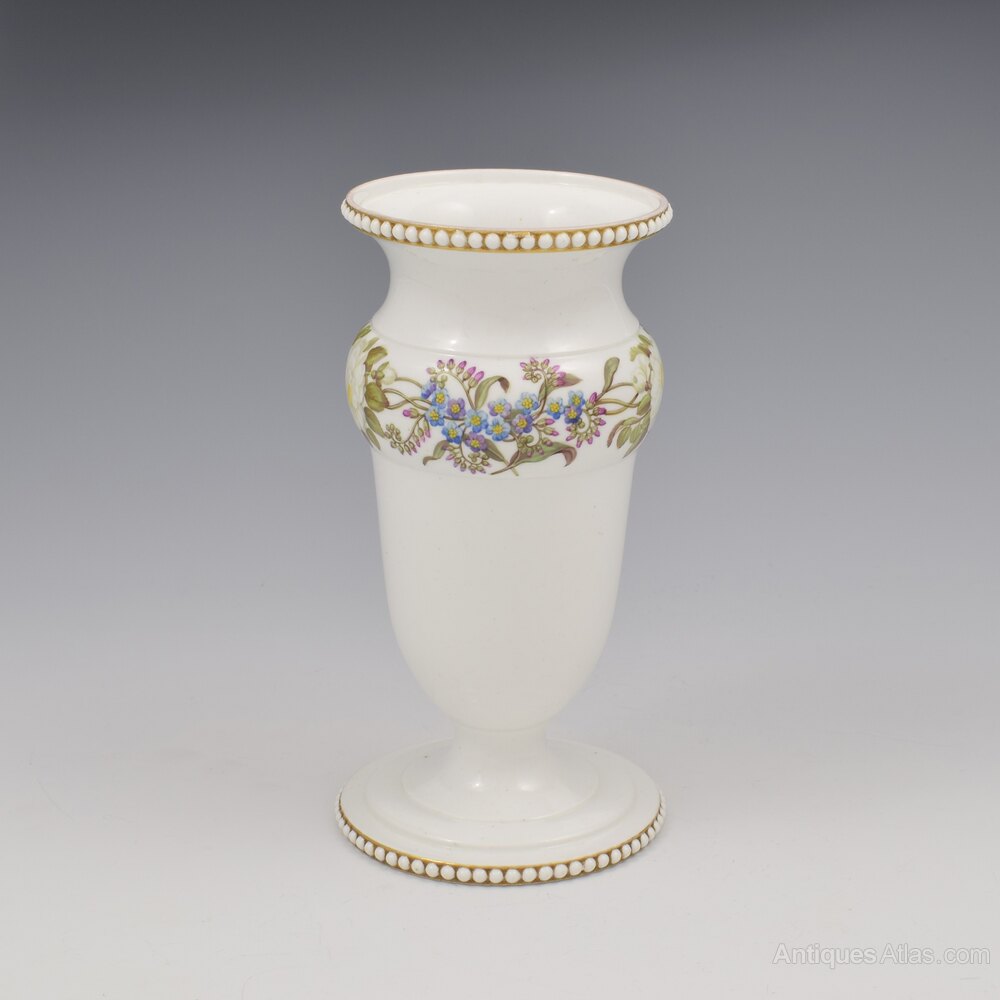 A gorgeous Spode bone china porcelain spill vase in an unusually understated style with the majority of the pure white ground undecorated, a testament to the quality and whiteness of the porcelain that it could be left so exposed as the star of the show (not many of Spode's competitors could have achieved such a result). A convex moulded band part way up is exceptionally well painted with a running border of forget-me-nots and ruffled white roses. Beaded bands around the rim and foot of small white porcelain pearls set against a gilt background. The careful, deliberate simplicity is very beautiful and the symbolism of the flowers is clearly significant.Marked to the underside, hidden in the well in the centre, with "SPODE" in red script. c.1815. This shape is number 44 in the factory shape book, named beaded, vase shaped jar.