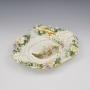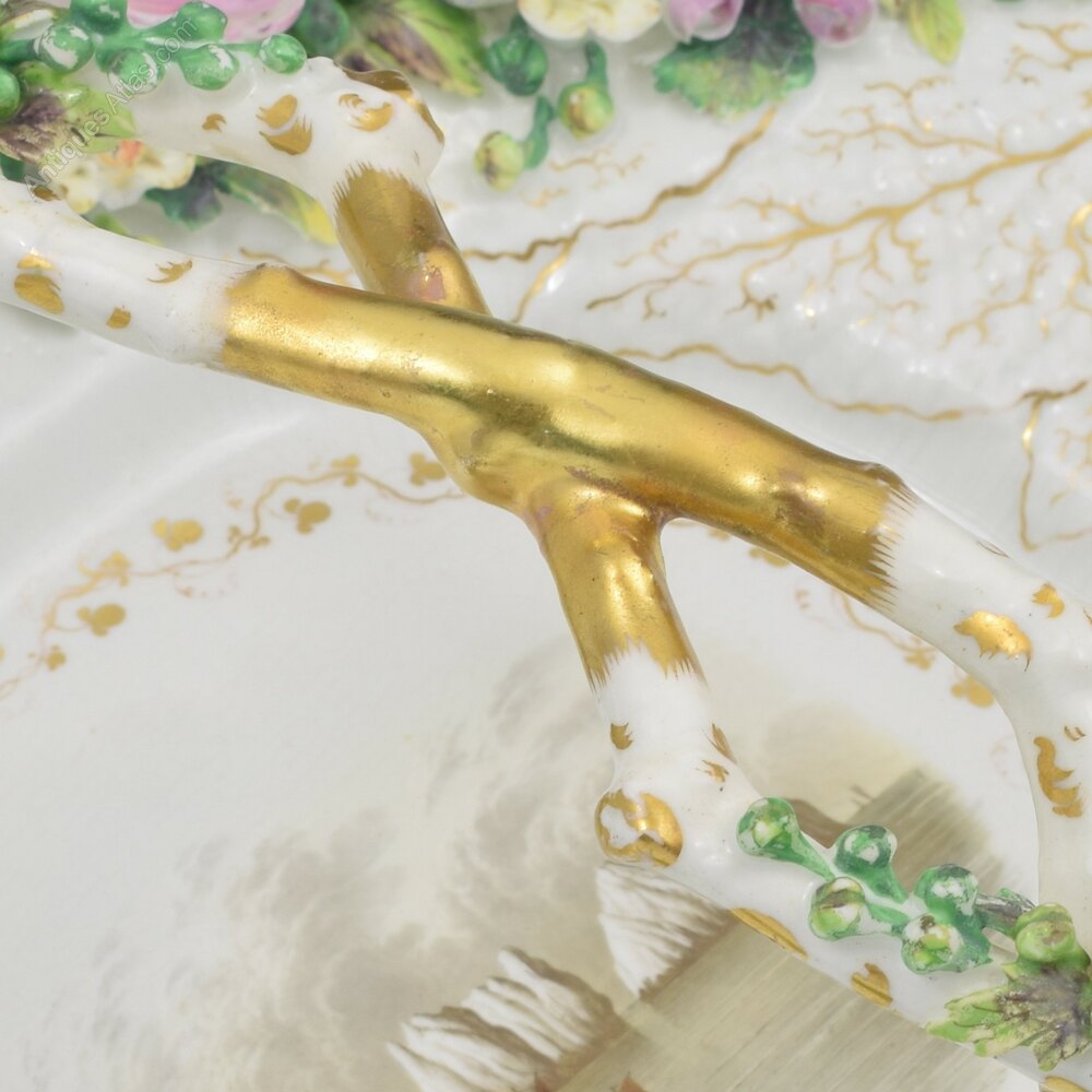 Condition is excellent: there is just a fine hairline around the lower part of one handle. No repairs or restoration. Some usual minor losses to some of the petals. The gilding on the handle may have been freshened at some point. Very minor handling wear to the raised enamels and gilt, no discernible wear to the central scene. The surface is finely crazed as is usual for this manufacturer.