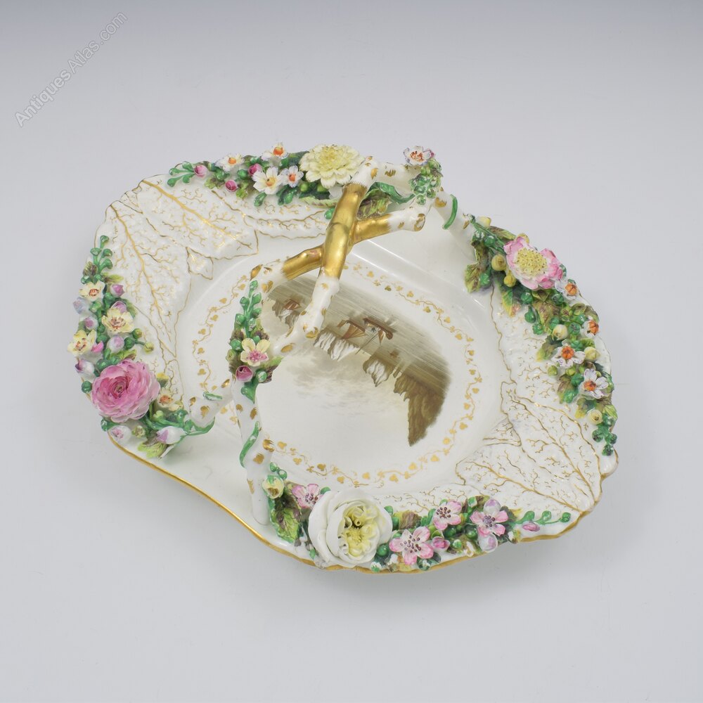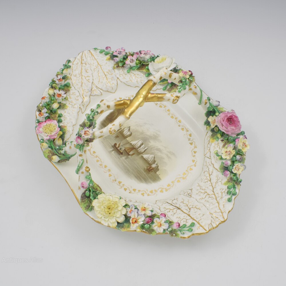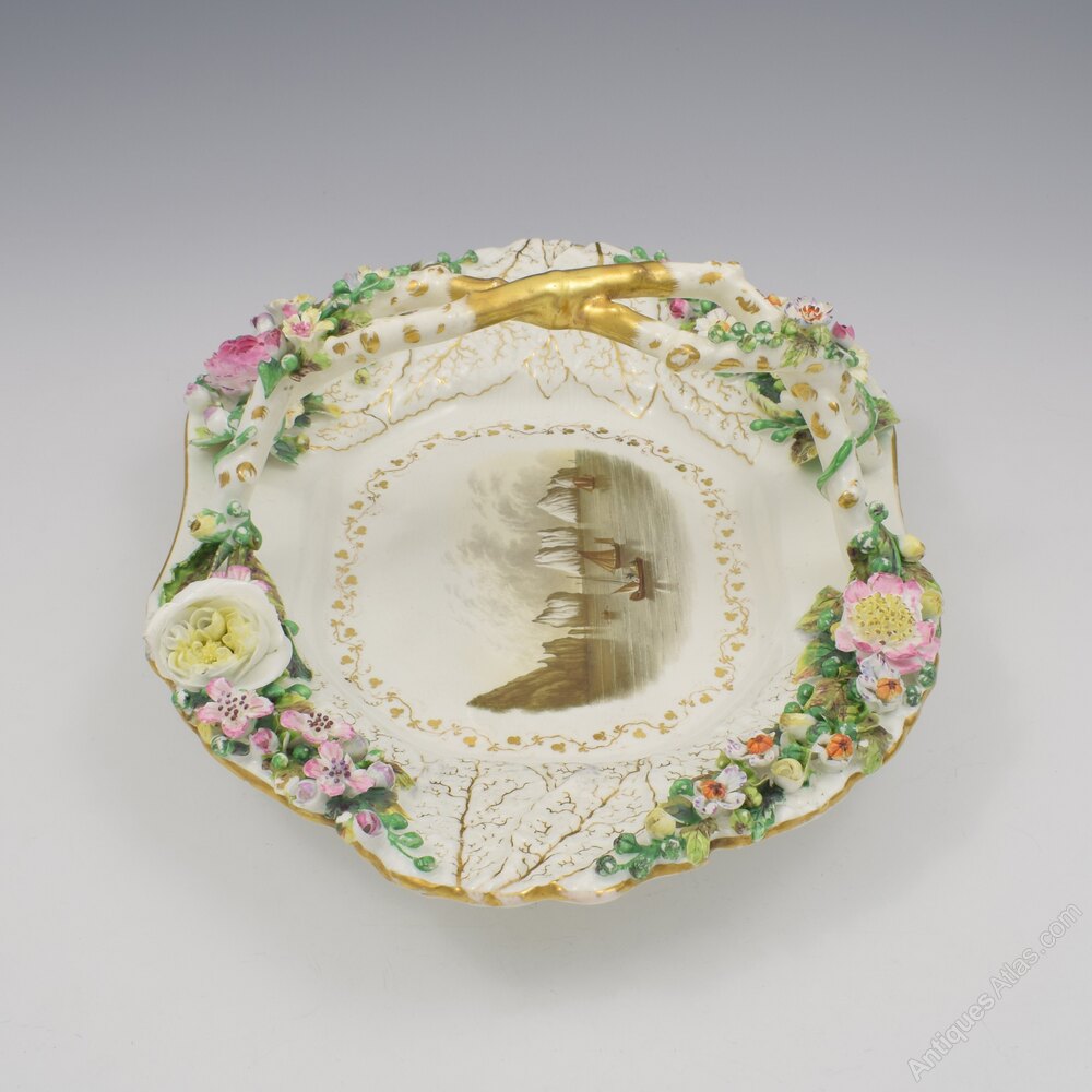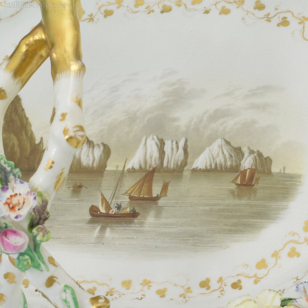 A stunning large Rockingham porcelain ornamental basket with entwined rustic handle. Of elongated, octagonal shape with moulded leaves covering the surface of the ends, the details all edged in gilt. Beautiful, intricately modelled flowers, leaves and buds decorate the canted edges and the sides of the handles To the centre, framed with a gilded leaf vine, is an exceptionally well painted seascape of The Isle Of Wight Needles with various sailboats and a small rowing boat to the foreground. The centre of the handle is gilded with further gilt accents down the sides and the basket is finished with a gilt rim.Marked to the reverse with the named view "The Needles, Isle Of Wight", painted in red enamel. No factory mark, c.1830-1842.
