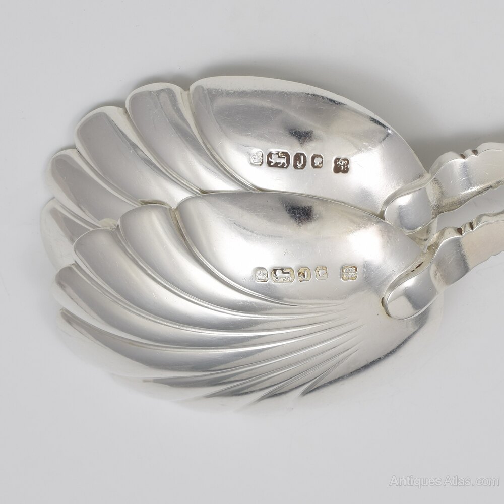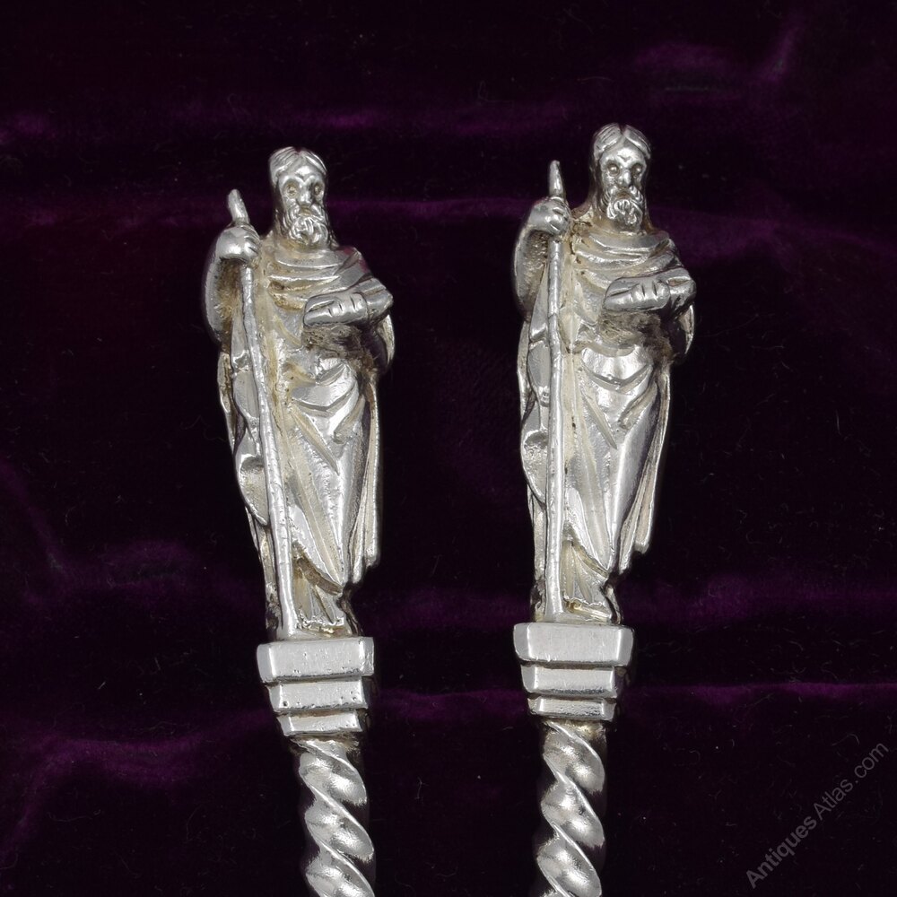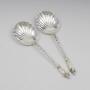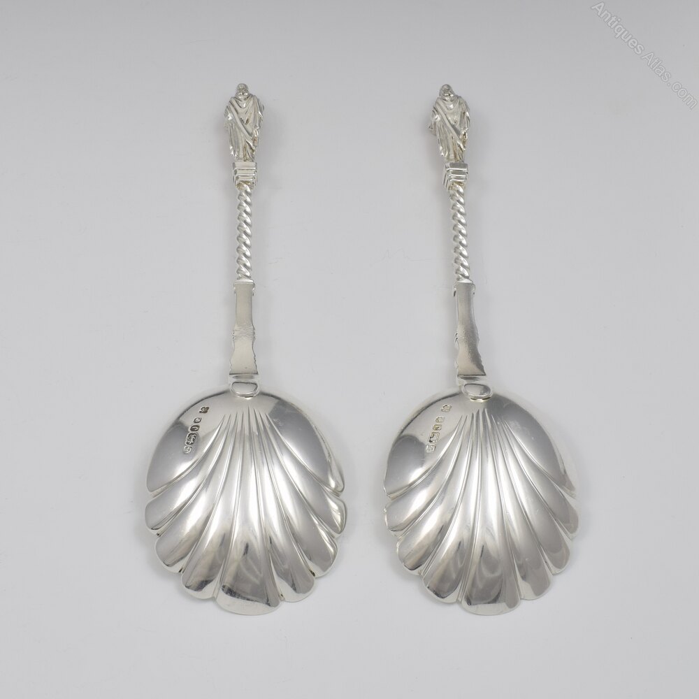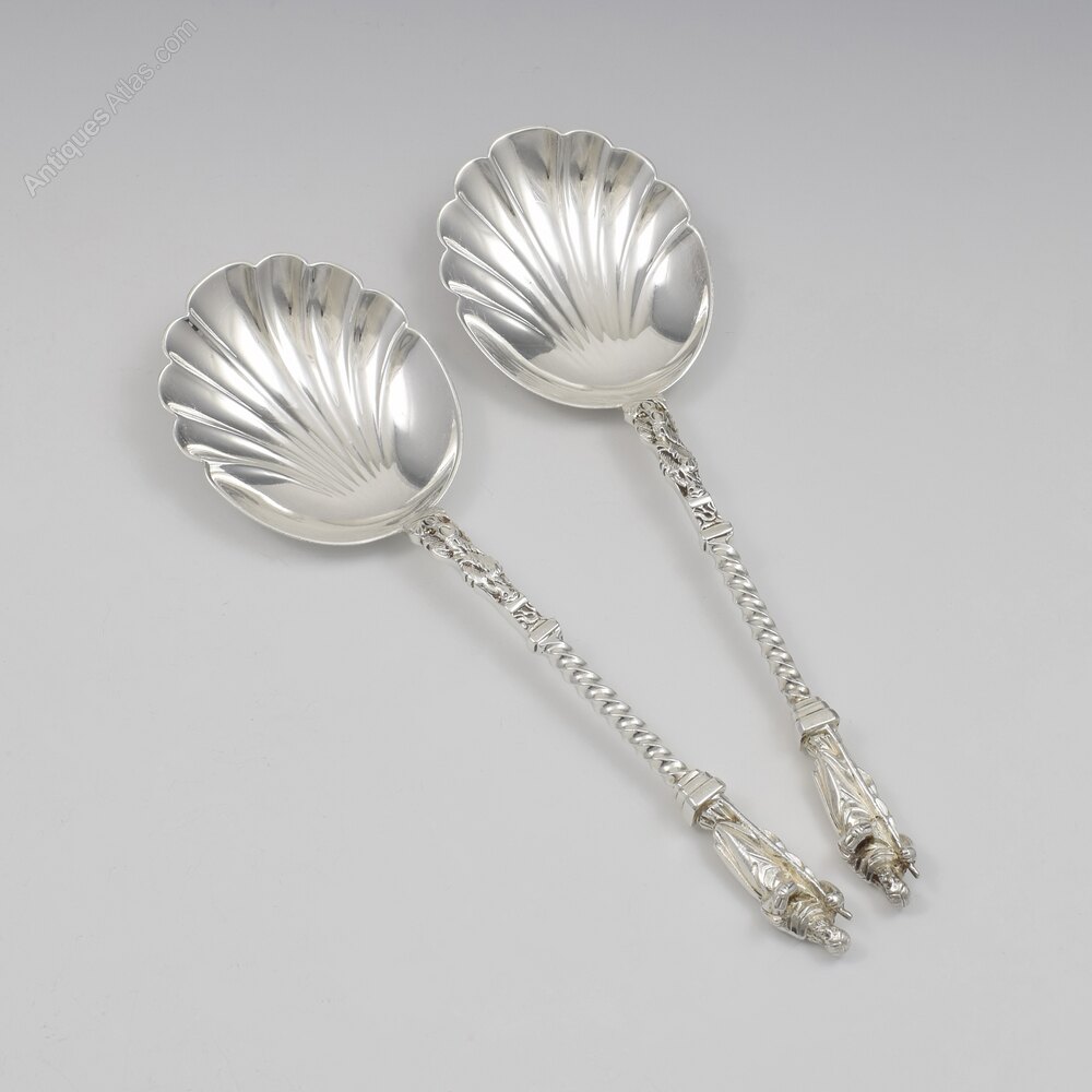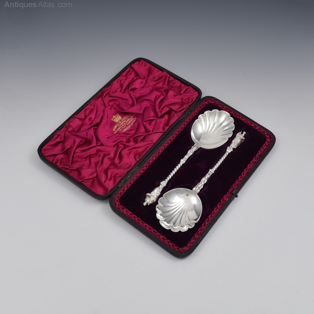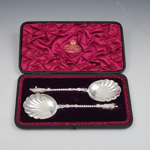 A super quality pair of Victorian dessert serving spoons with beautifully shaped scallop shell bowls and ornate cast stems mounted with an apostle, well detailed all around. Set in their original black leather fitted case from the retailers Howell & James Ltd of Regent Street (Goldsmiths to Queen Victoria), the interior is a feature of it's own in raspberry pink ruched silk and velvet with an unusual intricate plaited silk edging to the velvet.Hallmarked for Sheffield 1876, makers Richard Martin & Ebenezer Hall (Martin, Hall & Co.).