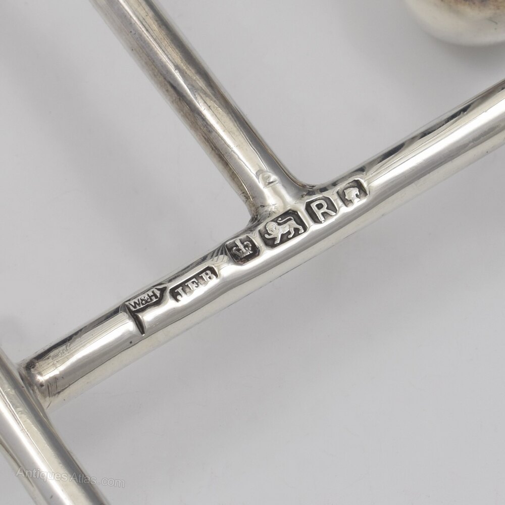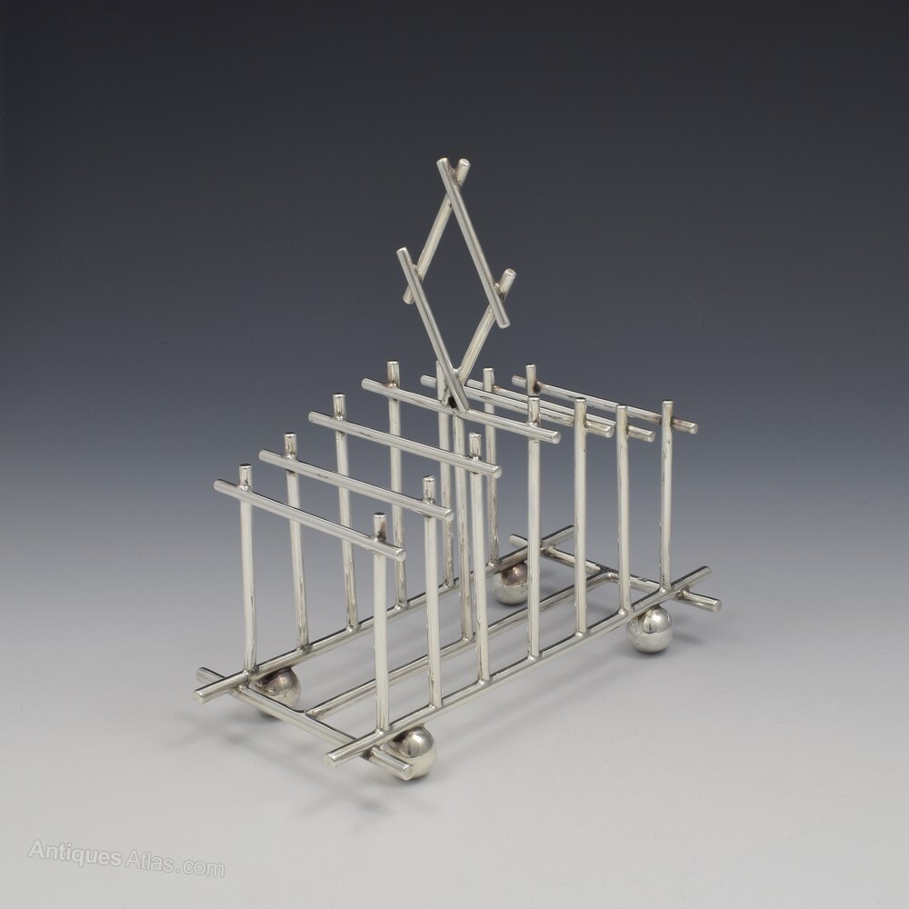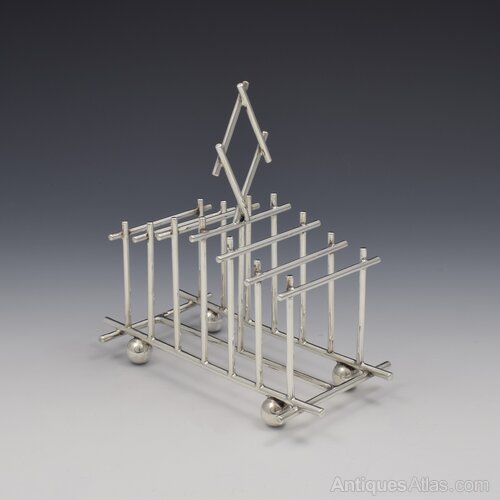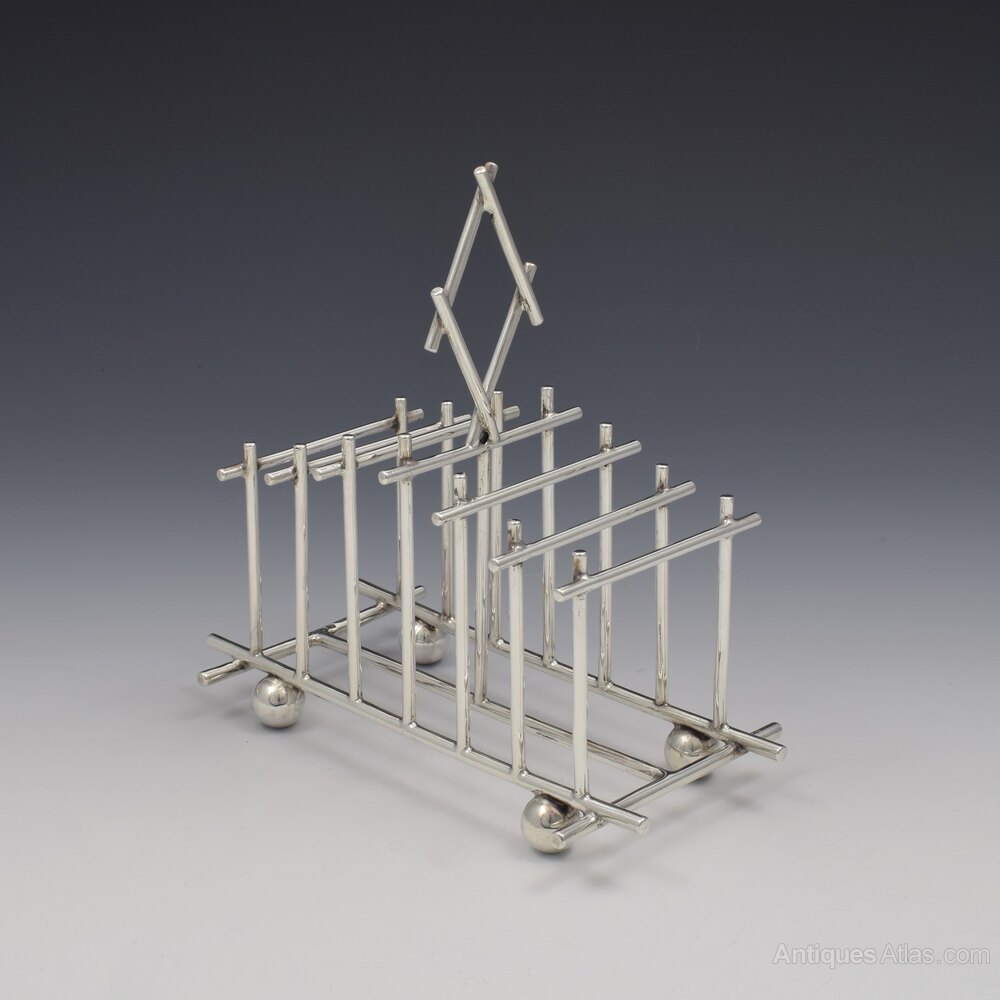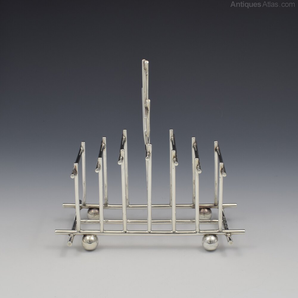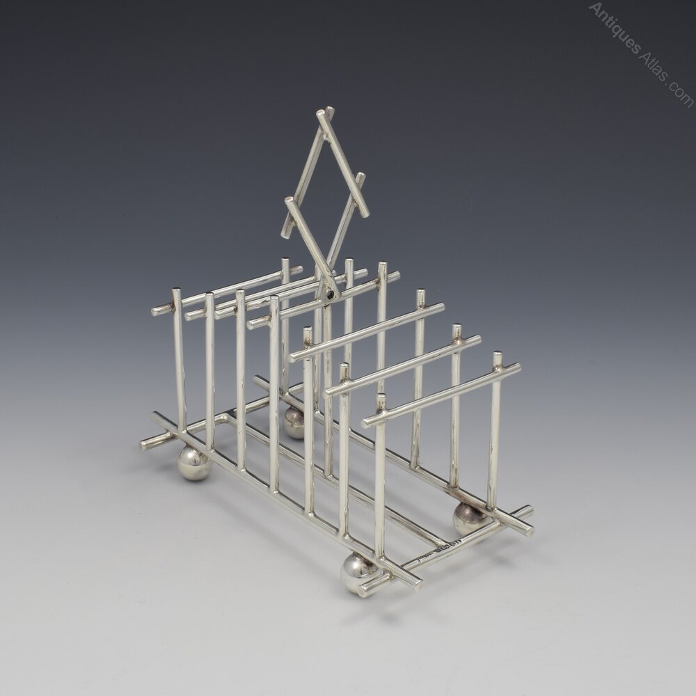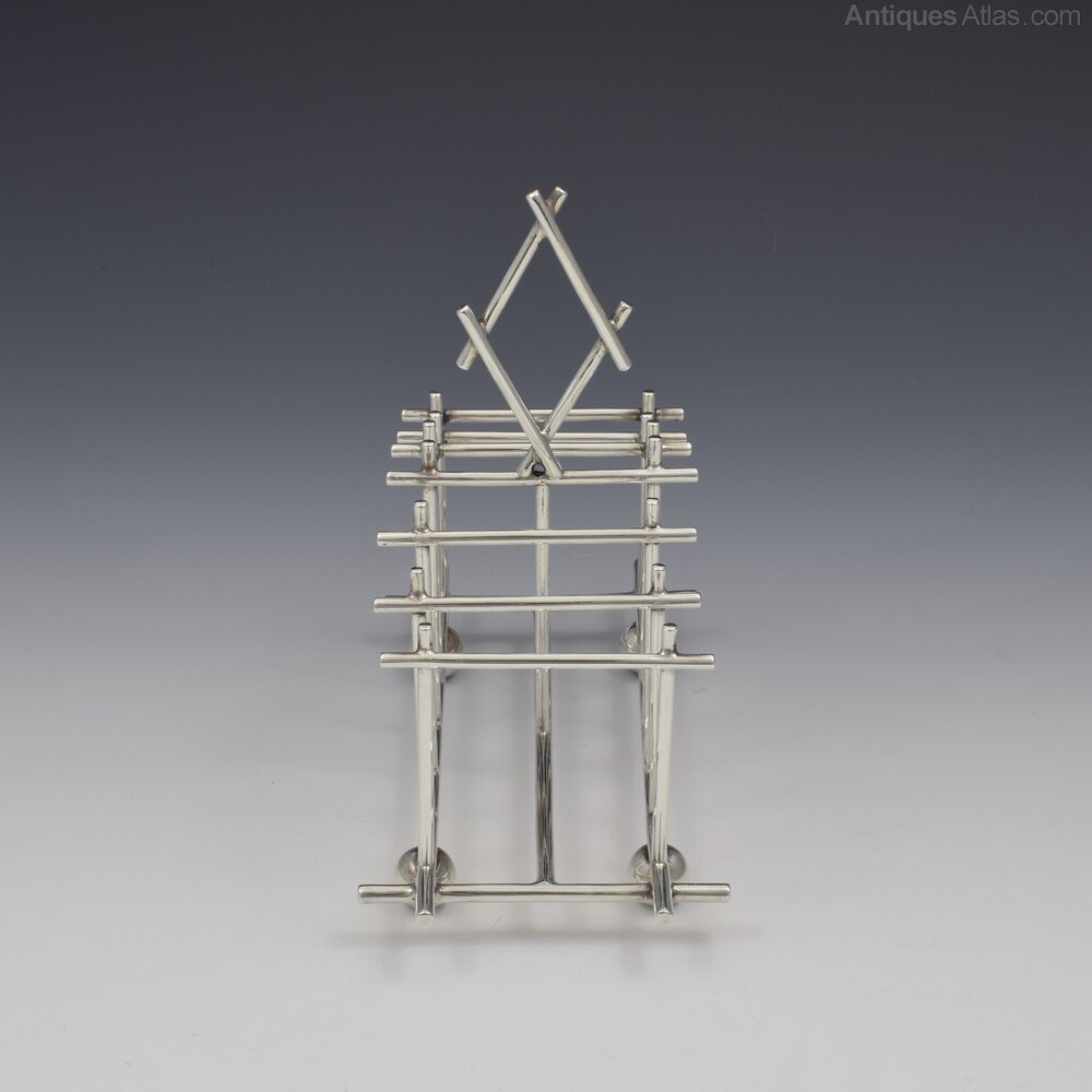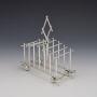 A fine quality Victorian six slice sterling silver toast rack designed with the clear influence of Dr Christopher Dresser. Hallmarked for Sheffield 1884, maker John Edward Bingham, with further retail mark for Walker & Hall.It measures 18cm (7 1/16") long by 9.3cm (3 5/8") wide and 17.5cm (6 7/8") high. It weighs 390g / 12.5ozt.