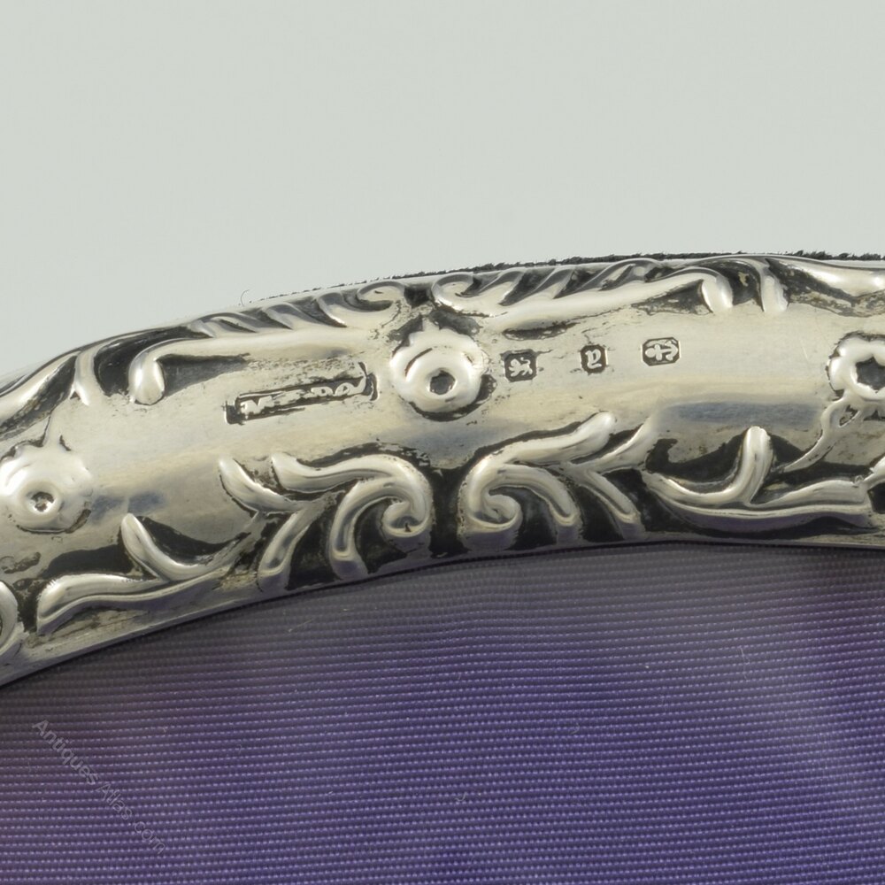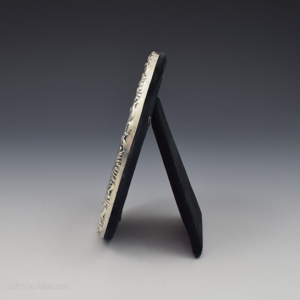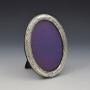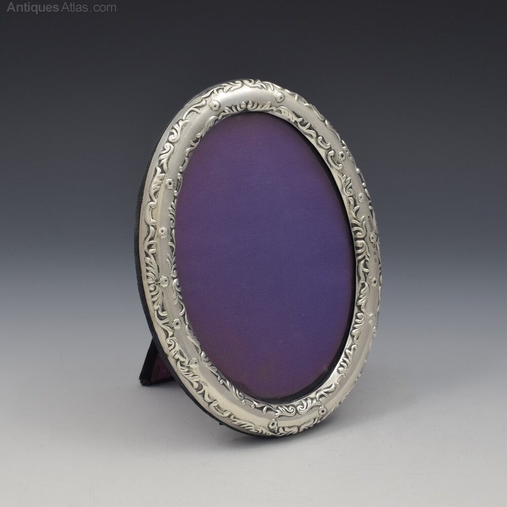 A very pretty art nouveau style silver mounted oval photograph frame with embossed art decoration of scrolling flowering vines. The easel back mounted in what appears to be the original back velvet and purple silk. Hallmarked for Birmingham 1898, maker Miller Brothers.It measures 16cm (6 1/4") high by 12.2cm (4 3/4") wide, with an aperture of 13cm (5 1/8") by 9cm (3 1/2") and it stands 15.2cm (6") tall.