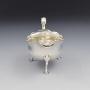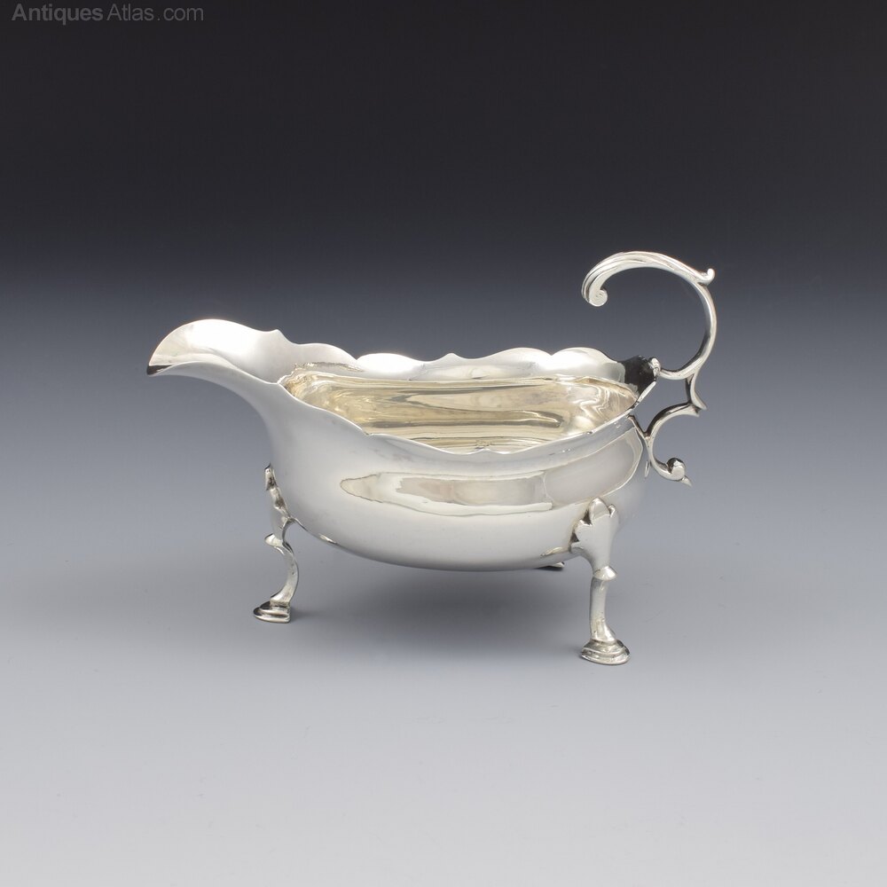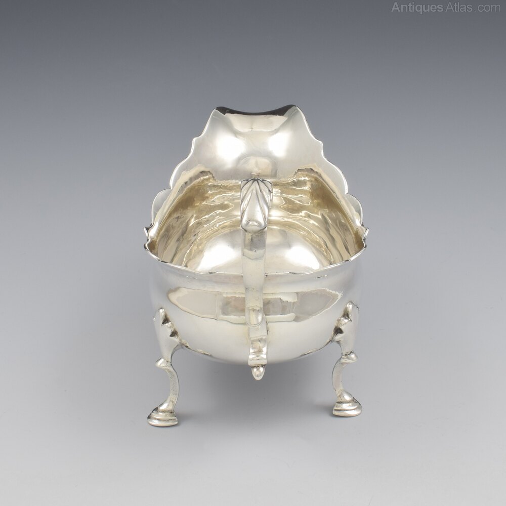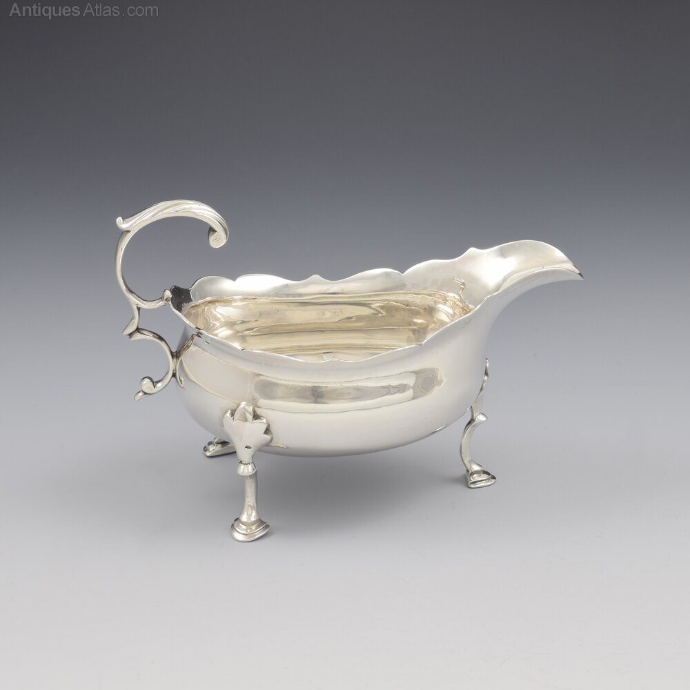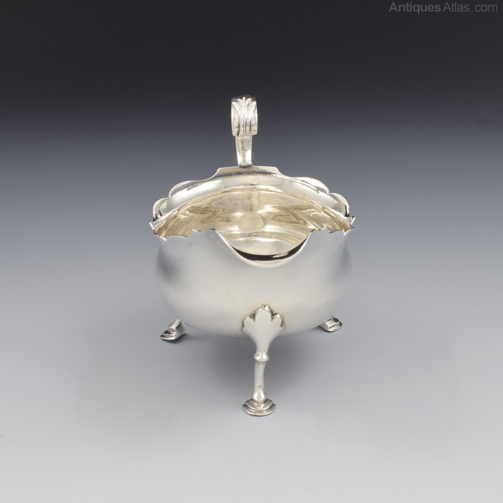 A lovely 18th century silver sauce boat, set on three stylised hoof feet with foliate shaped terminals, with a card cut rim and a flying C-scroll handle with cast acanthus leaf thumb rest. Of small size, perfect for individual use or a good size for use as a cream boat. Hallmarked for London 1771, maker Walter Brind.It measures 12.1cm (4 3/4") long, 6.7cm (2 5/8") wide and 8.3cm (3 1/8") high to the handle. It weighs 103g / 3.3ozt and has a sensible capacity of 75ml (just under 3 fluid ounces).
