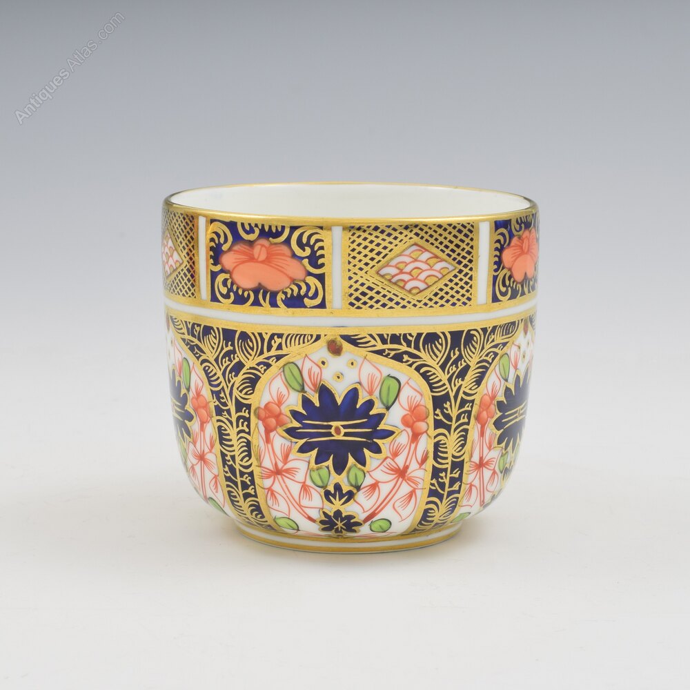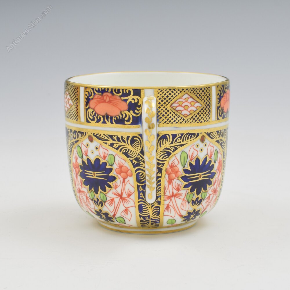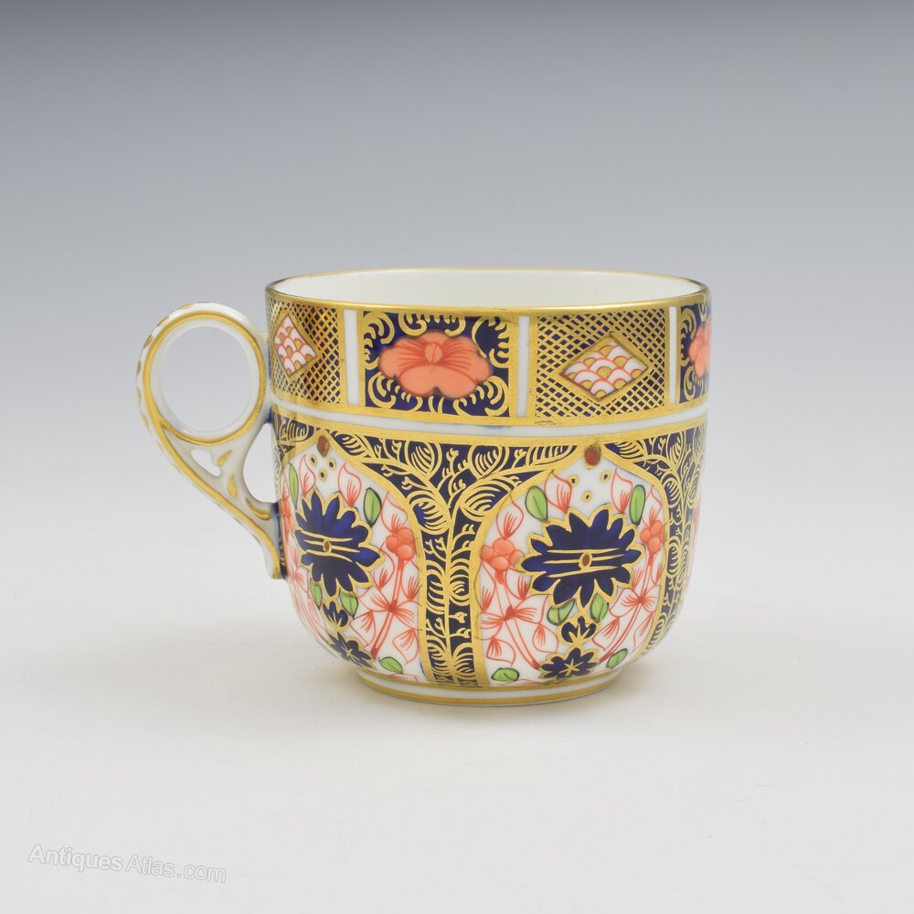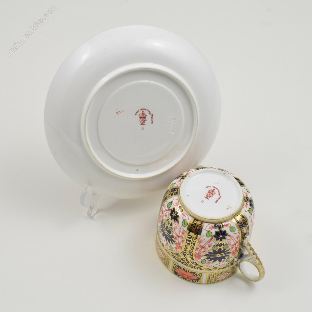 A lovely early 20th century Royal Crown Derby bone china porcelain cup and saucer in the ever popular imari pattern number 1128, the cup of a beautiful shape with a very pretty moulded ring handle. Both pieces with matching marks, and the date cypher for 1913.The cup measures 6.6cm (2 9/16") high and 7.4cm (2 7/8") rim to rim and the saucer is 13.8cm (5 7/16") wide.