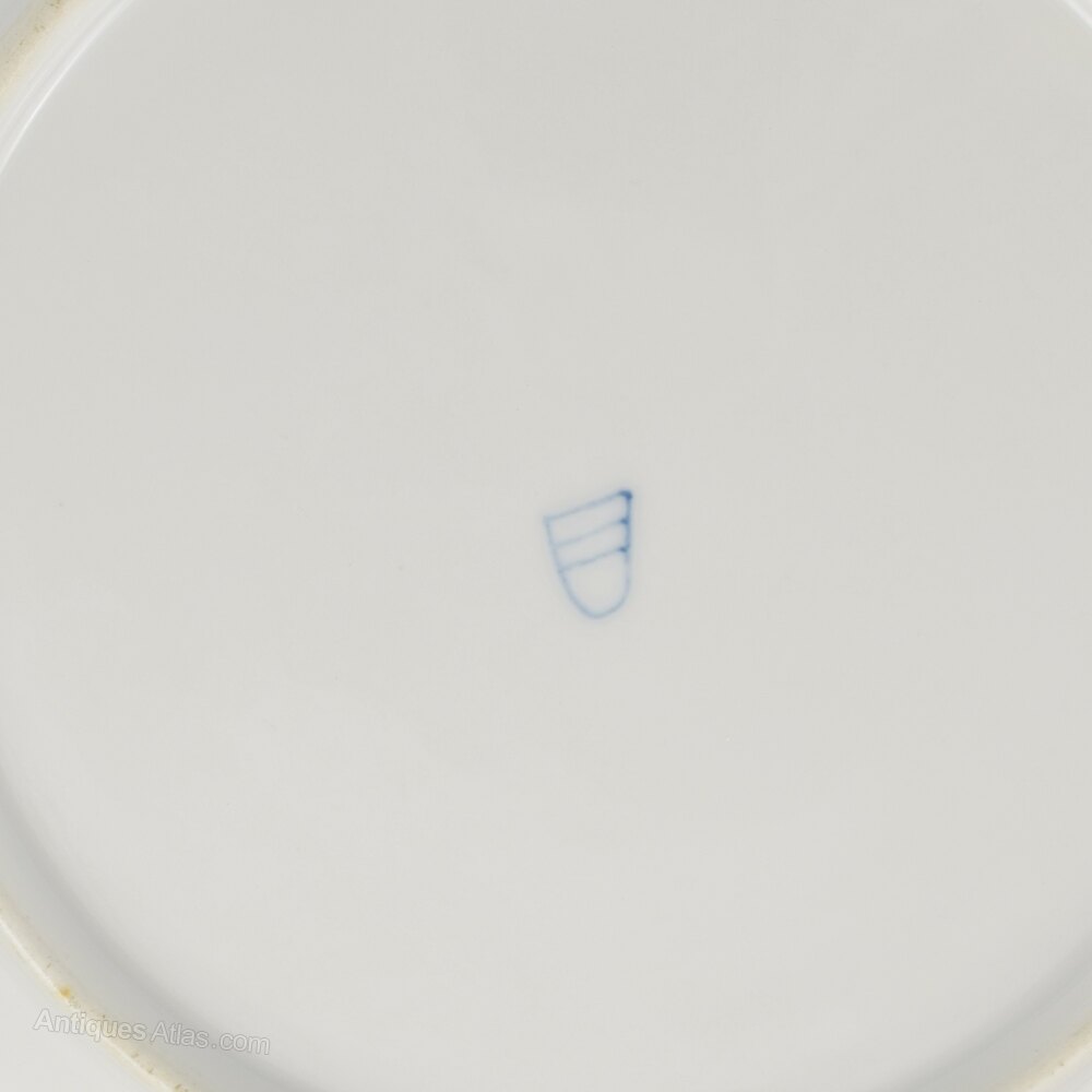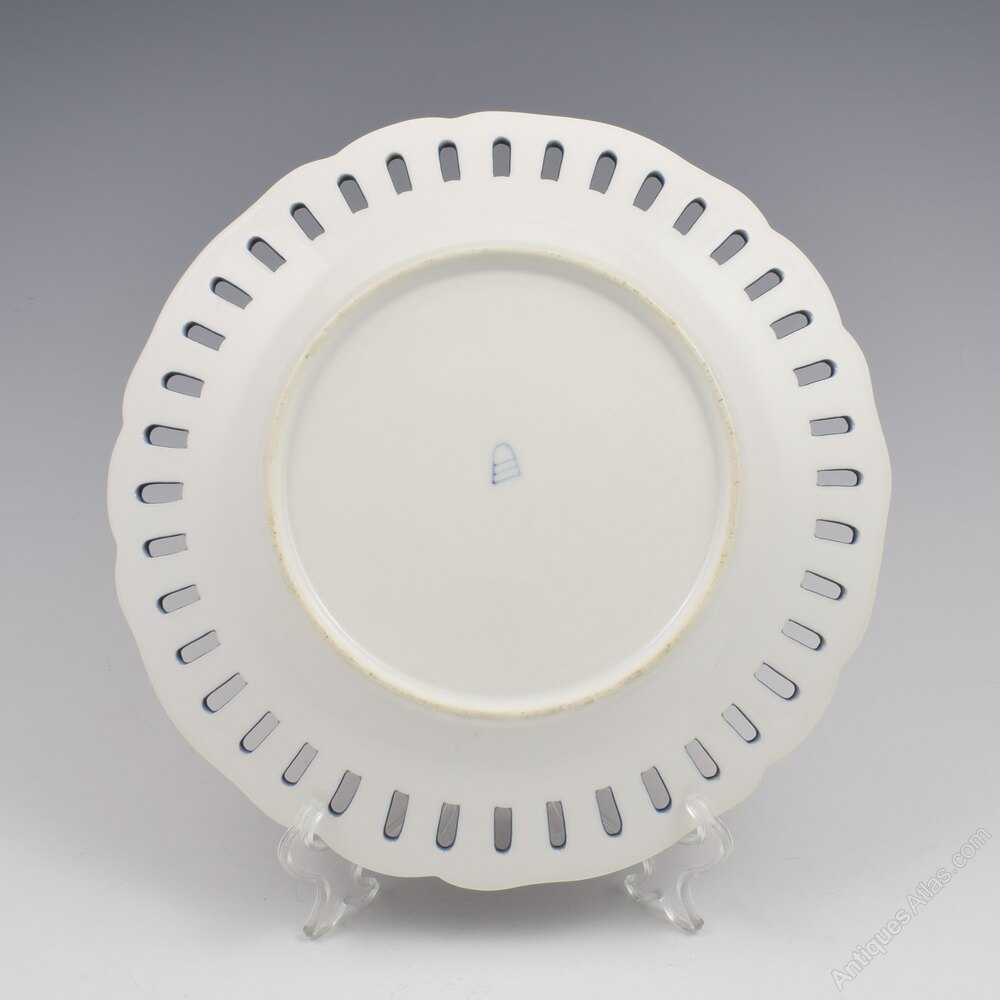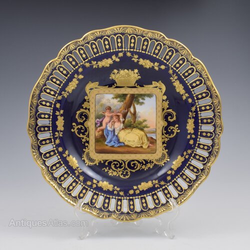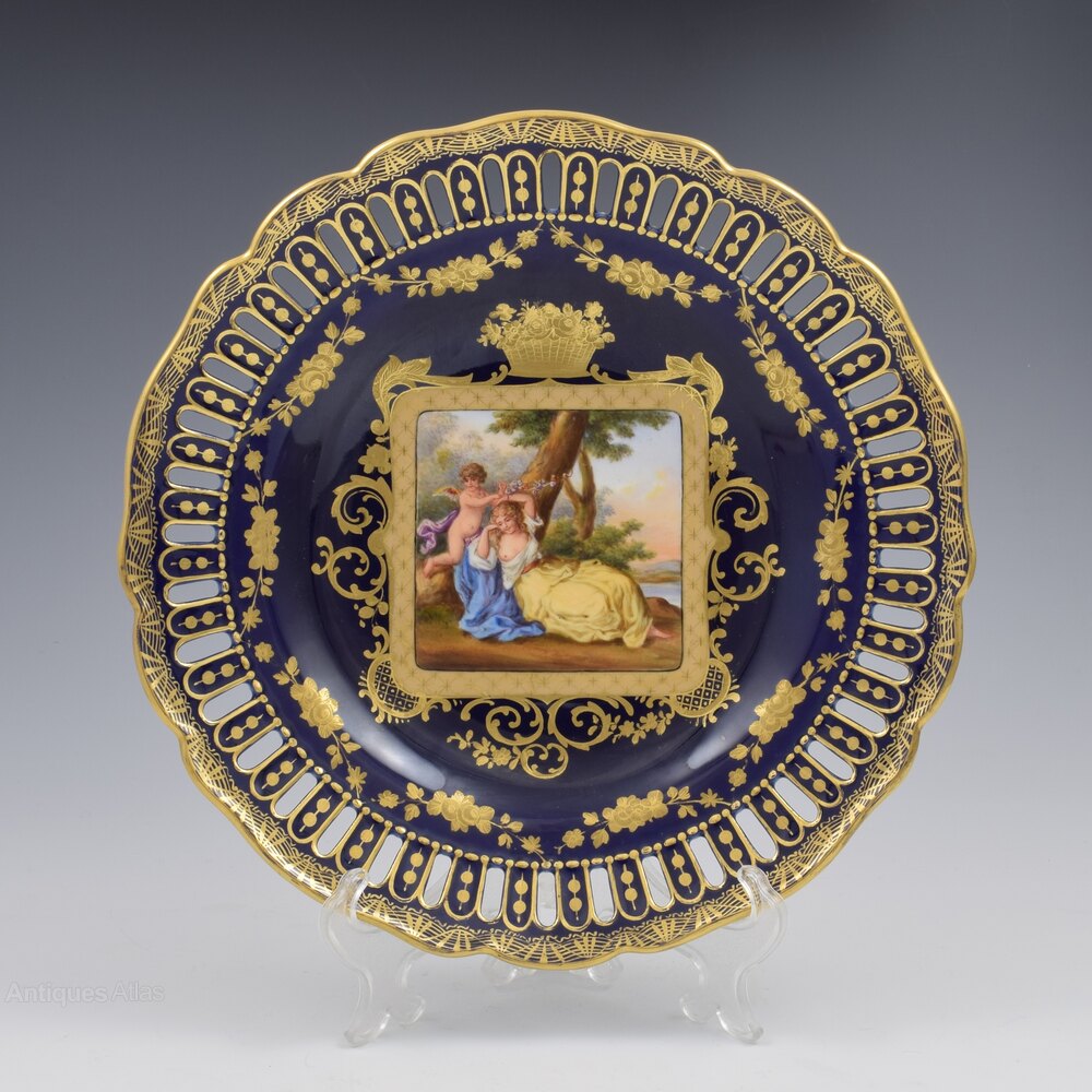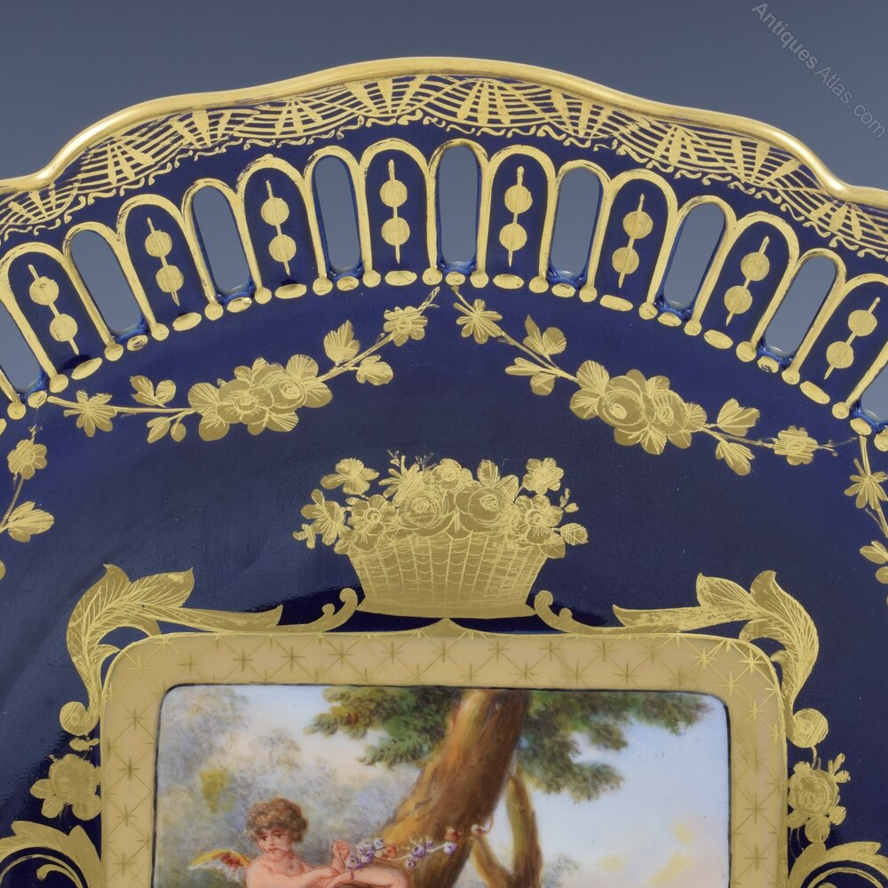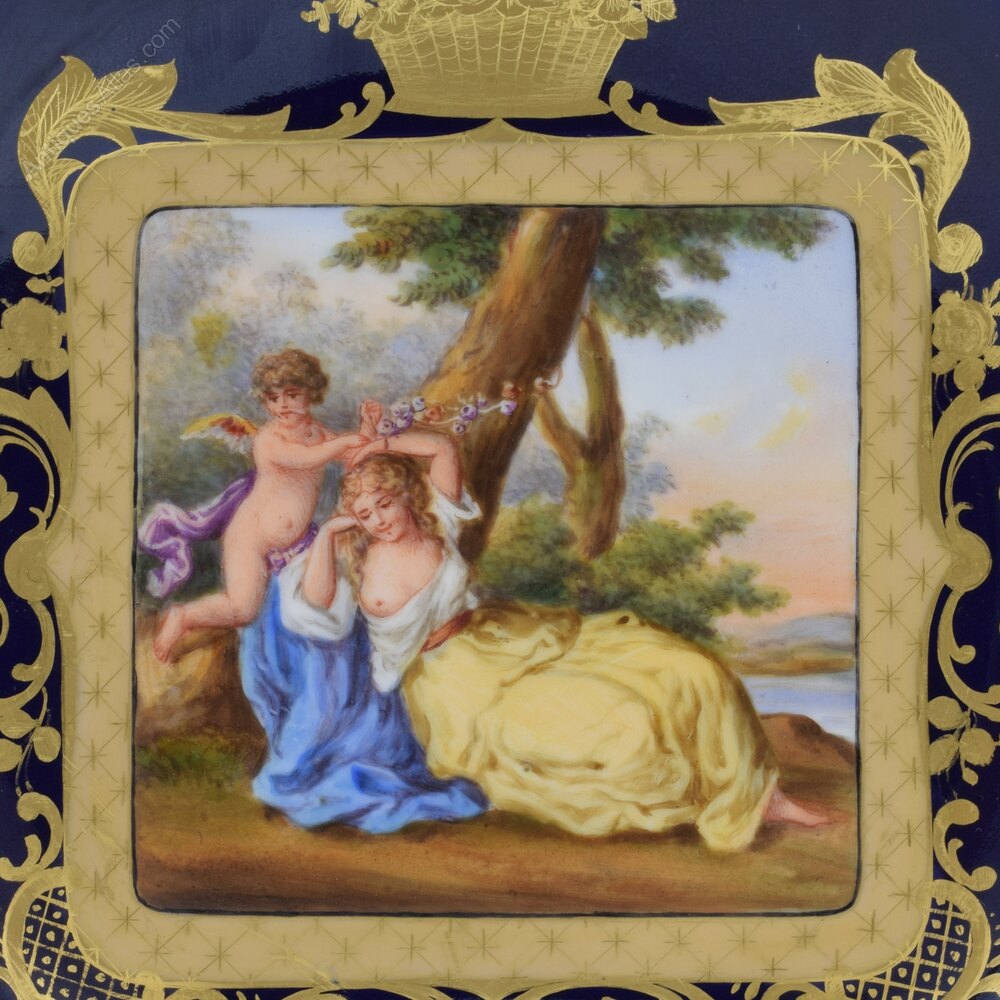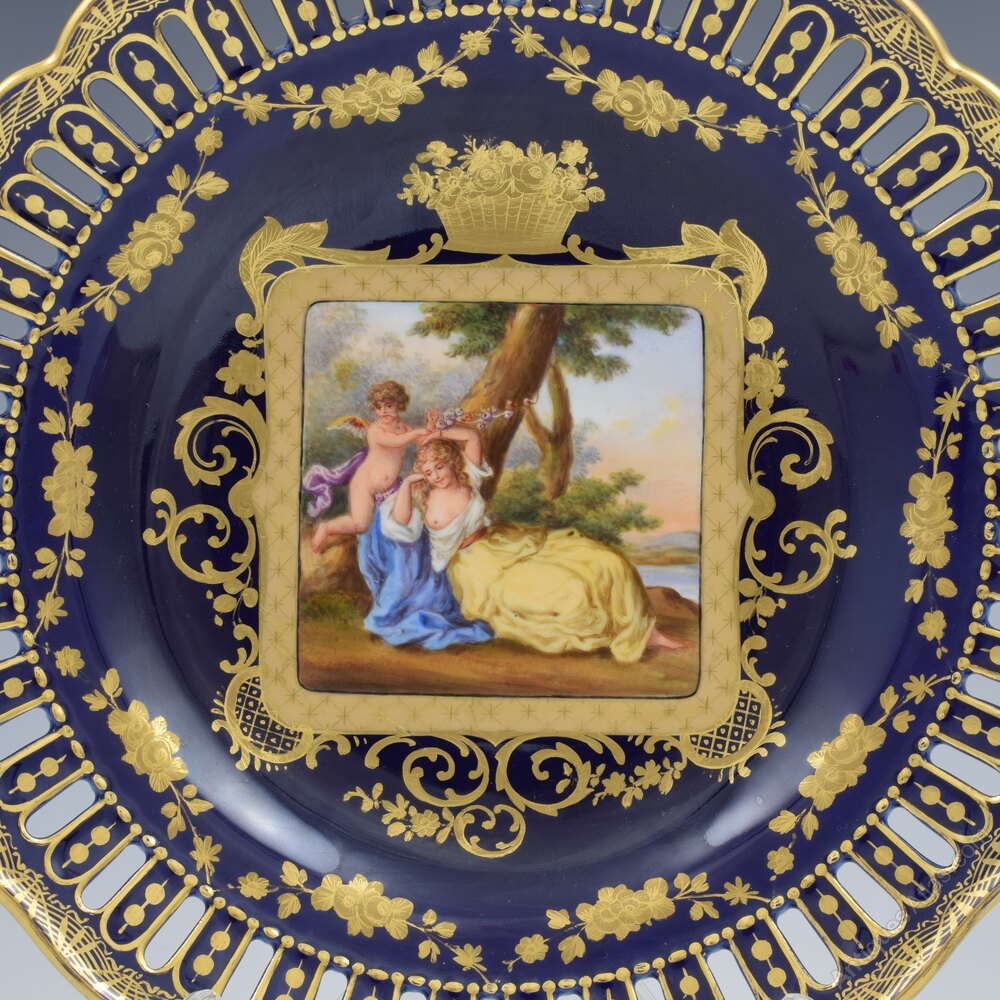 Fine late 19th century Royal Vienna cabinet plate in a deep cobalt blue with a hand painted central vignette of Cupid and a semi clad Psyche asleep under a tree. Beautifully painted and surrounded by ornate tooled gilding of scrolls, leaves and baskets of fruit. Pierced detail around the edge and a pretty fluted rim with very fine gilded detailing. Blue underglaze bindenschild / "beehive" mark to the back.It measures 24cm (9 7/16") wide and 3.8cm (1 1/2)" deep.