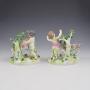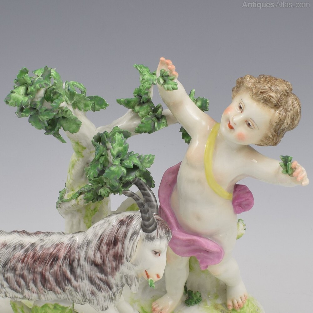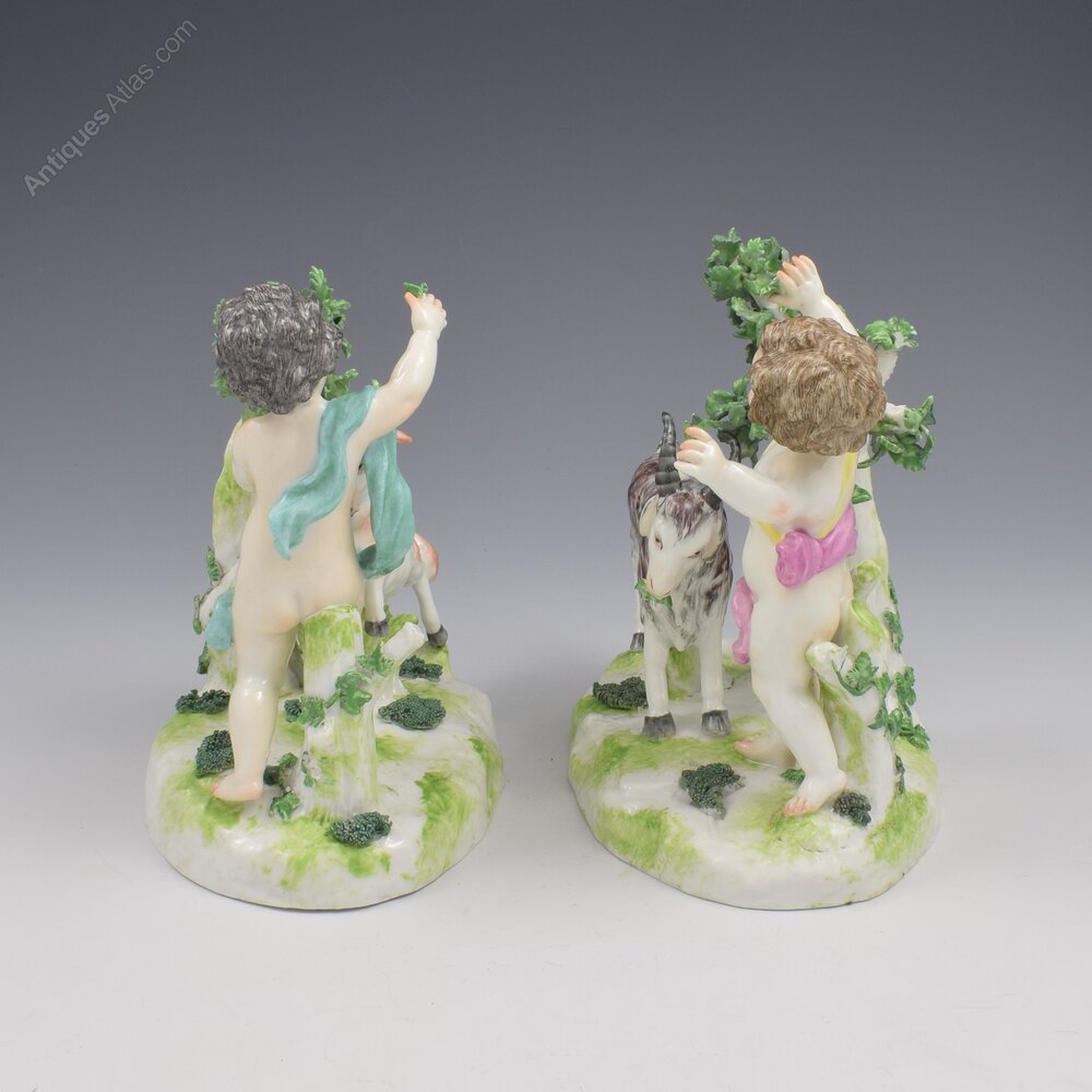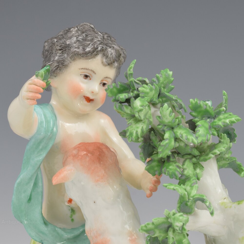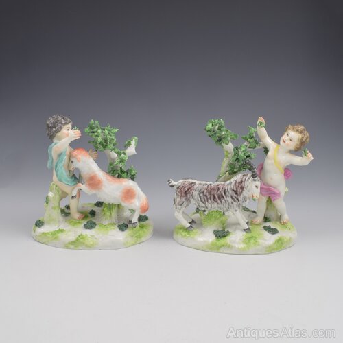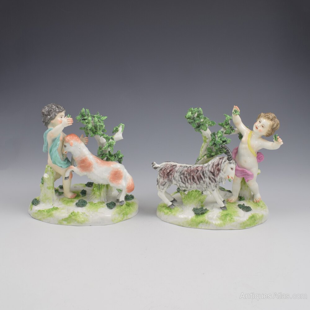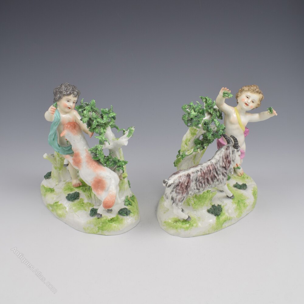 A very fine pair of porcelain figure groups by Edme Samson et Cie of Paris, copying the style of 18th century Chelsea. Two playful putti or cherubs are stood on naturalistic bases with simple tree bocages and each is feeding a pet goat with leaves from the shrubs. Very charming pair, finely modelled and decorated, with pseudo gold anchor marks to the reverse. c.1860-1880.The term "Samson" porcelain and attribution to Edme Samson is often used inaccurately, and very unfairly. It has become a bit of a generic dumping ground for all manner of Continental (and further afield) porcelain figures in vaguely 18th century styles that have no definitive attribution, regardless of age (or lack thereof), true origin and certainly quality, with many very poor quality reproductions being readily branded "Samson".