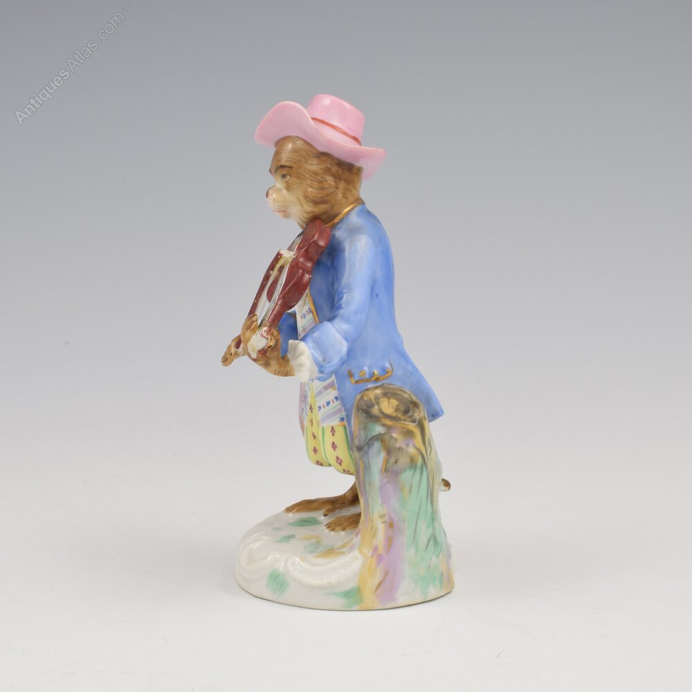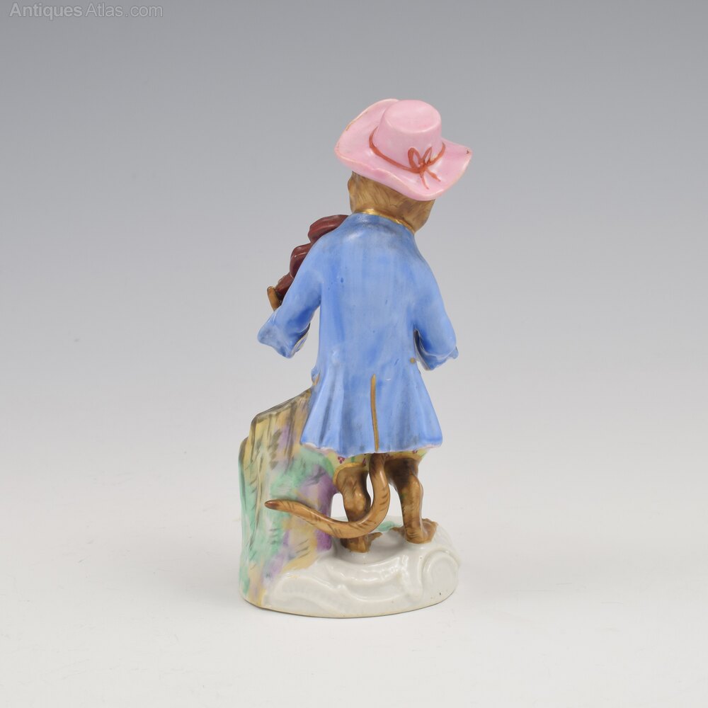 A charming late 19th century Dresden porcelain monkey band figure of a violin player. Finely painted dressed in a powder blue jacket with yellow striped breaches and lilac and floral striped waistcoat and wearing a wide brimmed pink hat. Underglaze blue crossed swords marks to base and incised numerals. c.1890.He measures 13.3cm (5 1/4") high and 6cm (2 1/8") wide.