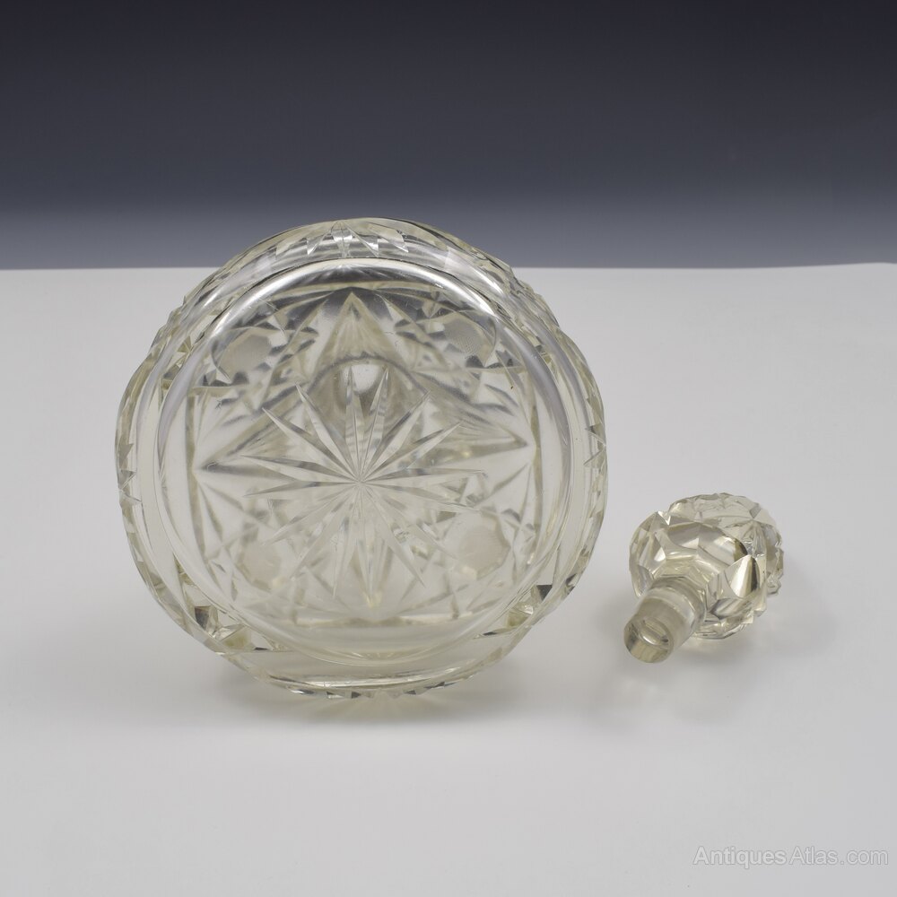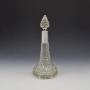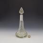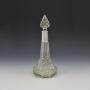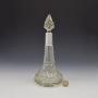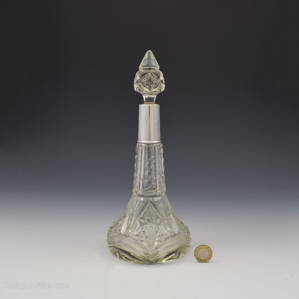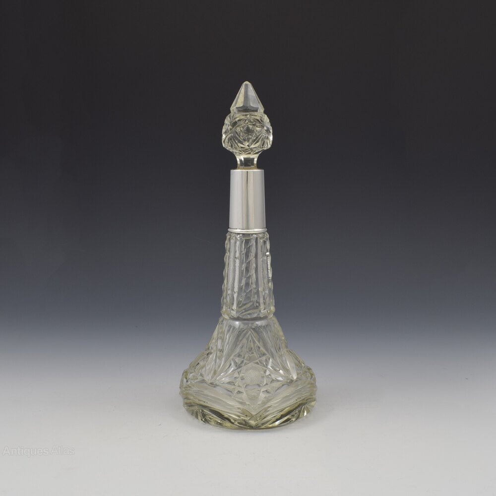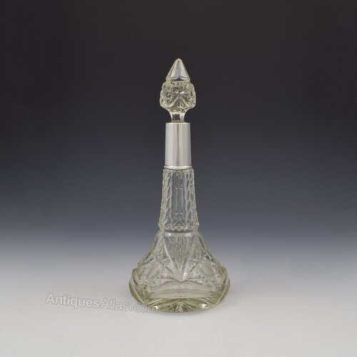 A stunning large cut glass perfume bottle of conical form with ornate hand cut decoration of hobstars around the base with circular centres of fine cut diamonds and blade cut fans, with angled faceted columns alternating with notched prisms rising up the shaft. Mounted with a sterling silver collar. The stopper with matching decoration of hobstars and fans and finished in a faceted point. Classic in style and shape and the size makes it a striking statement piece. Hallmarked for London 1933, Henry Perkins & Sons.It measures 27cm (10 5/8") high and 11.5cm (4 1/2") wide.