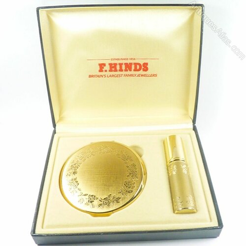 A gleaming unused vintage vanity set crafted by the makers of the Stratton brand for the F. Hinds jewellery chain in the 1990s. This delightful gift set comprises a powder compact and atomiser which are embellished with embossed roses and a glorious gilt lacquered finish which is so durable that it will not tarnish or require cleaning.The original presentation box, signed Stratton puff, washable sifter and an immaculate wool felt pouch are present.