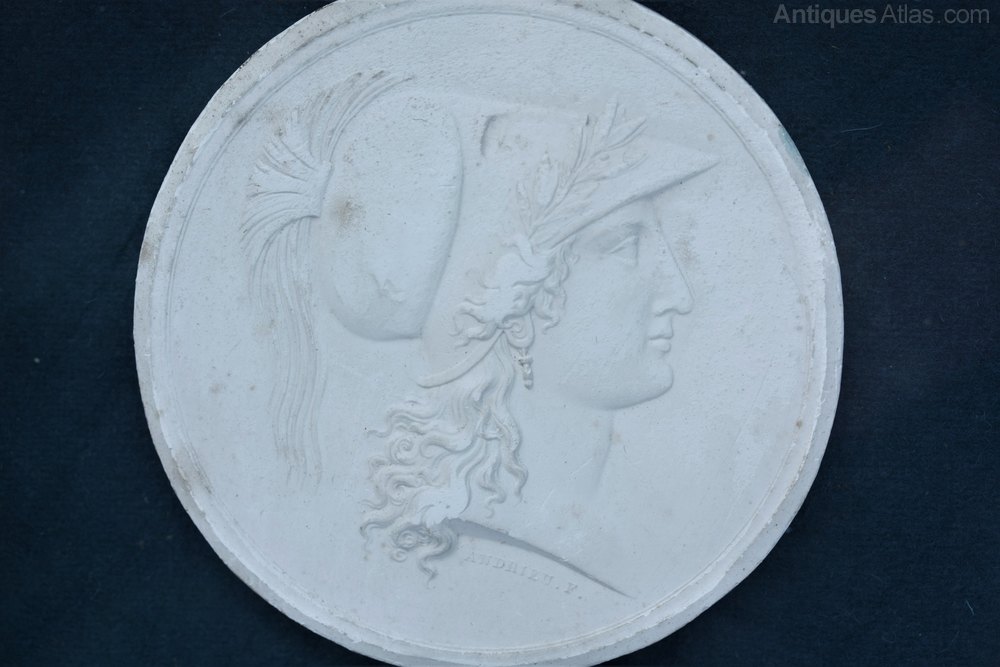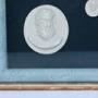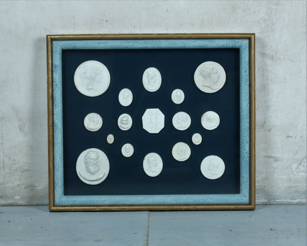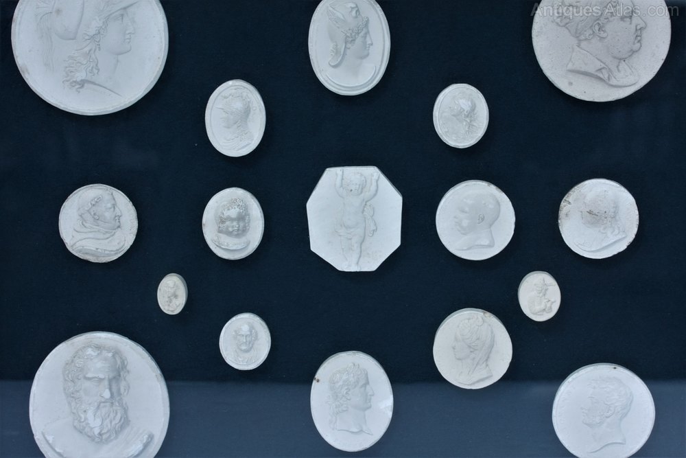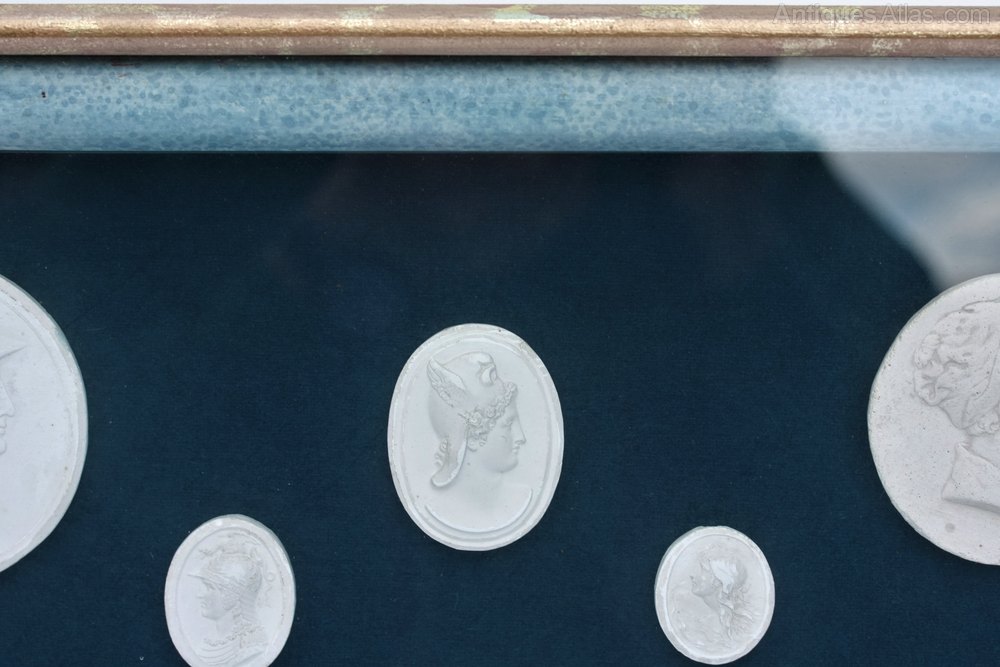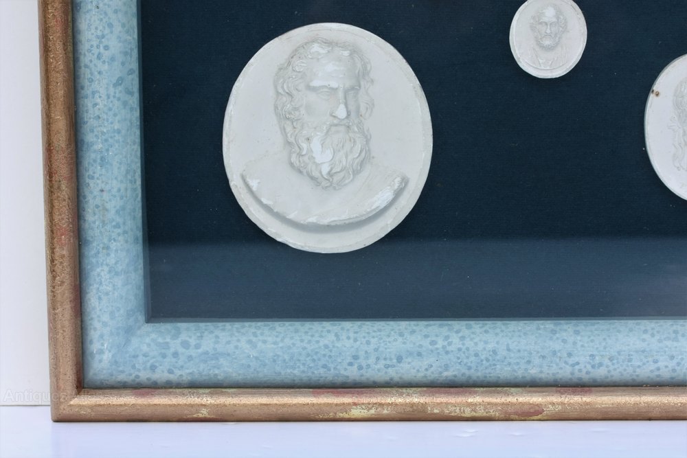 This is an attractive set of plaster intaglios / medallions / cameos acquired in Italy during the Grand Tour in the early to mid 19th century displayed in a hand-finished box frame.There are 17 intaglios in total and they range in size and shape and subject matter from Roman Gods to putti to contemporary celebrities. Several of the intaglios are named including Giovanni Belzoni, Tibare (Roman Emperor), Napoleon Francois Joseph and Rogerius Bacon (with monk's attire). Four of the intaglios have the sculptor's name in smaller letters below the bust.