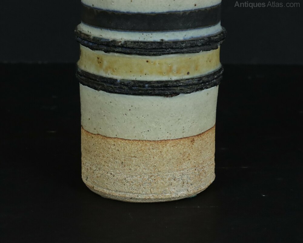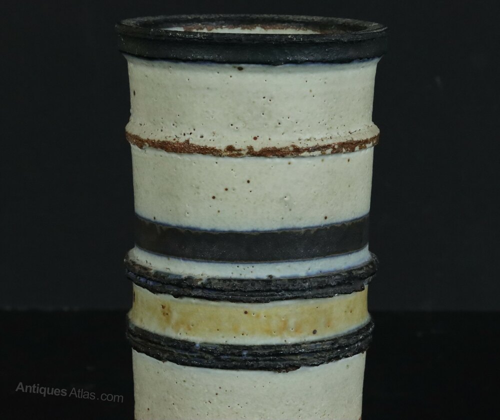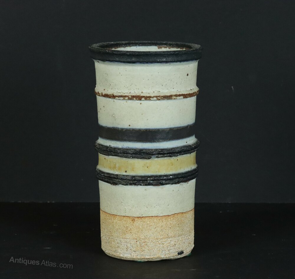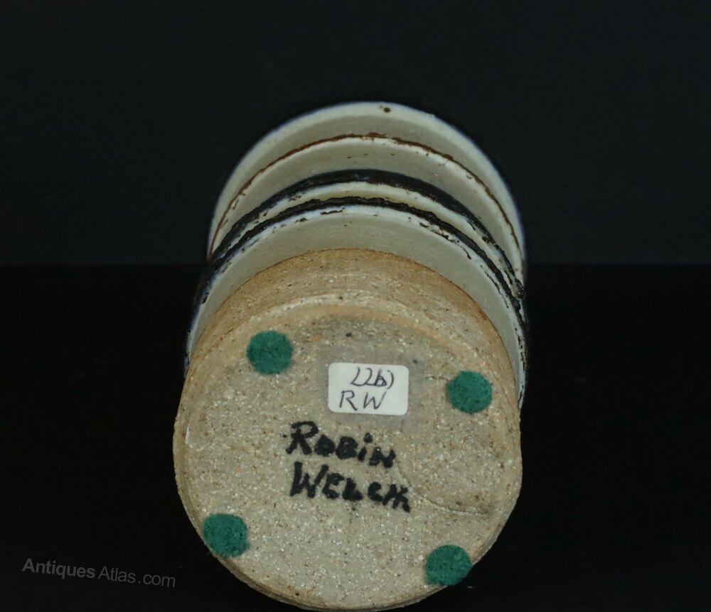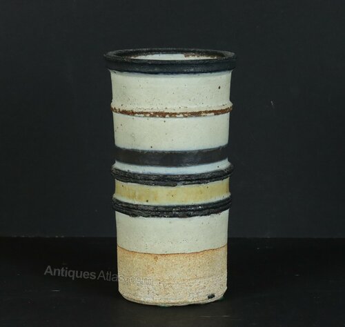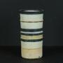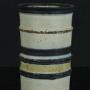 An individual and unique banded stoneware cylindrical vase by the renowned potter, Robin Welch, in perfect condition. It is quite an intricate design involving three different coloured glazes, off-white, black and beige, arranged in bands, separated in part by three ridges following the circumference of the vessel with the two lower ridges bearing a central groove. The lowermost 25% of the vessel remains unglazed. On the base is painted in black 'Robin Welch', a mark he used from 1985.Dimensions: Height 18 cm x Diameter 9.5 cm