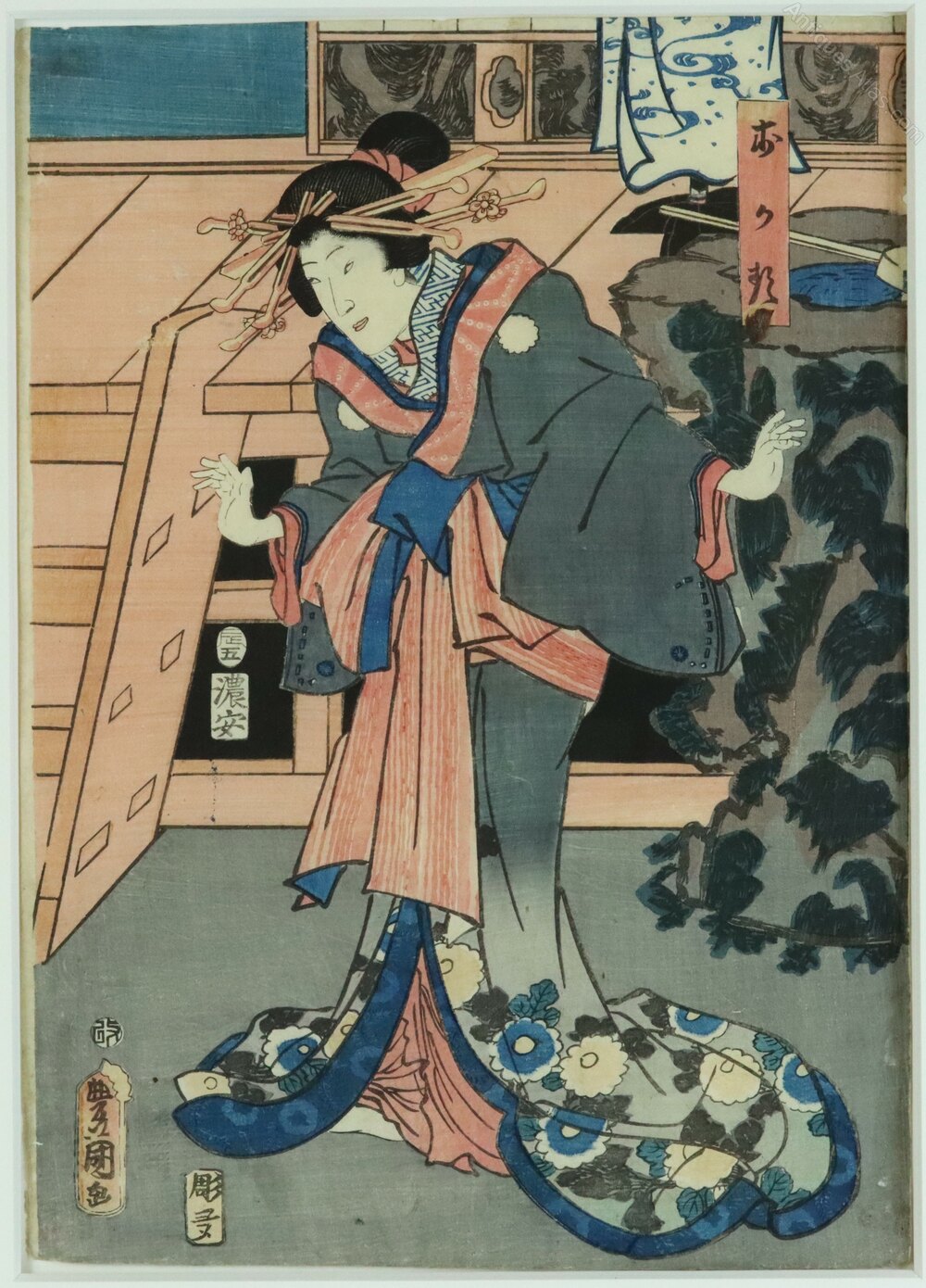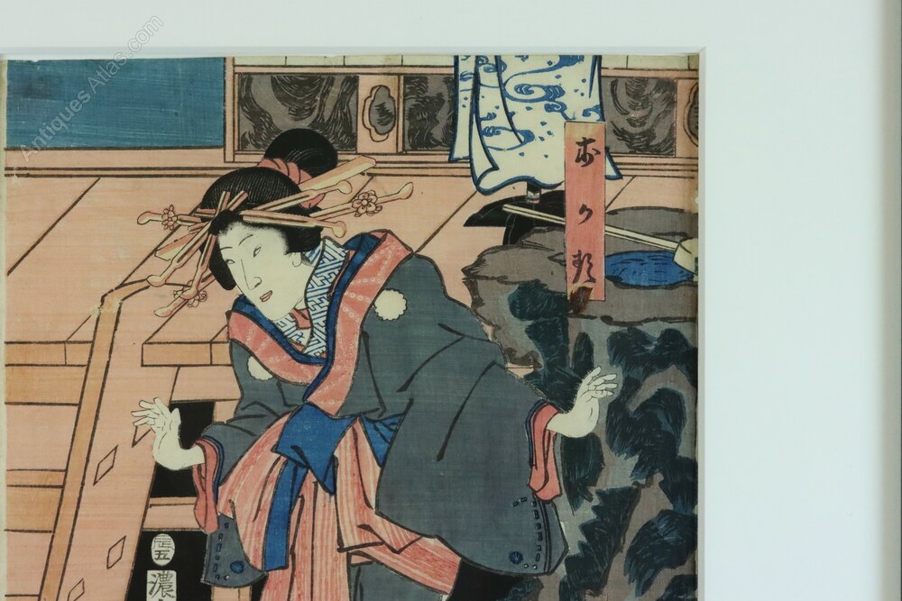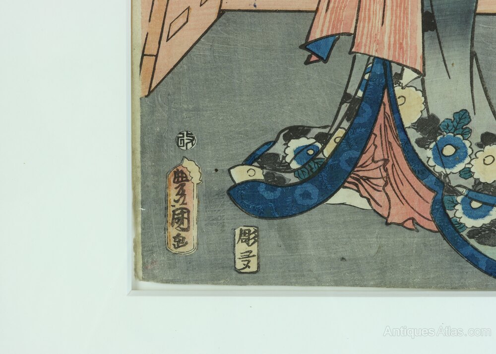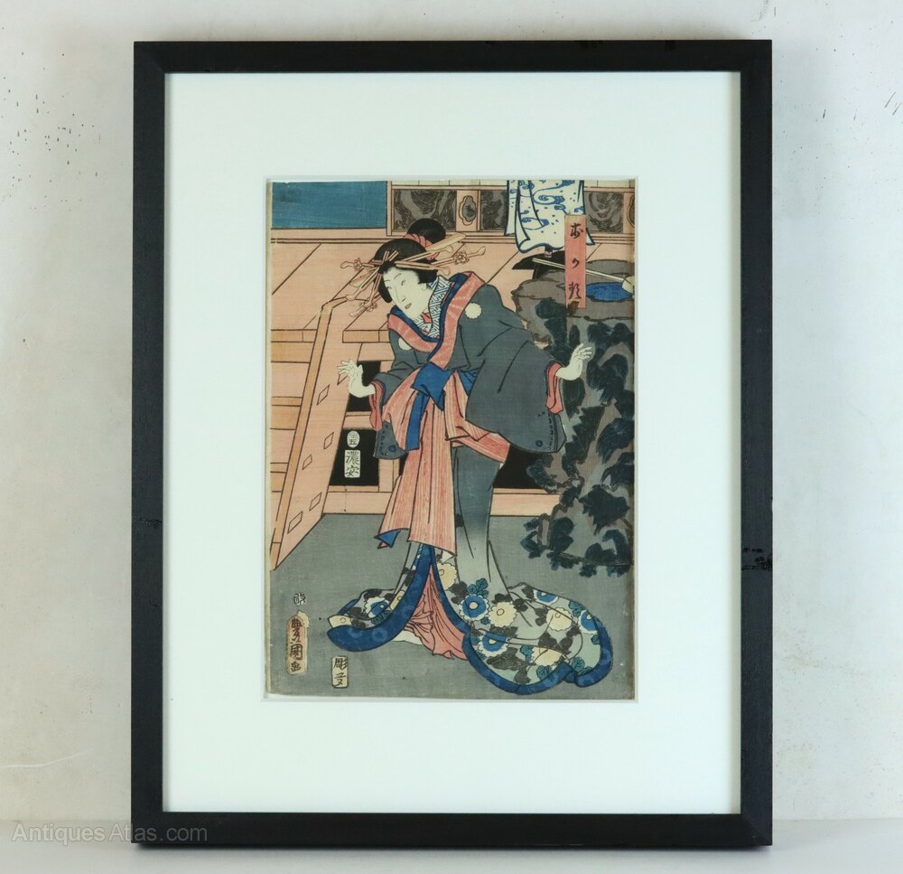 Condition: The print has not been inspected outside its frame but appears to be in very good antique condition with well preserved colours. It is beautifully presented within an ivory mount and black stained wooden frame which is in perfect condition. This print was acquired from the same source as several other original woodblock prints all of which are presented in the same way.
