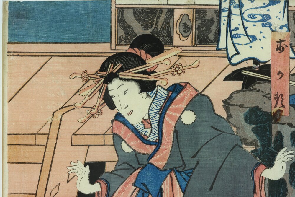 A beautifully framed original Japanese woodblock print of a kabuki actor playing the role of Okaru by Utagawa Kunisada (Toyokuni III, 1786-1865), Edo Period c.1854.A further example of this print is held by the Tokyo Metro Library.