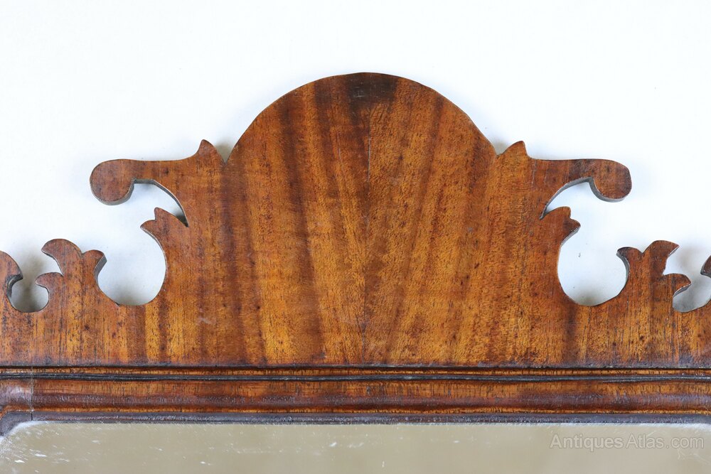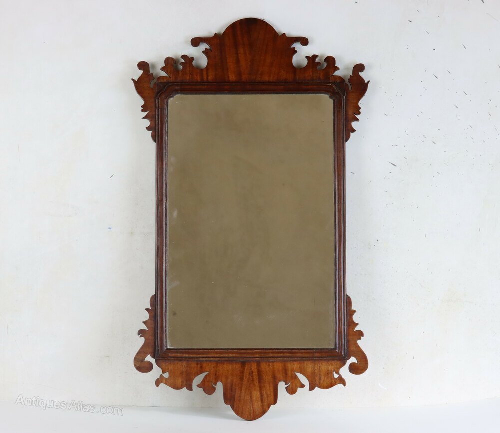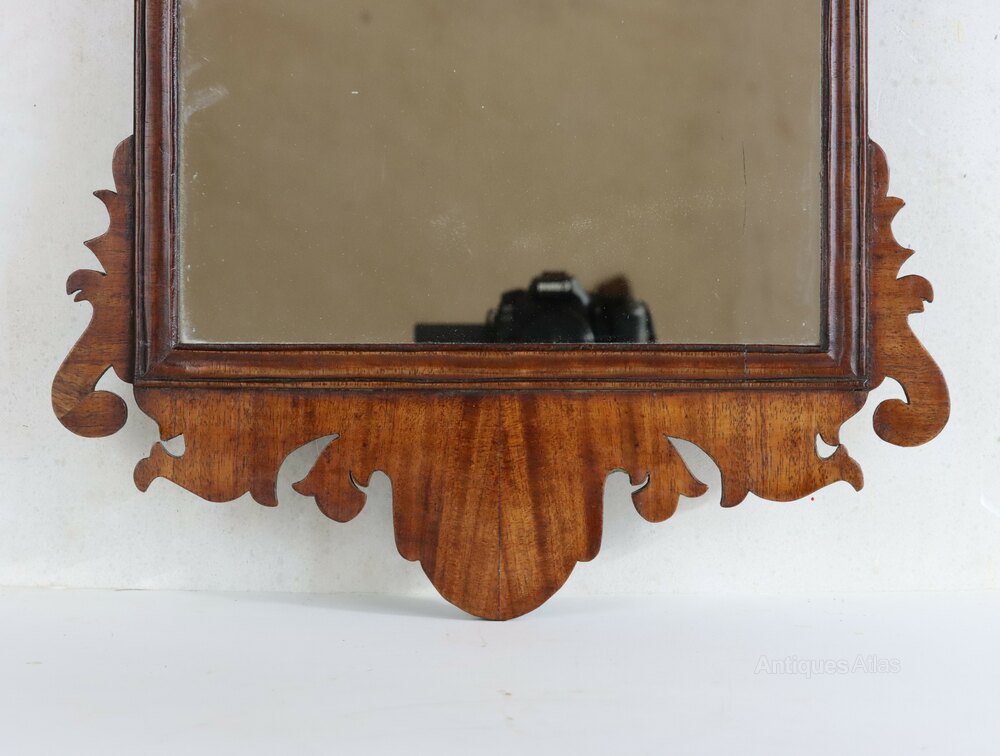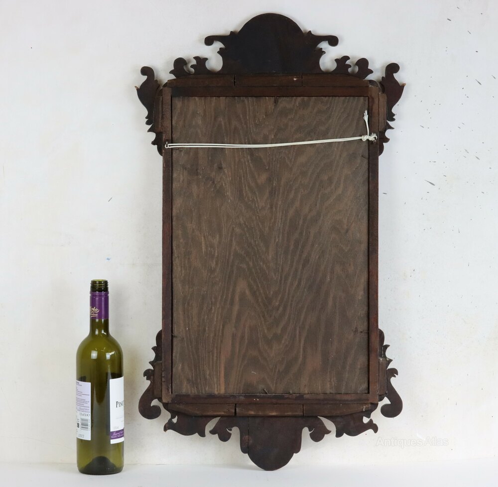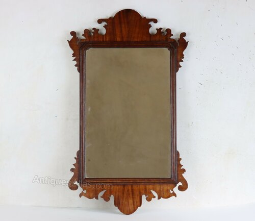An attractive 19th century Chippendale style mahogany fret cut wall mirror in good antique condition. Nice-looking book match mahogany veneers on a pine carcass framing a mirror glass which is probably later.Dimensions: height 71 x width 41 x depth 2.5 cm