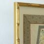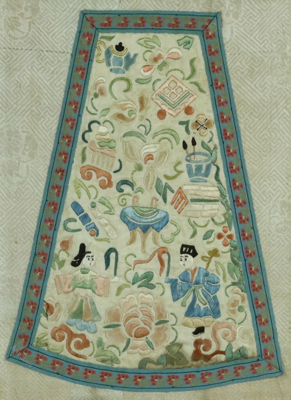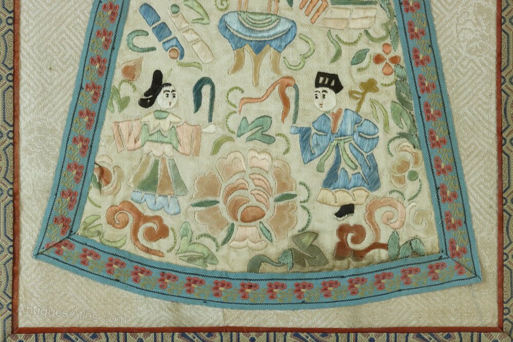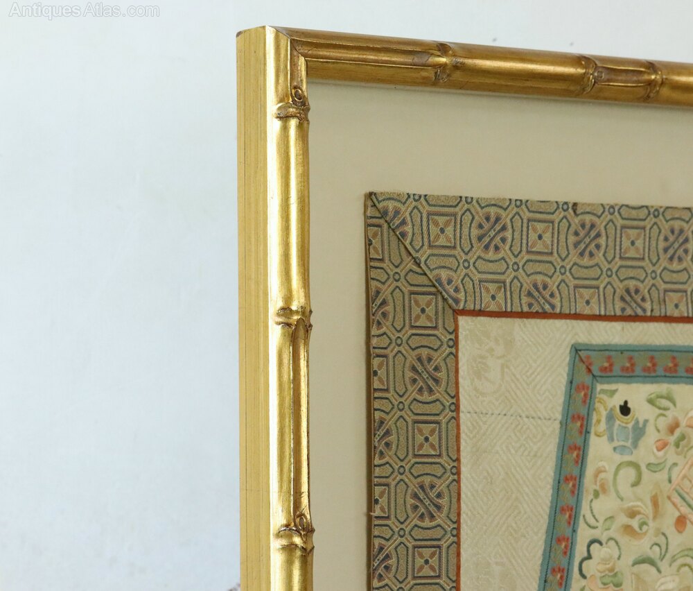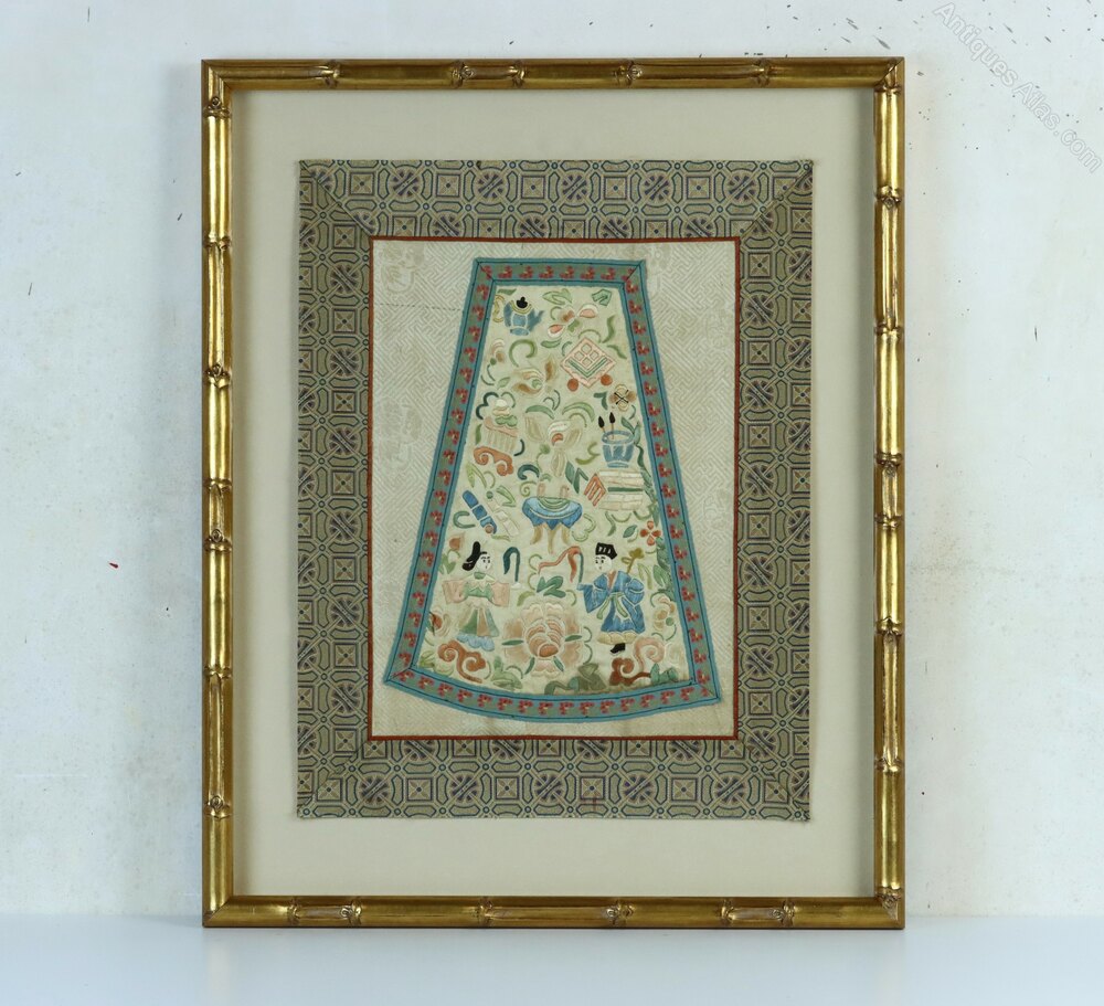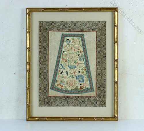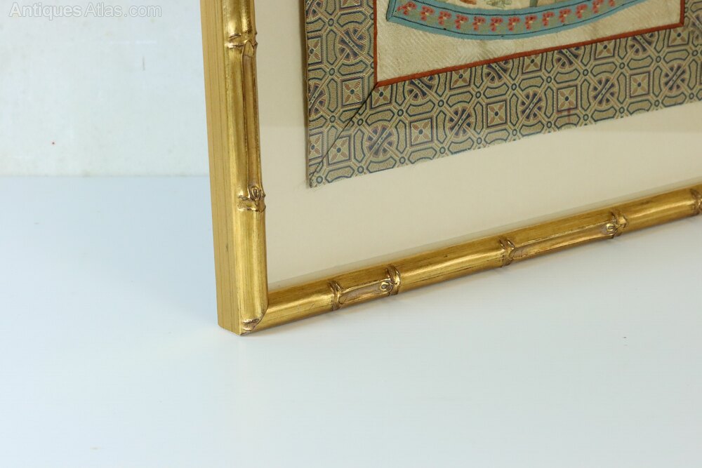 An antique embroidered Chinese silk panel containing two figures, possibly a Emperor & Empress, and other motifs such as a peony, brush pot with brushes and teapot beautifully framed within a gilt faux bamboo wooden frame. The silk panel is believed to be late 19th century but framed and preserved behind conservation glass featuring TruGuard, UV light blocking protection in the last 20 years.Dimensions: Frame - height 47 x Width 38 cm