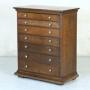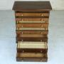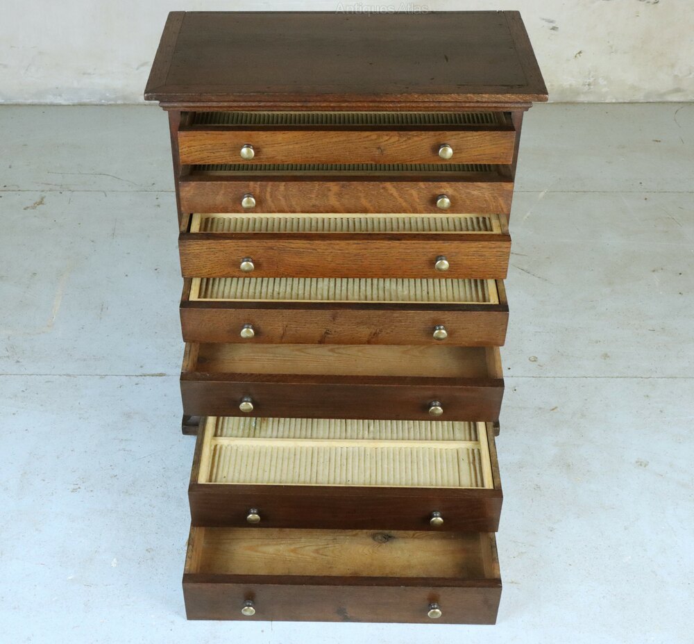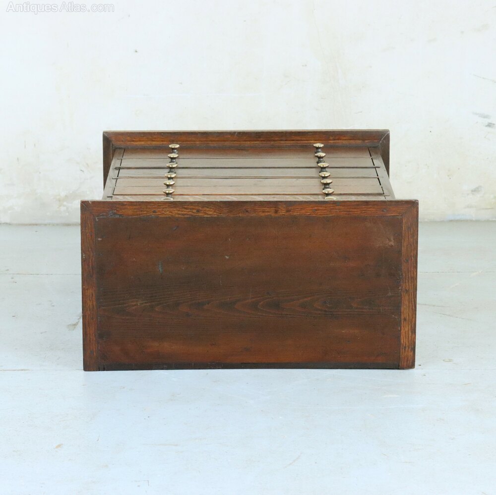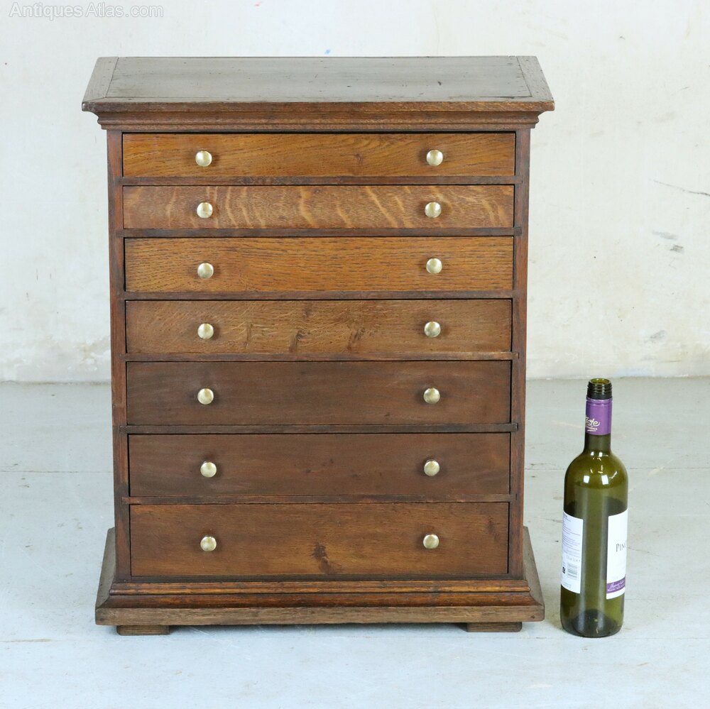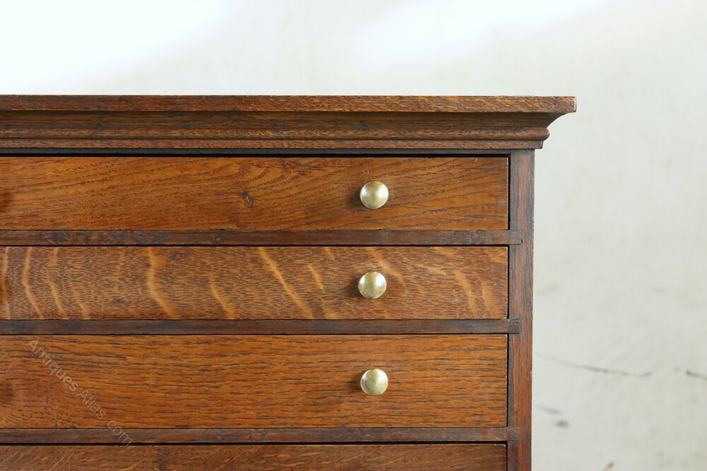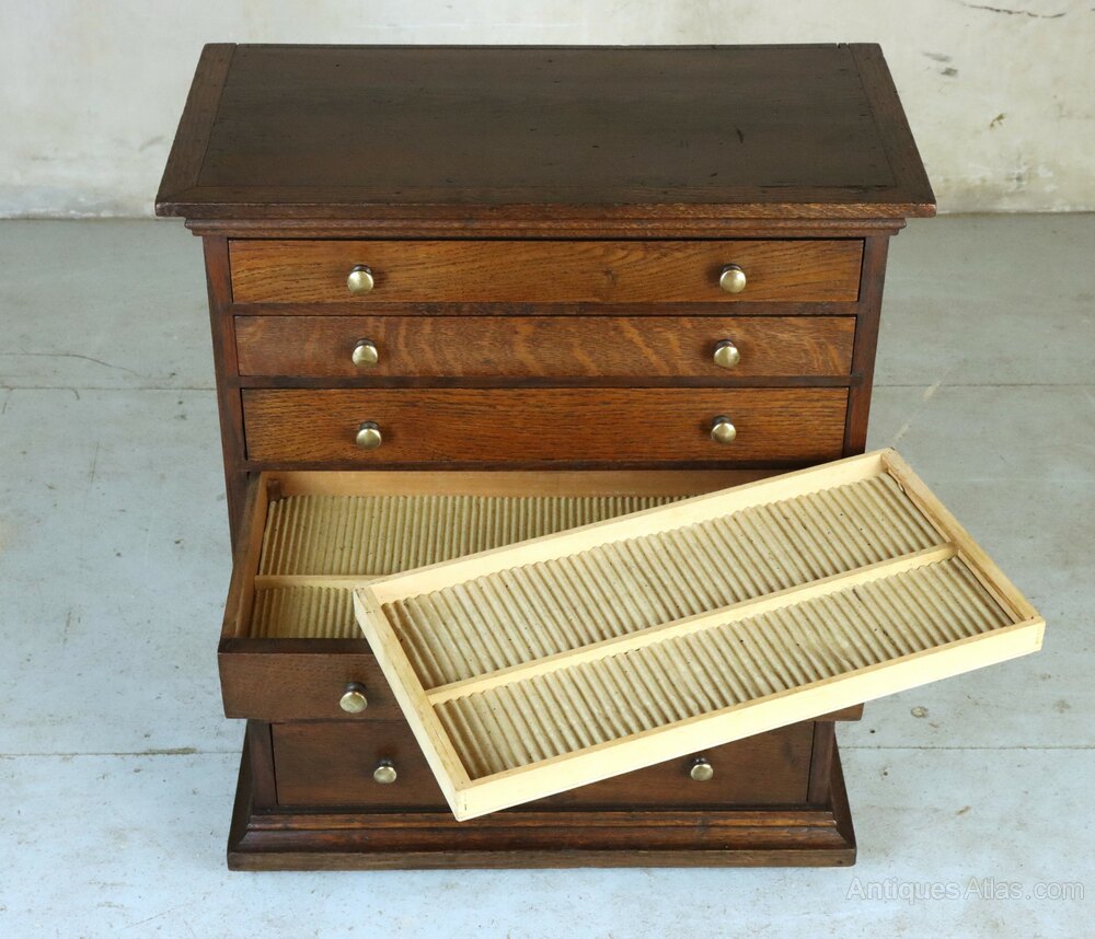A fine quality late 19th century oak collector's cabinet containing seven graduated drawers each with two brass knobs standing on squat square section feet. Five of the drawers are compartmentalised lengthwise with corrugated cardboard lining, and three of these five drawers have compartmentalised lift out trays. Curiously, each drawer front differs in colouring and figuring to the next suggesting that the cabinet may have been made from left over pieces of oak timber. It is, nevertheless, beautifully constructed with precise dovetail joints.This would most likely be used as a floor standing cabinet though it can be located on a sturdy table. It would make a superb jewellery or watch cabinet.