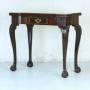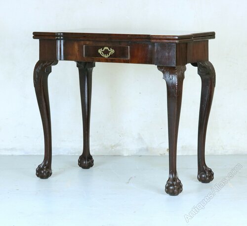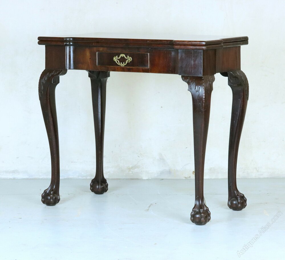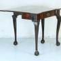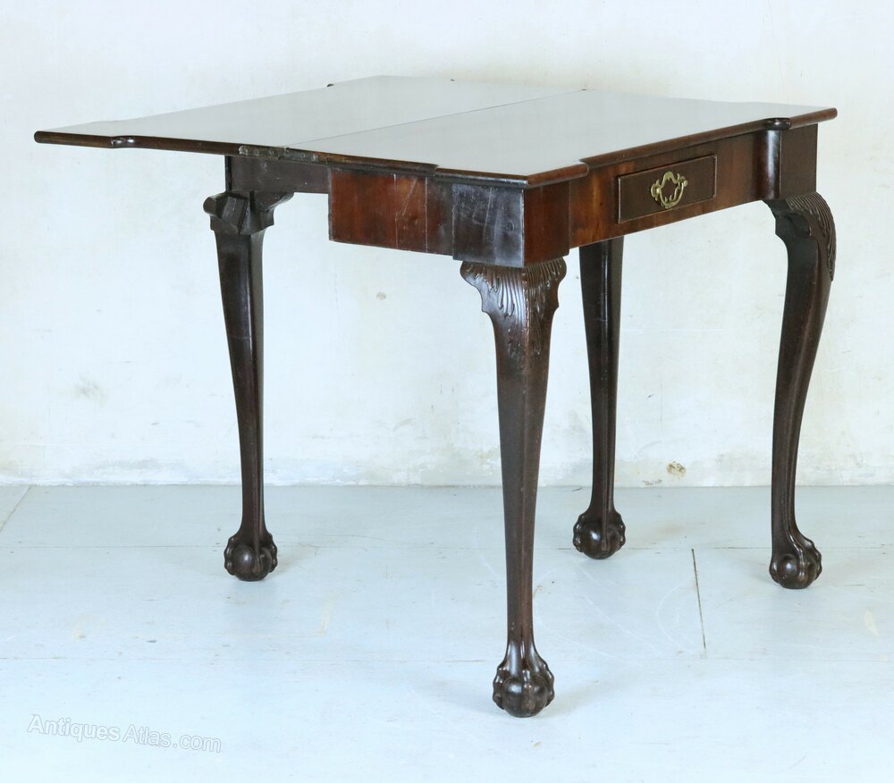 A stunning George II breakfront mahogany tea table in fine original condition, circa 1750. With a top of rectangular form, having a single frieze drawer bearing its original pierced brass handle, it is supported on four cabriole legs carved with acanthus leaves and ending in ball and claw feet.The fold-over top opens up and is supported on a back leg which swings out. Made from dense Cuban mahogany, the carving at the top of the legs is a particularly attractive feature. It would make a lovely side table for a reception room.