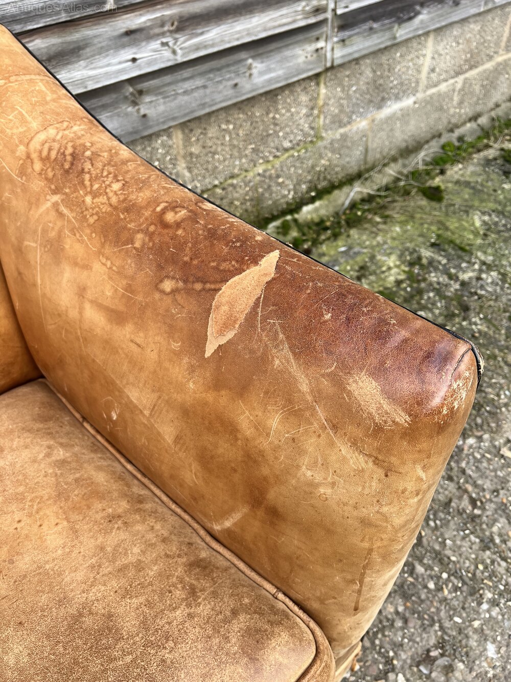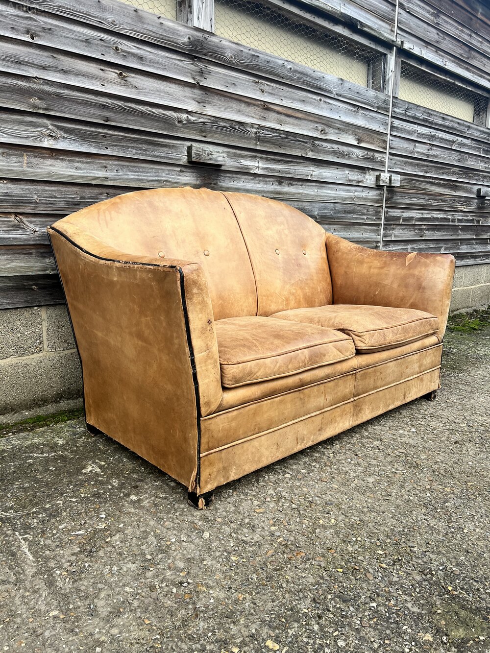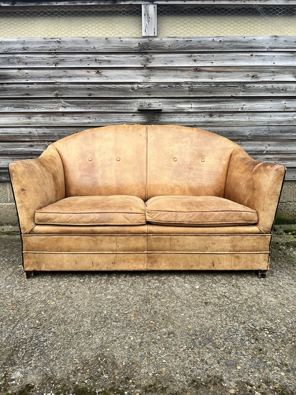 1950’s French Leto seat leather sofa.In “worn in”condition with areas of scuffed and scarred leather.