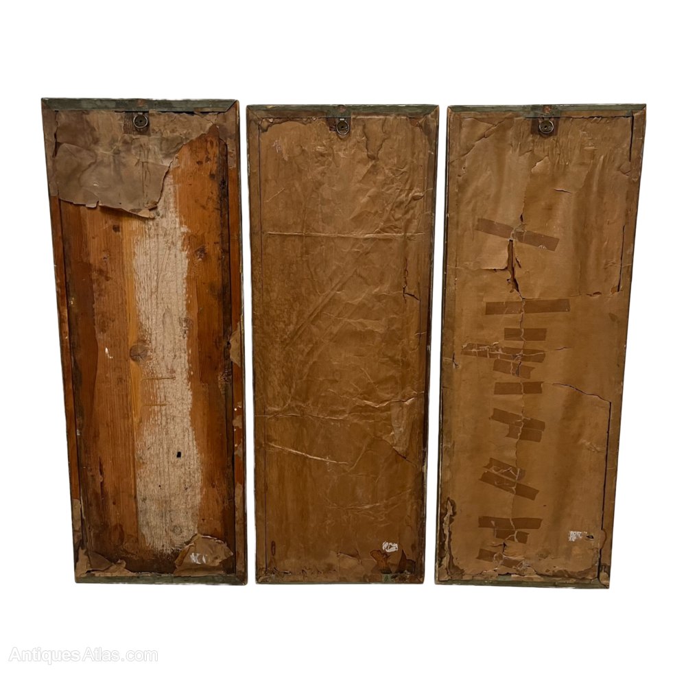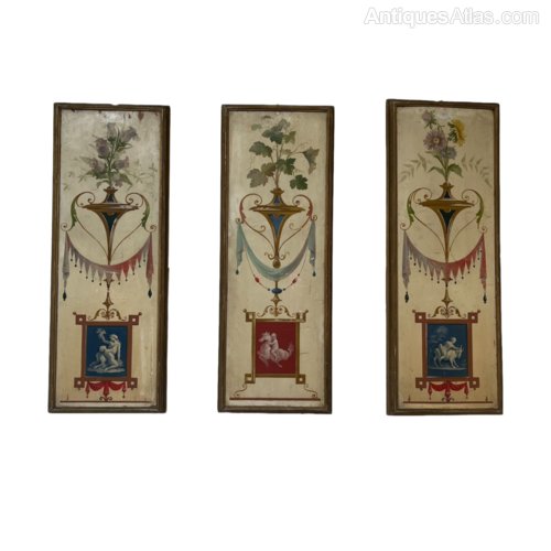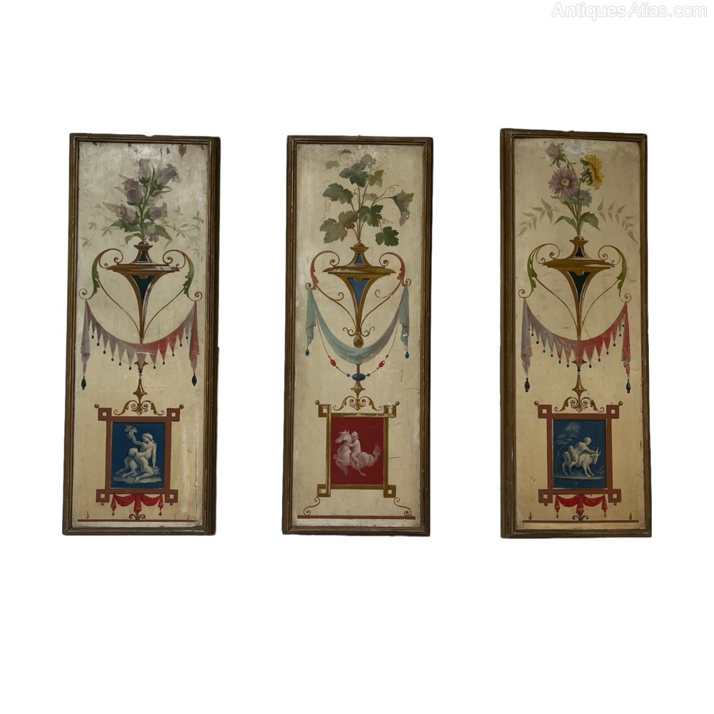 A highly decorative set of 3 19th century French neoclassical paintings on board.Minor typical paint flakes.