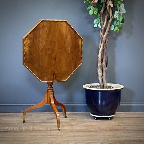 The main table top is octagonal in shape with a small pie crust gallery around the edge. The table top is held secure with a spring loaded lever catch.