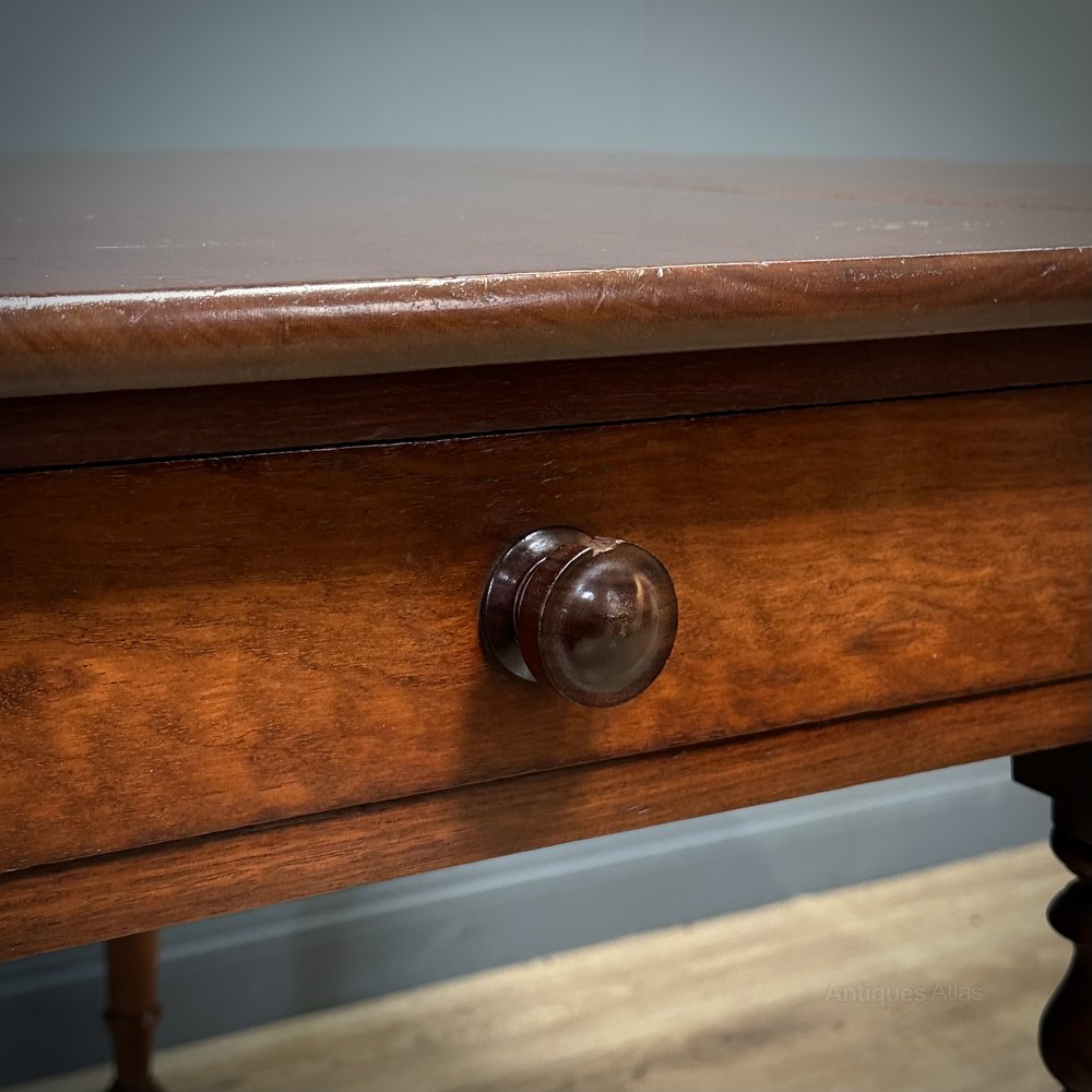 One end of the table has a long deep drawer, the drawer is fitted with a turned handle.