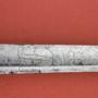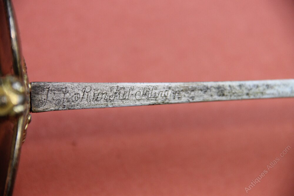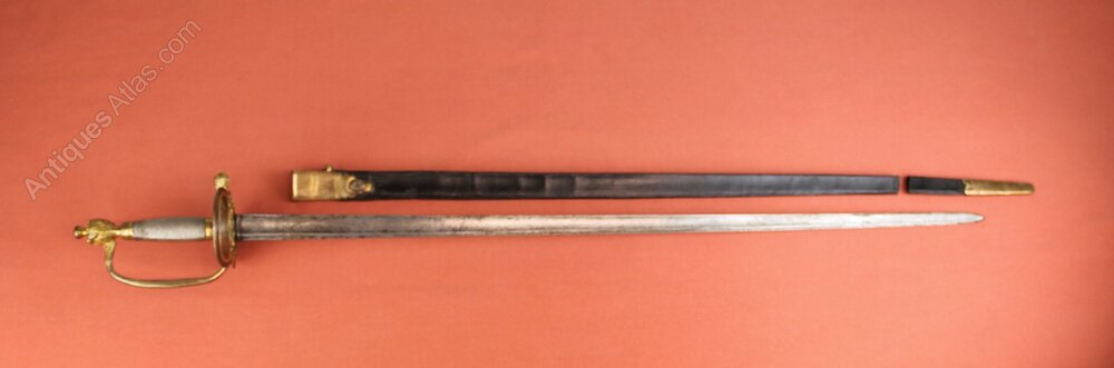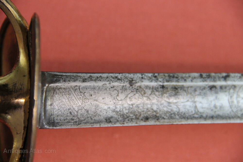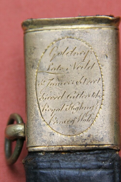 1796 pattern sword in its brass mounted original leather scabbard. Has a gilded brass hilt with silver wire bound grip. Scabbard is engraved as by 'Goldney Late Neild St James St Cutler to his Royal Highness Prince of Wales'. There is an steel, single edged blade which is engraved with GR, Coat of Arms and foliage. Blade is signed on the back strap J Runkel Solingen. There is general wear over overall with rust staining to blade. Leather scabbard is broken approximately 7cm for the end shape.