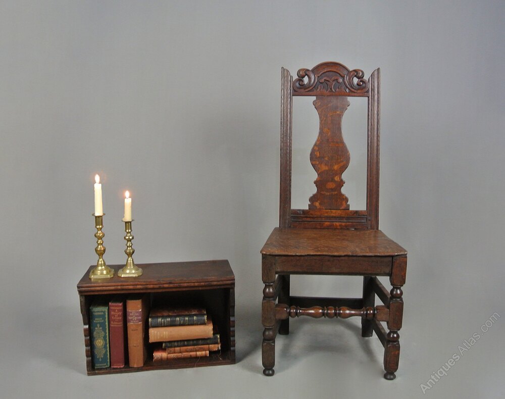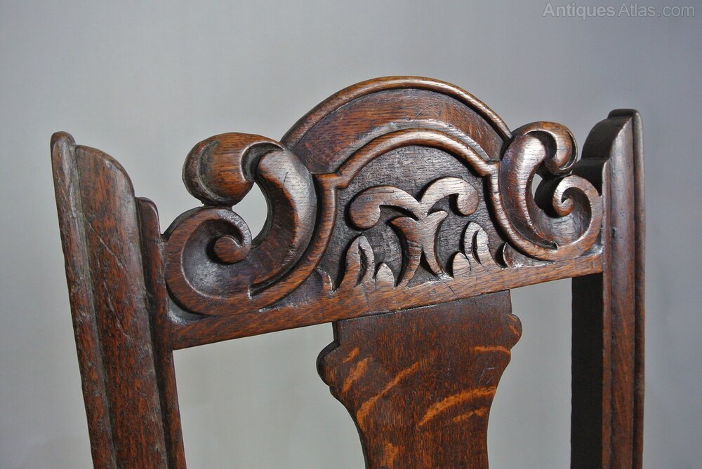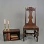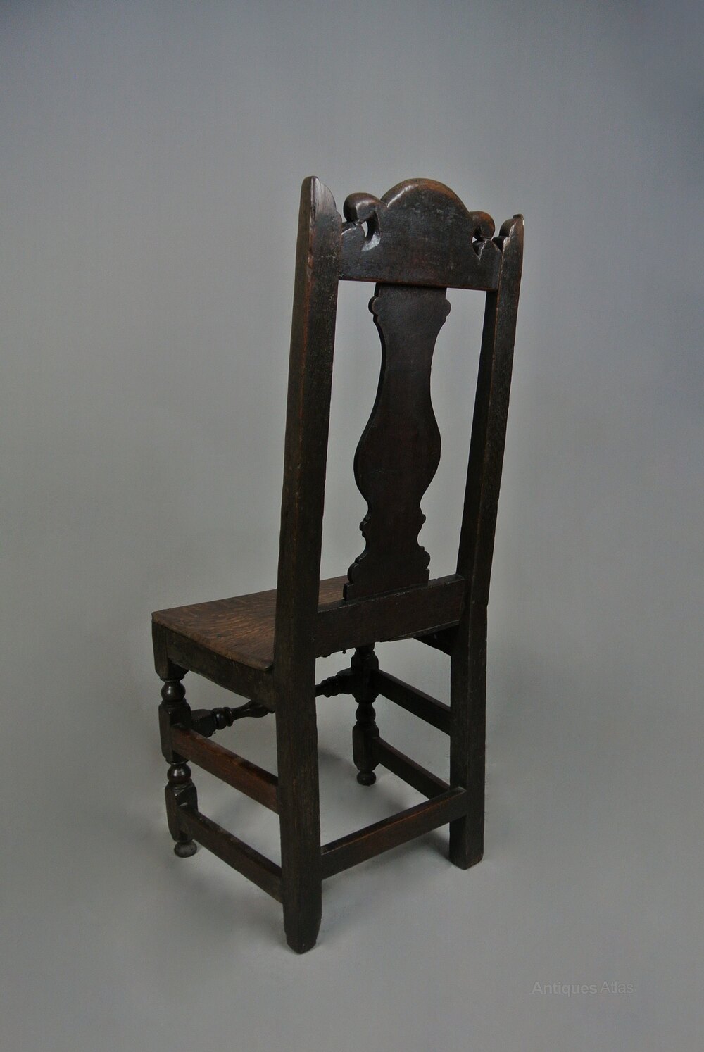 The back legs extend to create the back uprights of the chair and these are attractively carved with ogee forms and channels, the tips stepping gently down to give elegance. The back rail over the seat is channel carved. The joiner and carver were clearly skilled and experienced craftsmen and made a chair that day in the 1670s which has lasted in superior condition and used by generation after generation for around 350 years.