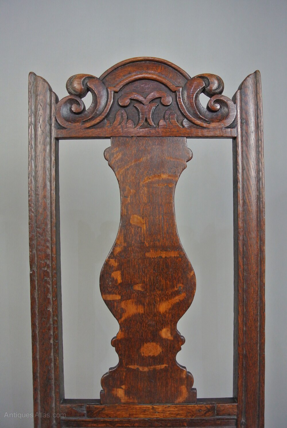 A very good high backed 17th Century oak 'back stool' - peg jointed and solid with original timbers throughout and with a beautifully warm and natural colour. The tall back with a C-scroll carved crest rail with chip carved ground centred by a stylised tulip.