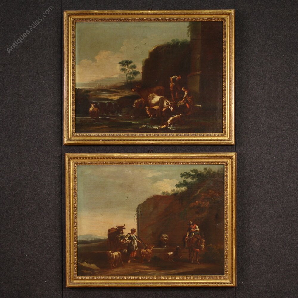 Roman school of the second half of the 17th century. Oil painting on canvas depicting a wonderful pastoral scene with figures and animals at the fountain. In the center of the painting we find a young washerwoman next to some ruins, an ancient fountain from which cows and sheep drink. On the right appears a man riding a splendid donkey while a dog accompanies him. The type of composition, the naturalistic but idealized rendering and the treatment of light recall the Italian landscape painting of the late seventeenth century. Scenic 19th century frame in carved and gilded wood, with some signs of aging. Painting already restored with relining, replacement of the frame and repainting of the color in small spots, overall in good condition. Painting that is part of a pair (see photo and ask for the price of the pair if still available). Interior size H 57.5 x W 76 cm.