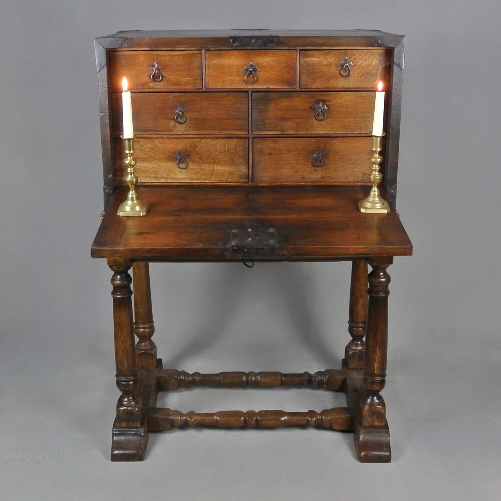 A beautiful and very rarely seen early English example set on a most attractive hand made oak stand with gun barrel turned legs and of pegged construction. The oak of the stand has been very well matched in colour and grain to that of the strong box and the form of the stand is stylistically correct for the early to mid 17th Century but was probably made in the early 19th century. The box would not originally have had a stand and the stand was made after its travelling days were over so that it could sit at a useful, visible height to be enjoyed and used.
