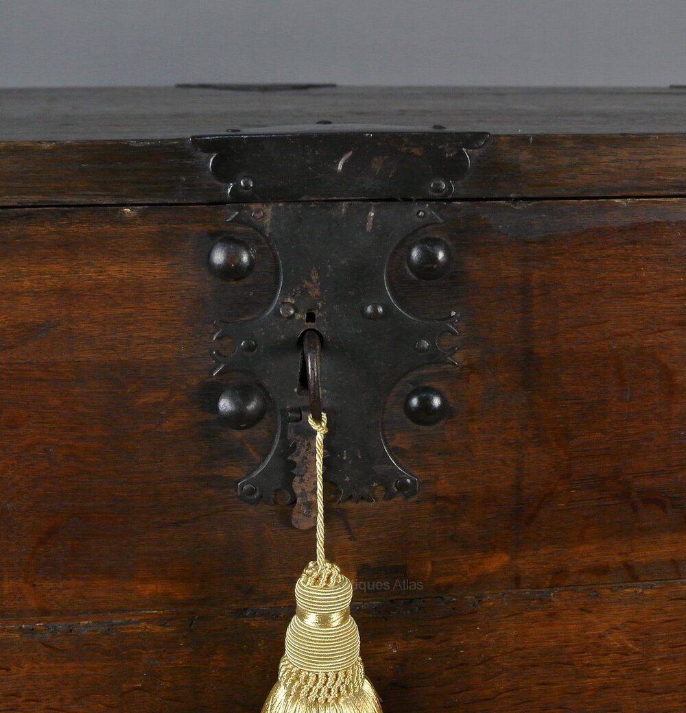 A rare English oak strong box retaining original and elaborately forged iron lock plate and lock with escutcheon cover and with the original working key.