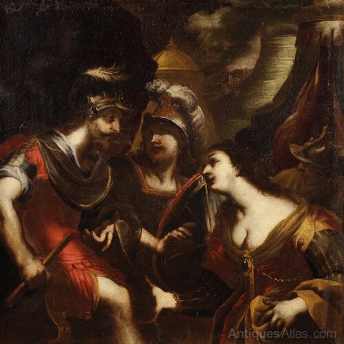 A magnificent 17th-century Italian painting. This artwork oil on canvas depicts a famous episode from the Iliad, the dispute between Agamemnon and Achilles over Briseis. During the Trojan War, the god Apollo had unleashed a plague among the Achaeans because Agamemnon refused to return Chryseis, the daughter of Chryses, the temple priest. To end the plague, the King of Mycenae was forced to return her to the Trojans, but decided to take Briseis, the spoils of war and Achilles' slave, as a consolation prize. The Greek hero, now fond of the girl, was outraged and withdrew from the fight, only returning to the battlefield after the death of Patroclus. On the left, we see Agamemnon with the scepter of command, on the right, the beautiful Briseis, while in the center we find an enraged Achilles.