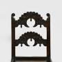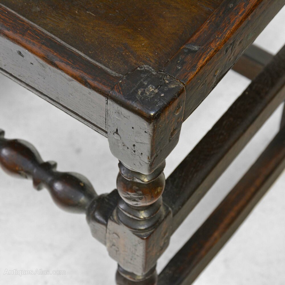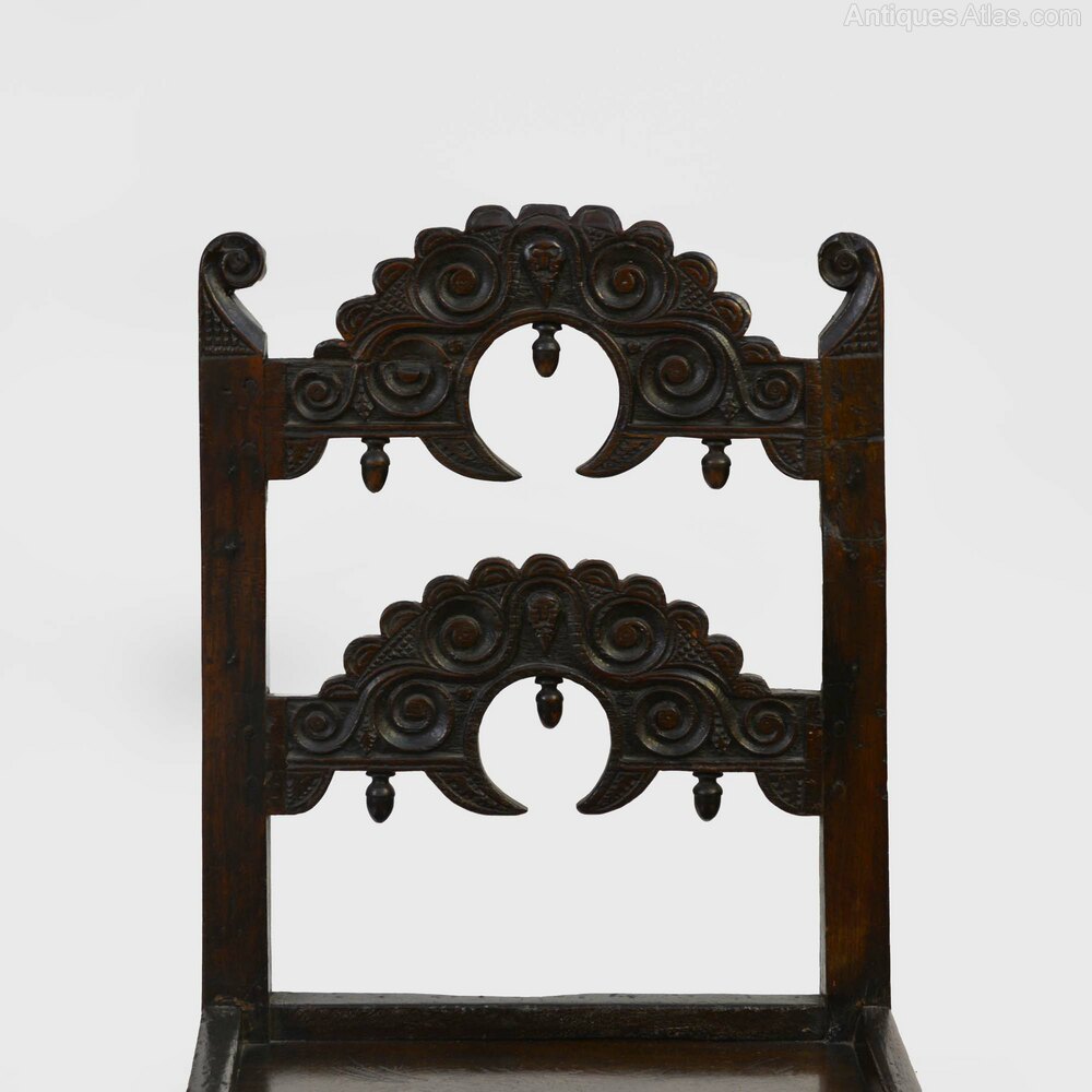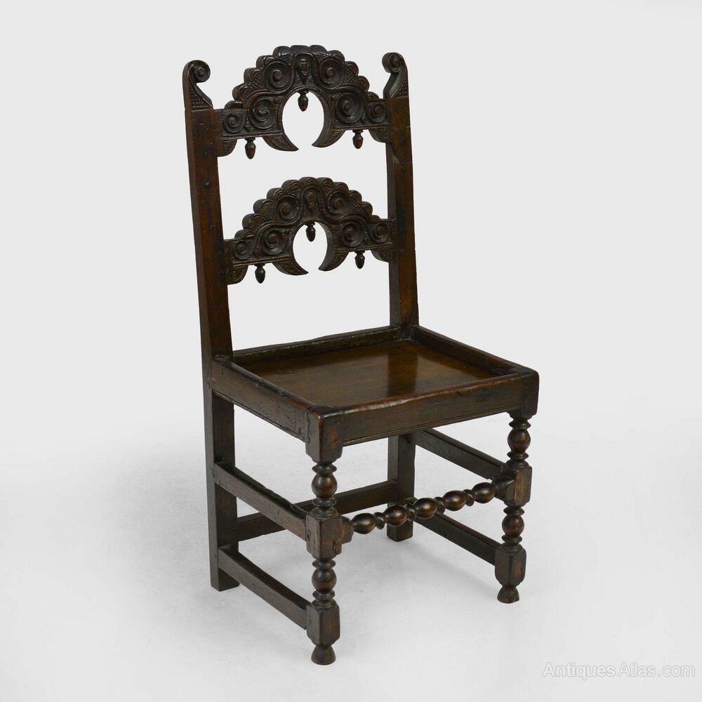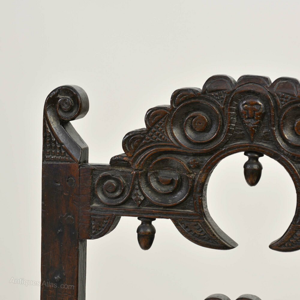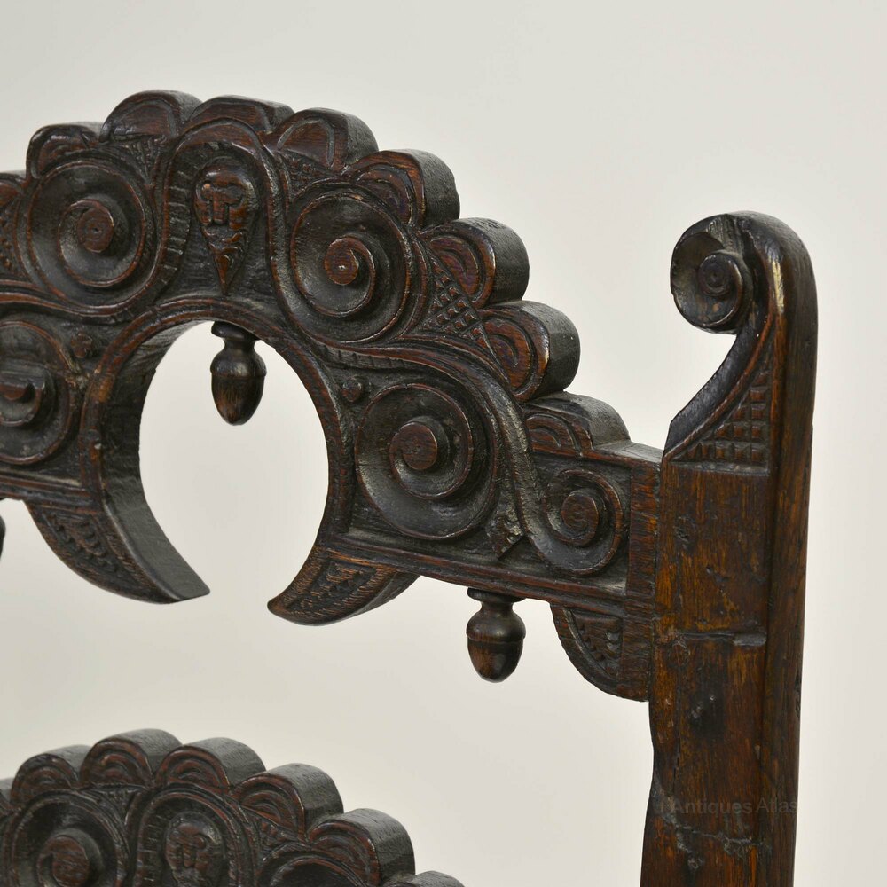 17th century South Yorkshire oak backstool, the two scroll carved arched back each with turned acorn drops, to panelled seat over turned and railed under-frame. By repute, the carved centre of the back rail covertly represents the head of Charles 1, and the acorn the oak tree in which he hid after the battle of Worcester. These emblems showed the owner’s support for the Crown and the Royalist Cause.