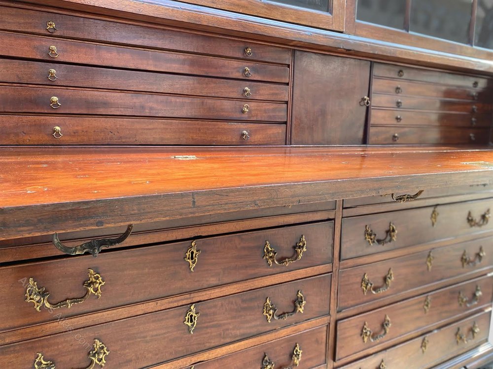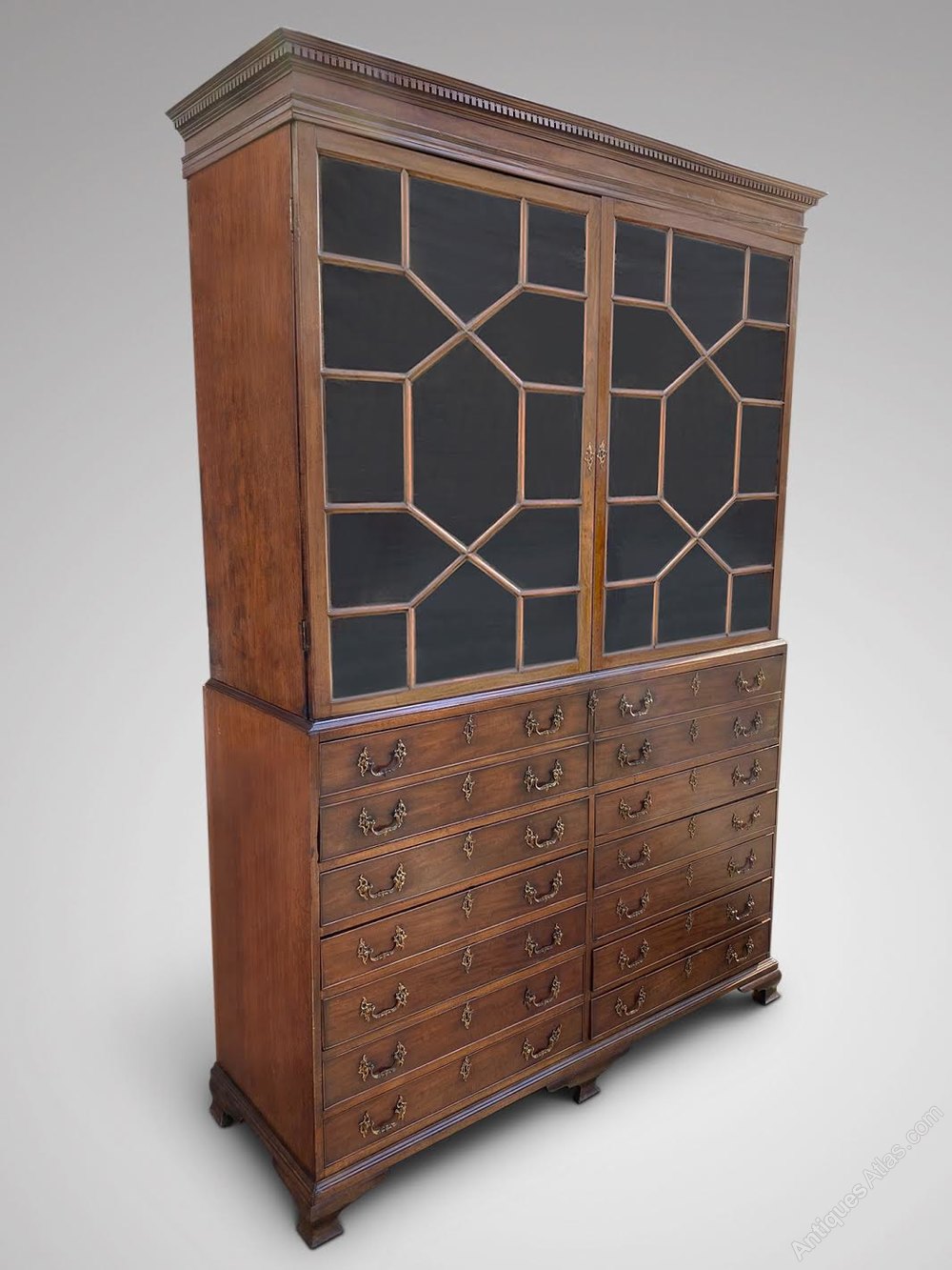 A stunning 18th century, George III period mahogany secretaire bookcase . Well proportioned mahogany bookcase with glazed 2-door cabinet over a set of 14 oak lined drawers base with a fitted fall-front secretaire writing drawer, raised on the original ogee bracket feet. The well fitted secretaire writing drawer with multiple interior drawers and door. The glazed bookcase top fitted with 2 compartments each with three adjustable bookshelves. Superb piece of furniture dating from 1780.