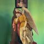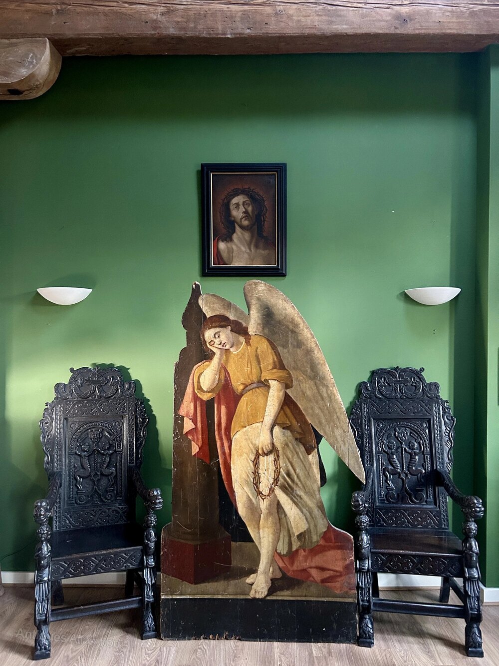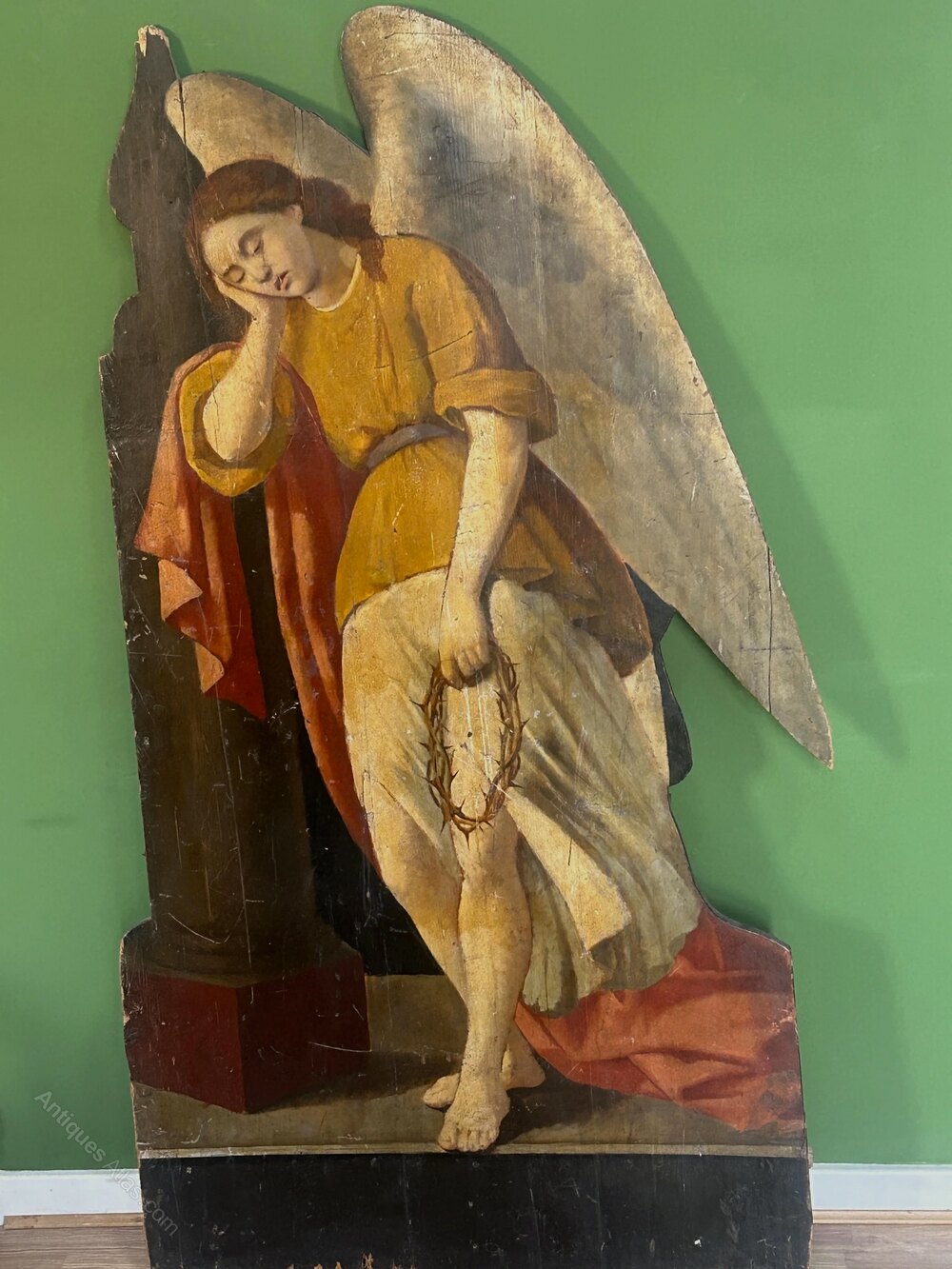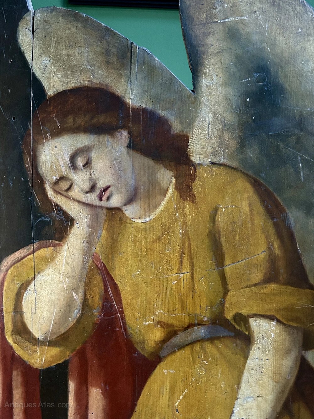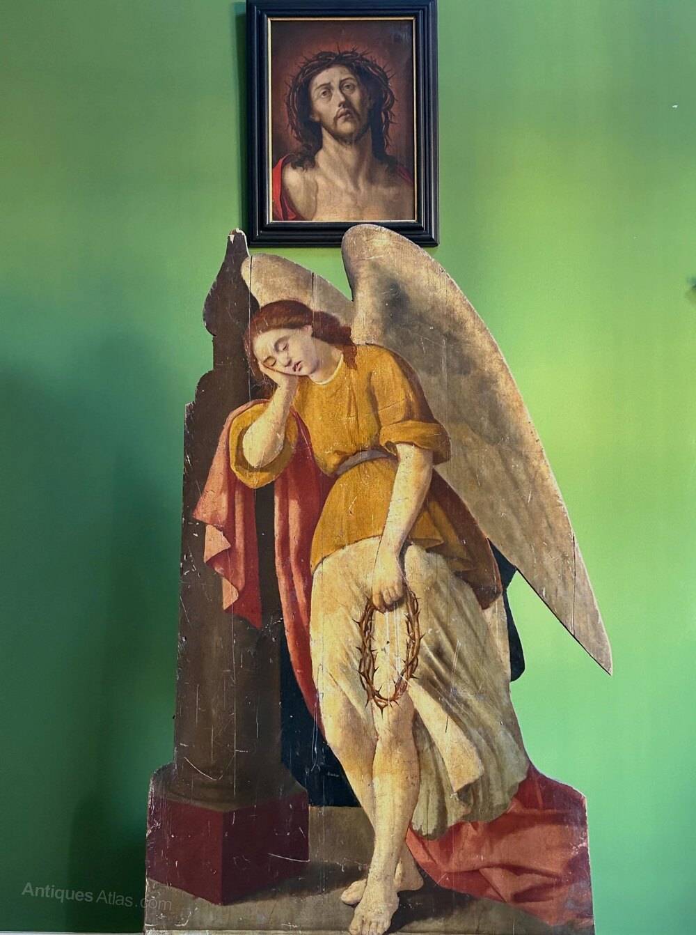 Rare life size 18th - 19th Century religious oil painting on carved pinewood panel of a Holy Sepulchre ‘Mourning Angel holding a Crown of Thorns’.