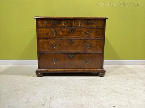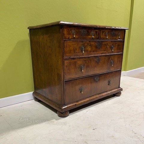 18th century walnut inlaid and banded chest of two small and three long drawers with brass drop handles, standing on bun feet