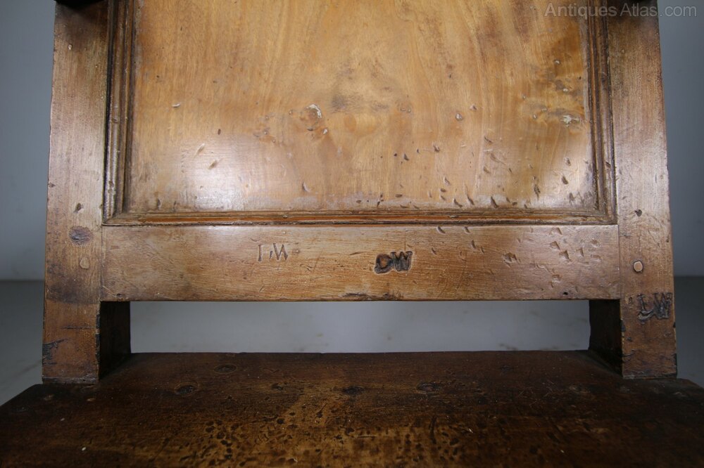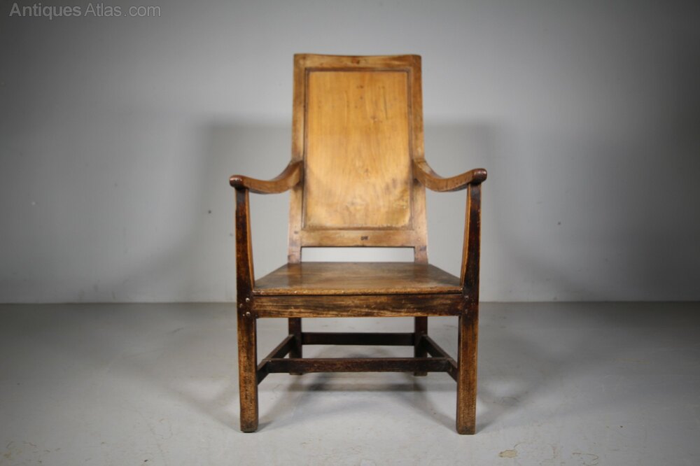 This is a fabulous Georgian, large scale antique country open armchair that is in a fantastic original paint finish and branded with ownership initials. Very well made in solid elm and fruit woods, this Georgian antique armchair has a generous rake to the panelled back rest. All traditional pegged construction, a lovely armchair to gently drift off to sleep in by the fire. Wonderful colour, condition and scale. English and dating to around 1760.