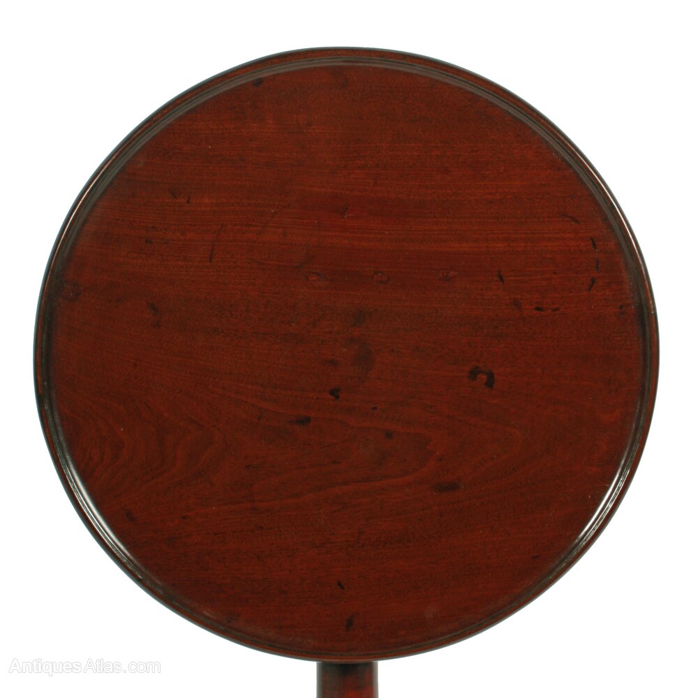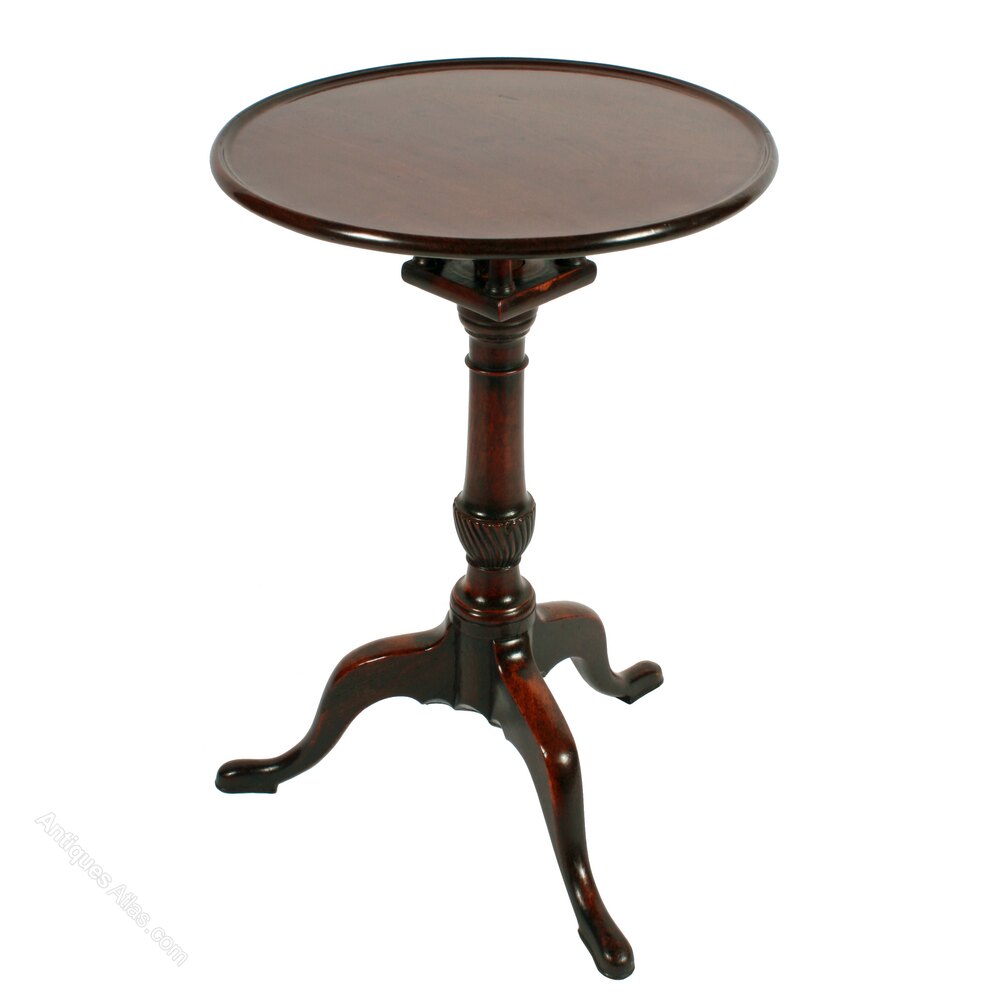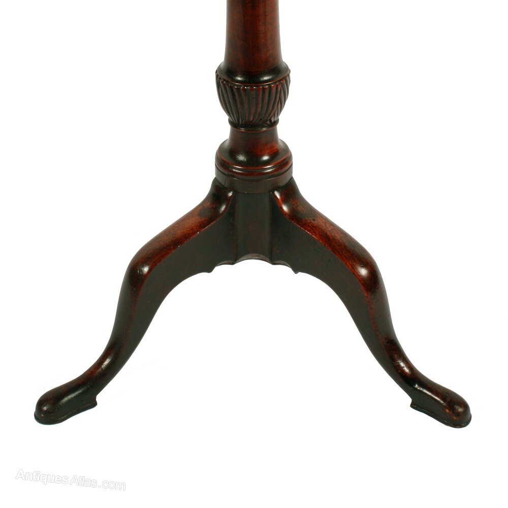 The not quite symmetrical tripod base has three cabriole shaped legs and a turned stalk with a fluted urn athe the bottom.