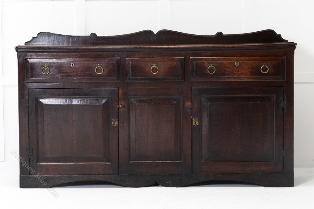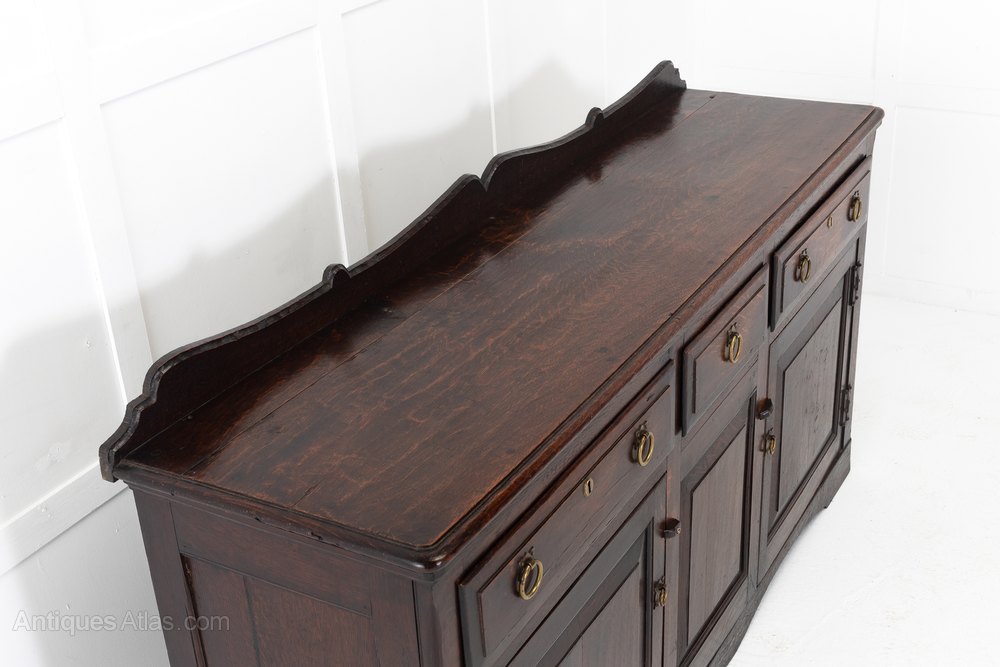 18th Century English George III oak dresser base with shaped gallery back. Having three drawers across the top with brass ring pull handles and escutcheons. The full cupboard below the drawers has panelled cupboard doors at each end to access the storage and shelf from either side. Raised on a shaped plinth base. Wonderful colour.