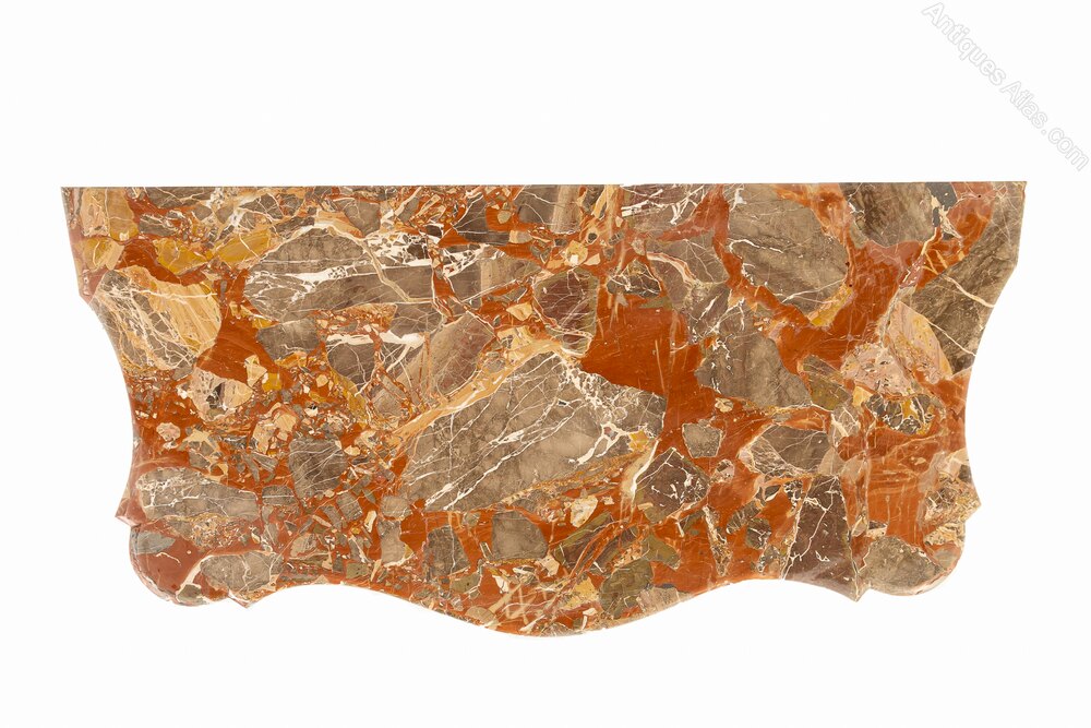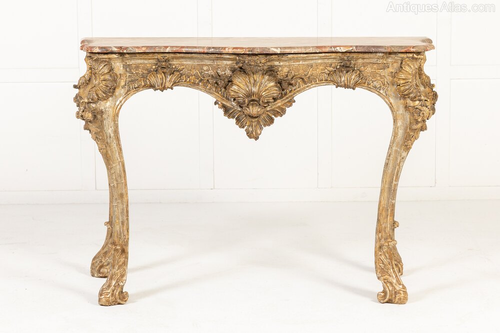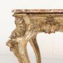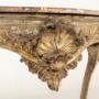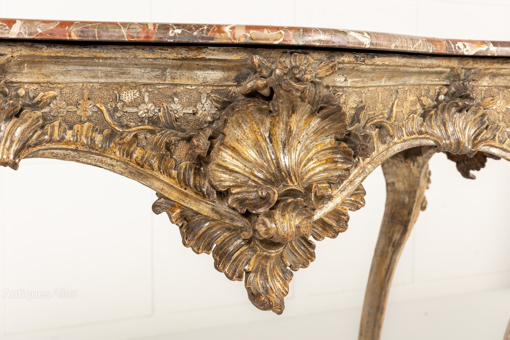 This piece is a fine example of rococo period design, the table frame being serpentine on every side. The marble is also particularly well figured. The table frame is ornamented with shells on the incurved knees and in the centre of the frieze with additional leafy, naturalistic decoration. All of this detailing is very well carved. The ground of the frieze includes a lot of textured detailing in the gesso preparation which has survived in excellent condition. The table is finished in the trademark Italian silver gilt - an attractive mixture of silvering and gilding. This finish has an excellent colour and patination.