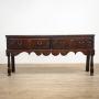 A handsome 18th century oak dresser base, this has two drawers and will make a great storage piece for an entrance hall or reception room. The oak has a deep colour and a good patina and has been carved at the corners of the drawer fronts with quadrant shapes and there is a shaped apron and turned front legs. A great early piece of British oak antique furniture which will fit well with a traditional interior, but will also complement a modern home as a statement piece.