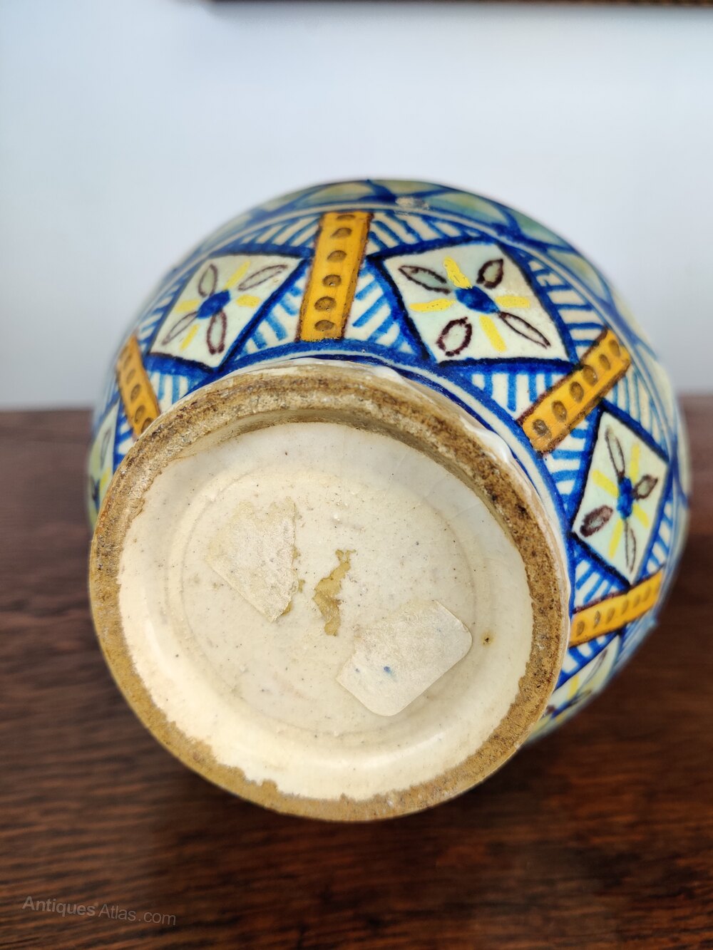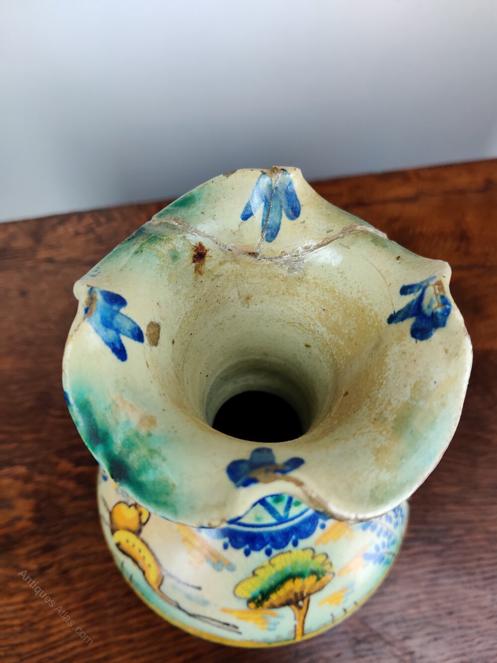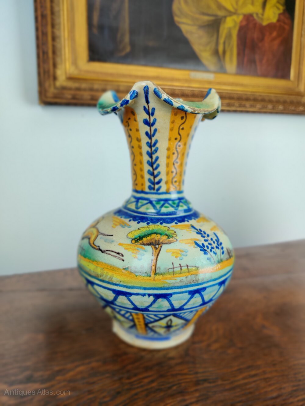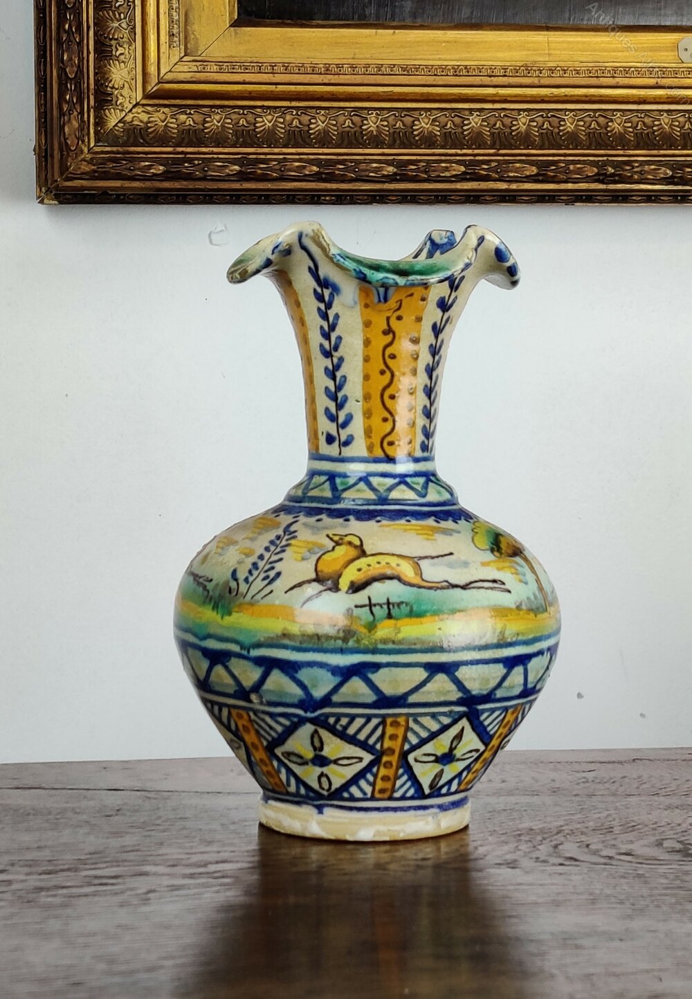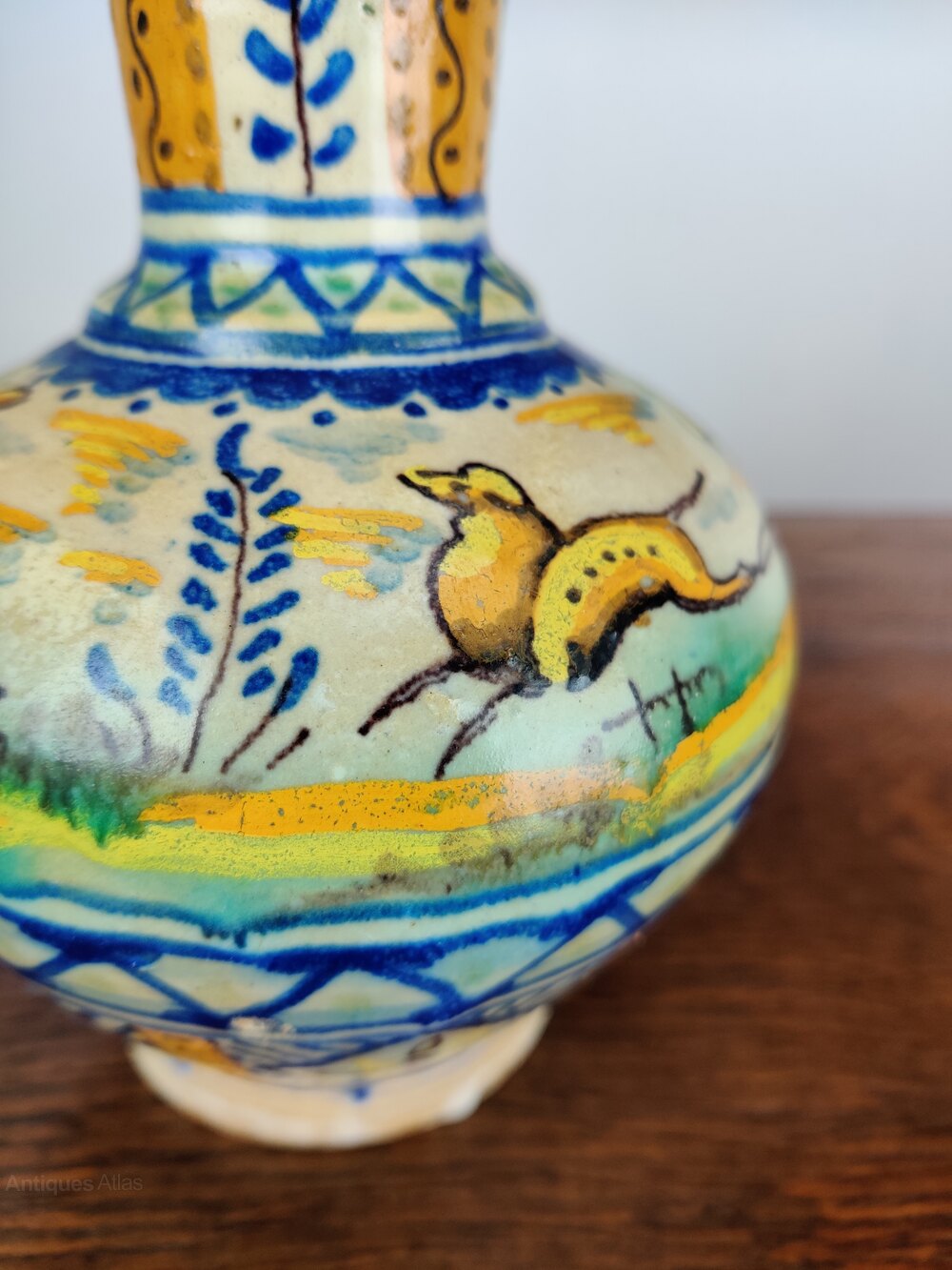 A beautiful pottery vase depicting hare coursing, in polychrome colours on tin-glaze (possibly Spanish).