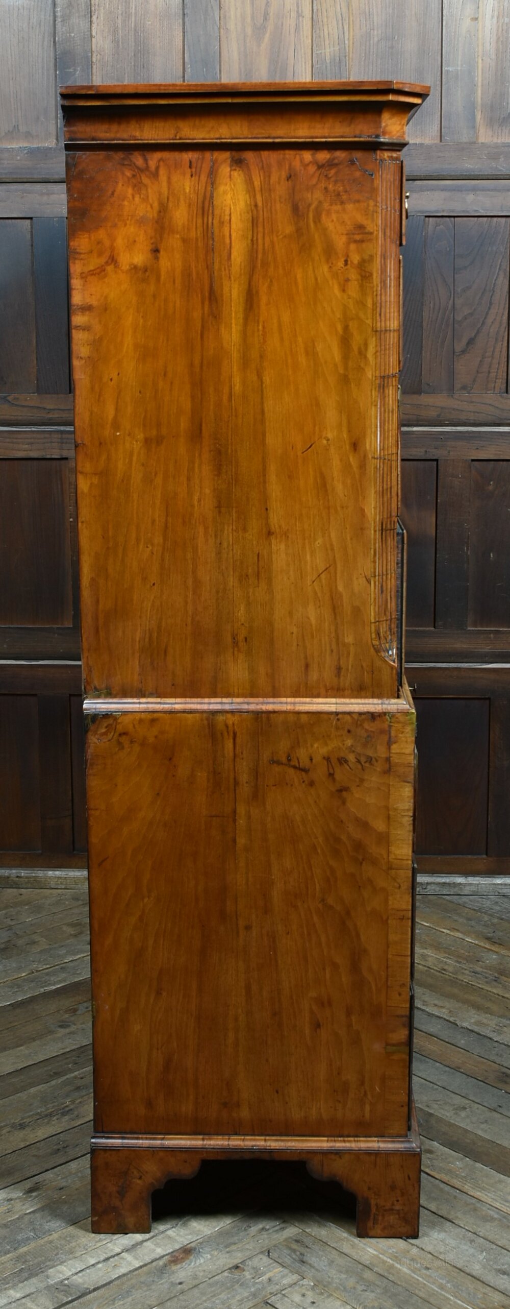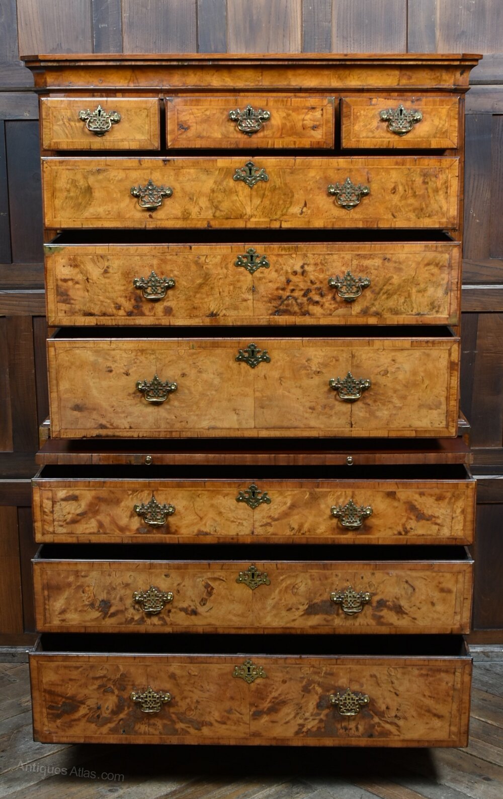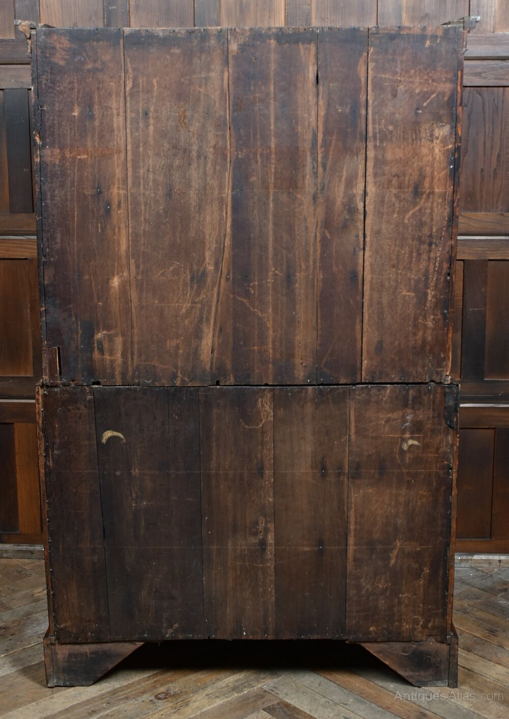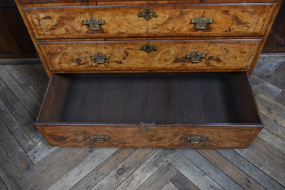 A fine 18th-century walnut chest-on-chest in excellent antique condition. This handsome piece separates into two sections, making it practical to move and position within the home. The upper section comprises three small drawers above three graduated drawers, while the lower section offers a further three graduated drawers, all raised on sturdy bracket feet. Each drawer is crafted with dovetail joints and fitted with decorative brass handles and escutcheons, reflecting the quality of its period construction. As with all genuine antiques, there are minor imperfections, but these only enhance the character and authenticity of the piece. With its rich colouring, beautiful grain, and generous storage capacity, this chest-on-chest is a striking example of 18th-century craftsmanship—combining elegance, utility, and history in one timeless design.