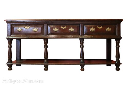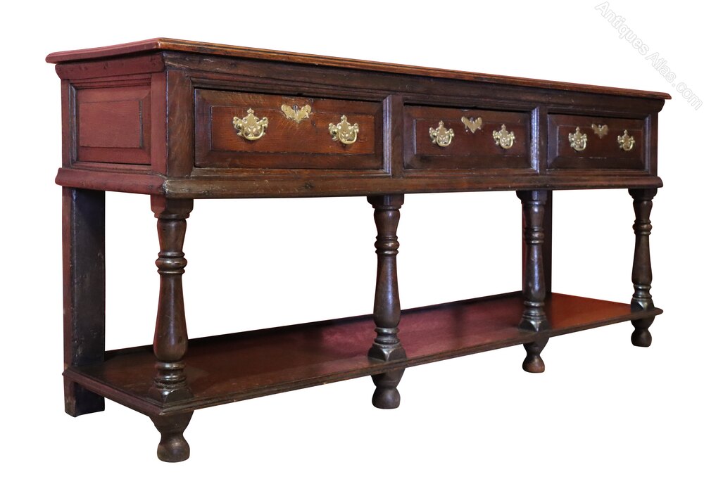 An 18thc oak 3 drawer pot board dresser, with turned supports to the front and full depth pot board base below